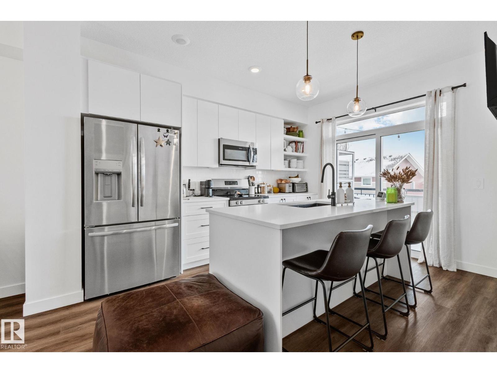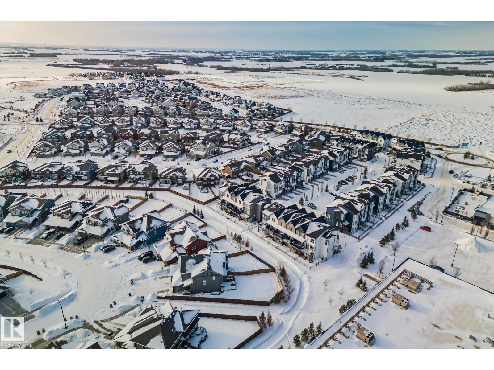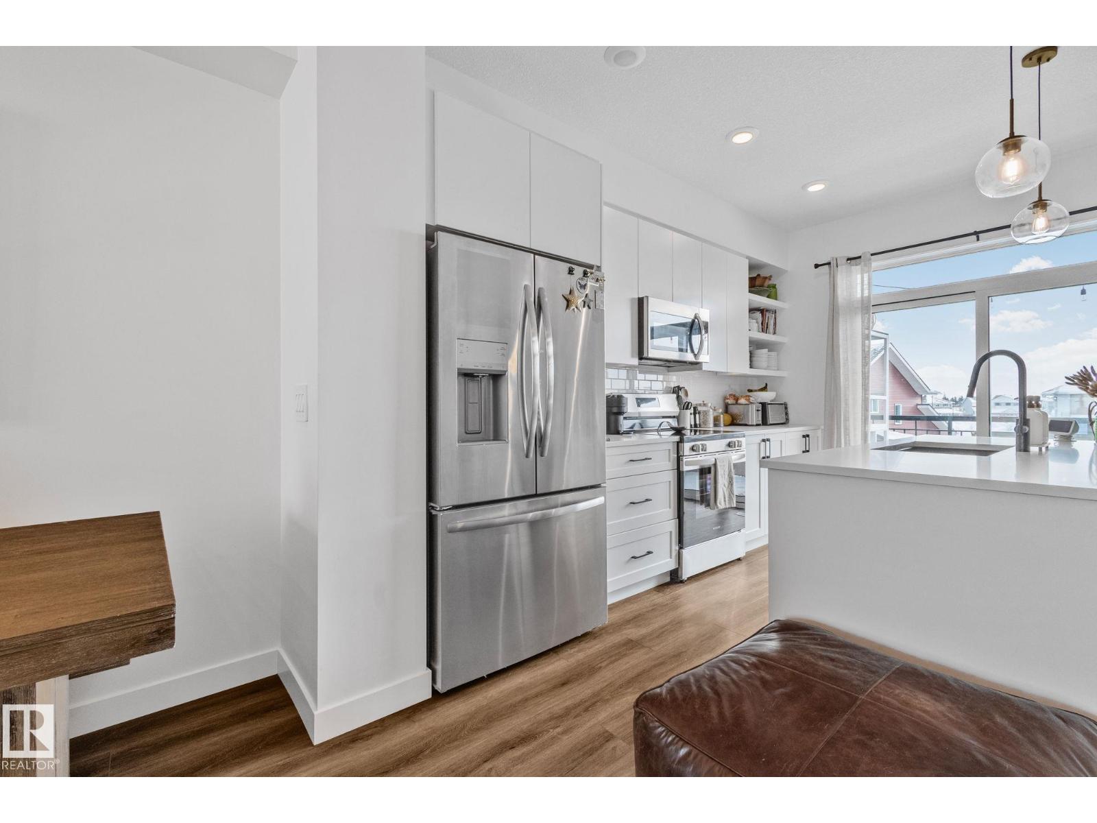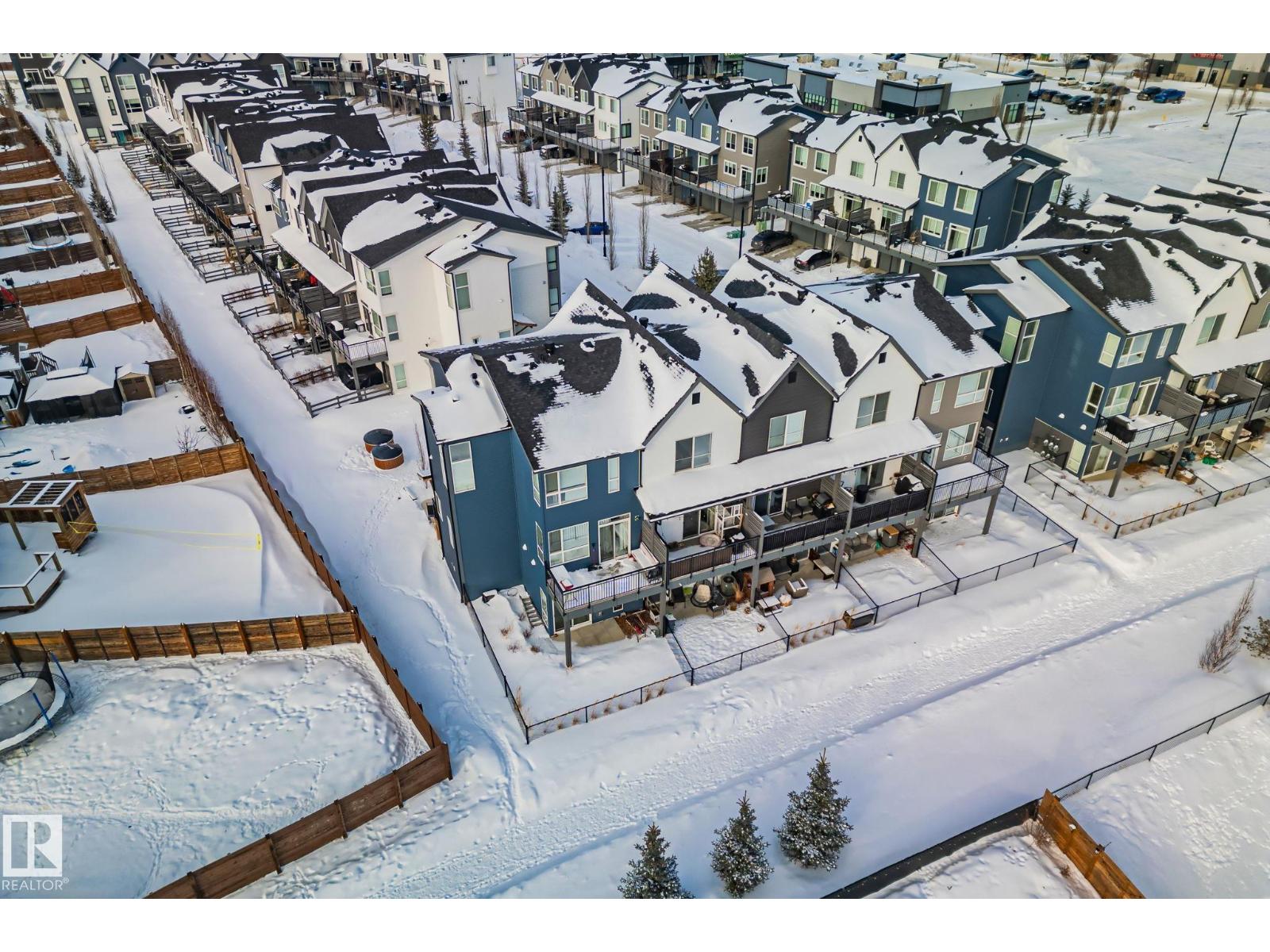 This beautifully upgraded 3-level townhouse is ideally positioned second from the end unit and tucked away at the back of Cobalt Beach, offering extra privacy and a serene setting as it backs onto green space. The open-concept main floor features a bright kitchen, dining area, and living room centered around a custom-mantel fireplace with built-in shelving. A convenient 2-piece bathroom completes the level. Upstairs, you'll find two spacious primary ensuites, each designed with floating counters, quartz surfaces, upgraded black-and-gold hardware, and tiled showers—one with a tub/shower combo. A laundry closet adds everyday convenience. The ground floor includes a separate-entrance bedroom and a full 3-piece bathroom (with a heated floor) for guests or extended family. Additional upgrades include quartz throughout, designer lighting, and air conditioning. As part of the HOA, residents enjoy access to Jubilation Beach, creating a perfect blend of comfort, style, and lifestyle amenities. (id:63190)