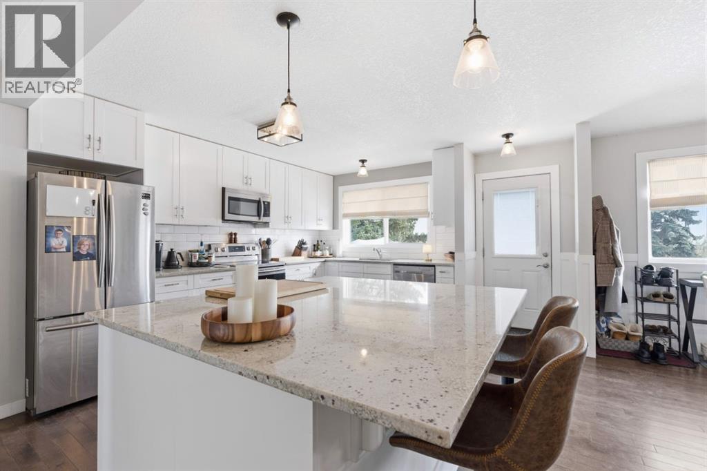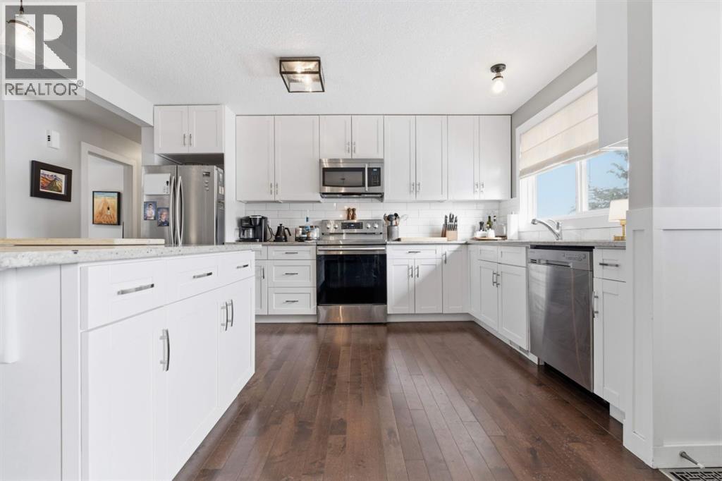 This stunning Silver Springs beauty is is the one you have been waiting for. Absolutely move-in ready! With its great curb appeal, fully renovated and meticulously maintained interior, this "stop the car" home is ready for its new owners. A surprise awaits you once you enter the main level and view the large, granite-topped island, the very spacious and modern kitchen with tons of cabinets and no shortage of storage, stainless steel appliances, and the generous dining area. The bright living room is anchored with a lovely wood burning fireplace and accommodates different furniture configurations,. The main level offers beautiful hardwood flooring throughout, 3 bedrooms comprised of a large primary bedroom with a 2 pce ensuite, additional two bedrooms, and a 4 pce bath. The lower level offers 2 bedrooms, 4 pce bath, a separate laundry/storage area, and a large living room with a flex /dining/games area - your choice. An added bonus is the convenient kitchenette with a wet bar for popcorn and movie night snacks. This level is bright and inviting and offers another fireplace to add warmth and charm. This home received a COMPLETE RENOVATION IN 2019 with all the big tickets items done, and has been meticulously maintained. The south facing backyard offers a large deck, lower deck hot tub, and an oversized double detached garage, insulated and drywalled, with a new gas furnace, and a new overhead garage door . Silver Springs is a sought-after NW community with walking paths, Botanical Garden, Bowmont Park. A wonderful, convenient location, close to nature, minutes to Crowfoot Centre which offers every amenity imaginable, and close to transit. I know you will be proud to call this gem of a home your new home. (id:63190)
