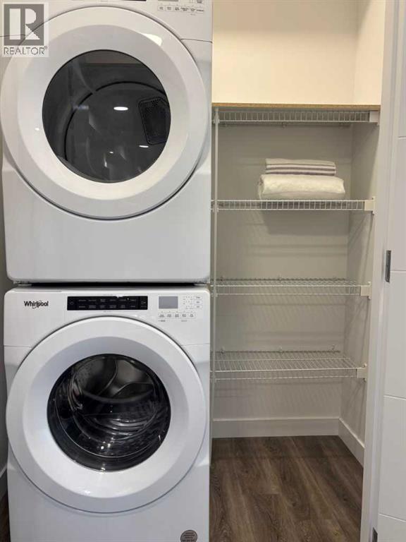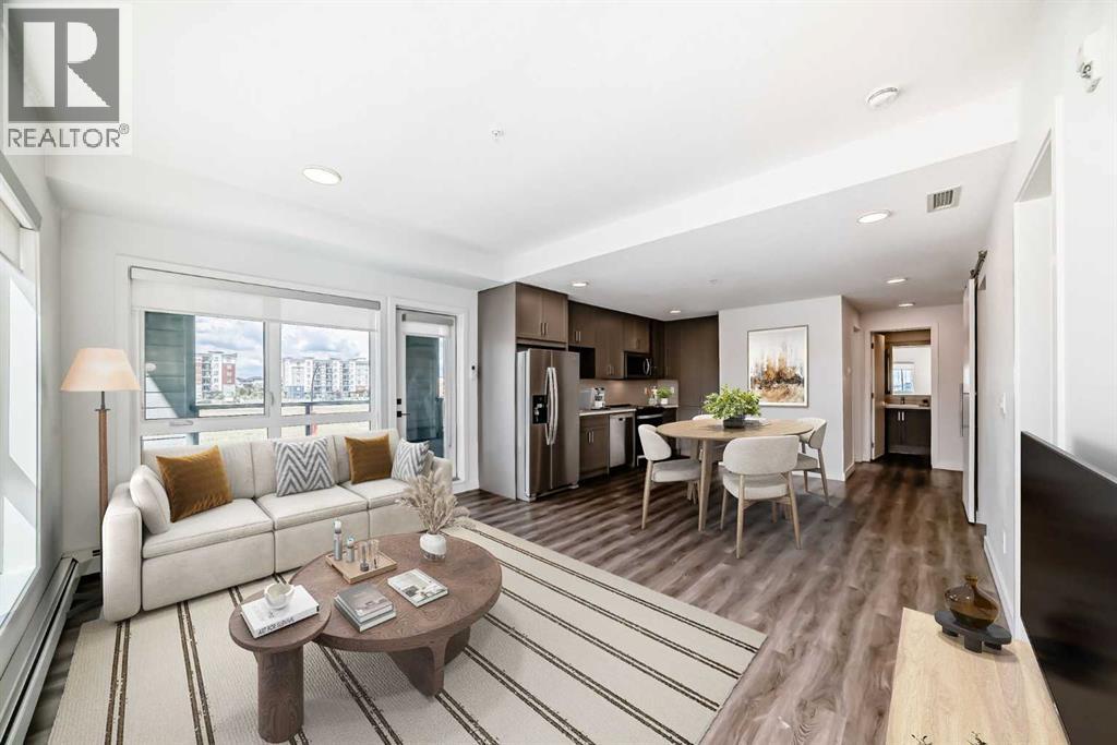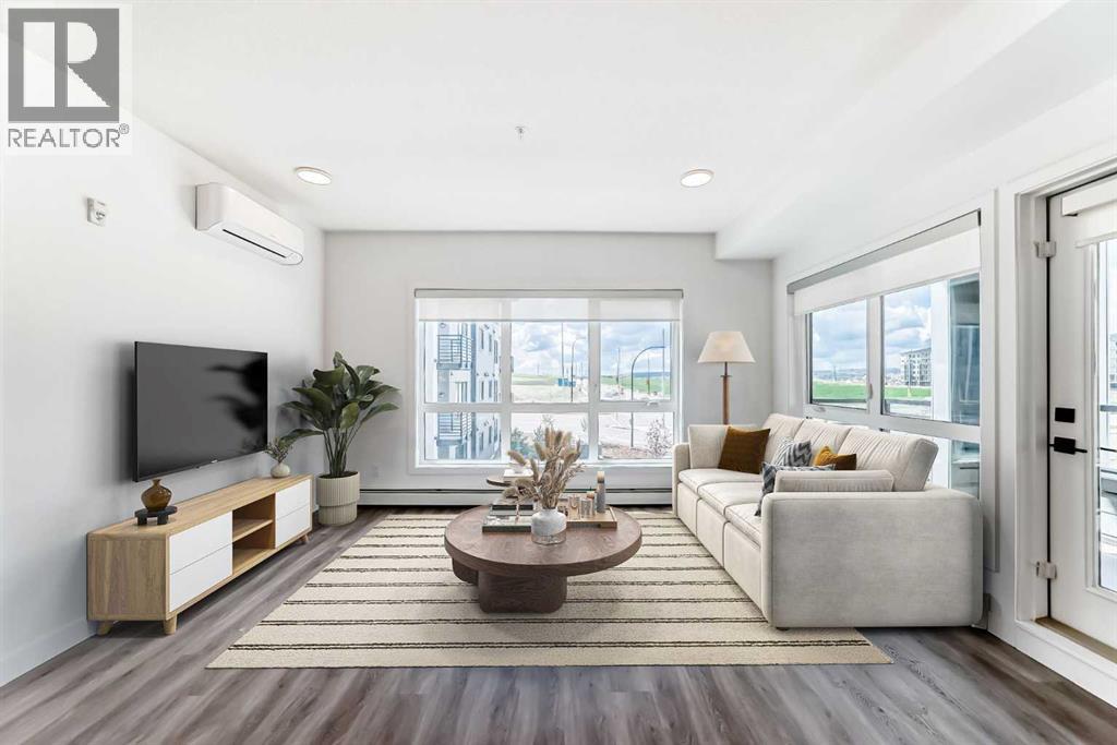 Welcome to the Maverick in Livingston — a beautifully upgraded, modern 2-bedroom + DEN, CORNER unit offering style, comfort, and exceptional natural light.Located on the 3rd FLOOR, this BRIGHT and SPACIOUS home features WINDOWS on TWO SIDES, filling the space with sunlight throughout the day. The open-concept layout seamlessly connects the kitchen, dining, and living areas, creating an inviting atmosphere for both everyday living and entertaining.The kitchen is thoughtfully designed with shaker-style cabinetry, ceiling-height cupboards, quartz countertops, tile backsplash, and stainless steel Whirlpool appliances. The primary bedroom includes a walk-in closet and a well-appointed 4-piece ensuite, while the second bedroom is conveniently located near the main bathroom. The den, enclosed with a sleek barn door, provides an ideal space for a home office, workspace, or additional storage.Step outside to your EXPANSIVE 23-foot private BALCONY— a standout feature of this unit — offering open, far-reaching views and a vibrant urban outlook, with sightlines stretching all the way to downtown Calgary. Actually feels like you're on the top floor, with views both South and West.Additional features include luxury vinyl plank flooring, air conditioning, LED lighting, roller blinds, and a full laundry room with shelving. This unit also includes TITLED, HEATED UNDER GROUND PARKING and a separate STORAGE locker.The attractive, clean, and well-maintained building offers elevator access, visitor parking, and a welcoming common area. Located close to shopping, amenities, and major routes including Stoney Trail, Deerfoot Trail, and Country Hills Boulevard — this home combines convenience with modern living and truly needs to be experienced in person to appreciate the light, layout, and expansive views it offers. GREAT VALUE HERE! (id:63190)