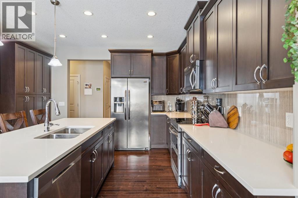 Welcome to #7 Cooperstown Place SW—an exceptional, meticulously maintained residence in the highly sought-after community of Coopers Crossing. Proudly offered by the original owners, this sophisticated 2,538 Sq Ft home blends timeless design with thoughtful, high-end upgrades, all set on a quiet, low-traffic street with a desirable sunny south-facing backyard.From the moment you arrive, the stunning stucco and stone exterior and undeniable curb appeal set the tone. Inside, you're greeted by an open foyer with an elegant, inviting staircase and 9’ ceilings that carry throughout the main level. The bright, open-concept layout is flooded with natural light from an abundance of windows, creating a warm and welcoming atmosphere.The heart of the home is the massive chef-inspired kitchen, featuring quartz countertops, extensive cabinetry, and generous prep space—perfect for everyday living and entertaining alike. High-end stainless-steel appliances, including a double induction oven, elevate the space, while the adjacent dining area comfortably accommodates a growing family. The living room showcases a beautiful stone surround fireplace, adding both warmth and character. A versatile main floor office/den/library with double French doors offers the perfect work-from-home setup or quiet retreat. Upstairs, you’ll find a spacious and sunlit bonus room, convenient upper-level laundry, and three generously sized bedrooms. The primary suite is a true sanctuary, complete with a walk-in closet and a luxurious 5-piece en suite featuring a barn door entrance and quality finishes throughout. This home is equipped for comfort year-round with two furnaces and dual A/C units, along with a water softener and newer hot water tank. Custom built-ins and upgraded millwork throughout further highlight the attention to detail. Step outside to your private backyard oasis—fully fenced and beautifully landscaped with mature trees along the rear for added privacy. Enjoy summer evenings on the tw o-tier deck with pergola, privacy walls, and gemstone exterior LED soffit lighting for ambiance. A custom storage shed and a concrete walkway running from front to back add both function and convenience. The attached double garage features epoxy flooring and comfortably accommodates a pickup truck & more. Every aspect of this home reflects pride of ownership—it is exceptionally clean, well-cared for, and truly move-in ready. Located within walking distance to schools, parks, pathways, and amenities, with easy access out of town, this is a rare opportunity to own a high-end home in one of Airdrie’s most prestigious communities. A perfect blend of luxury, functionality, and location—this home is sure to impress. (id:63190)