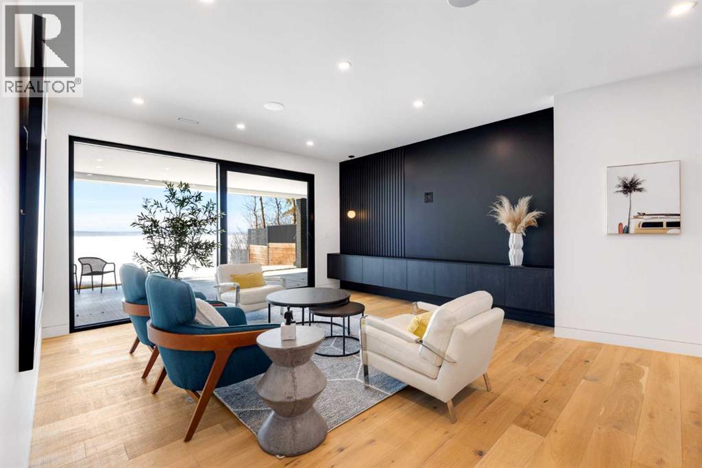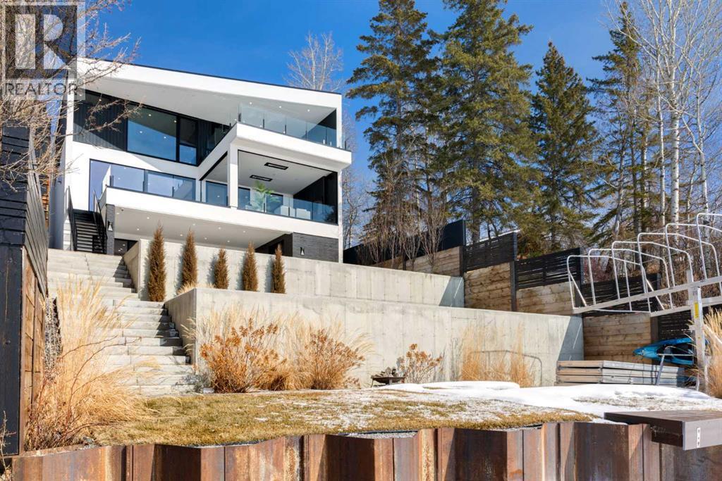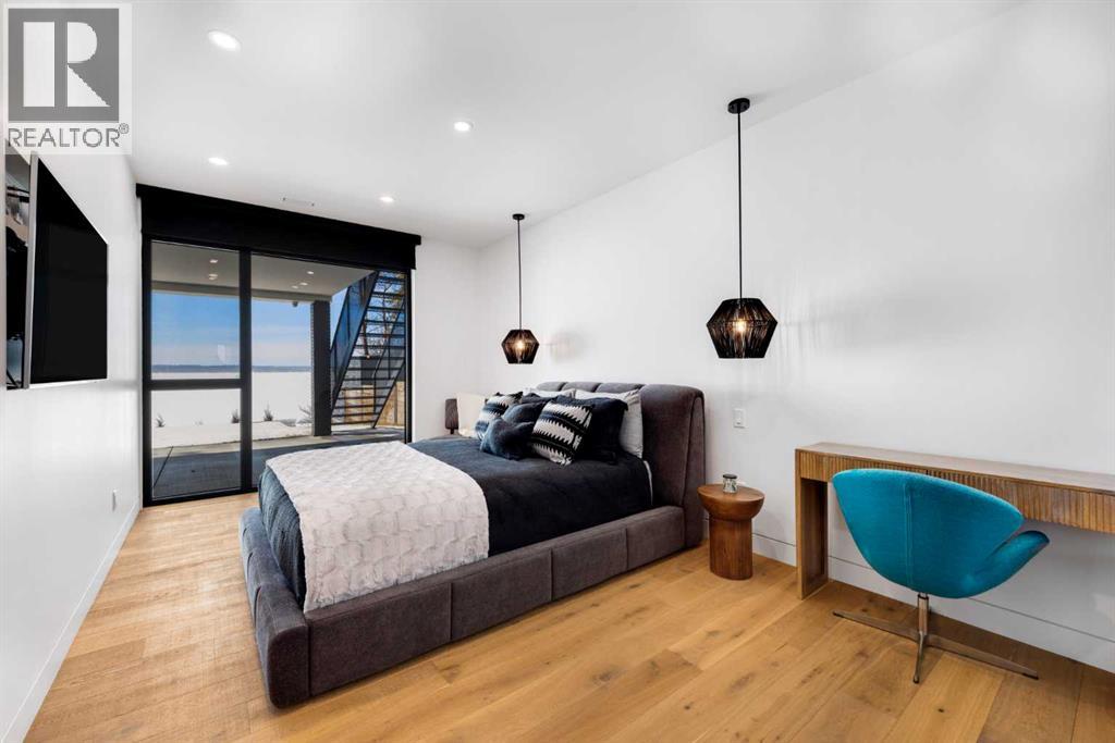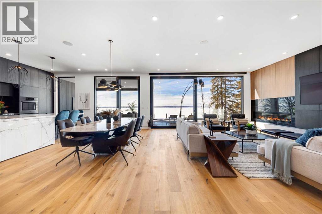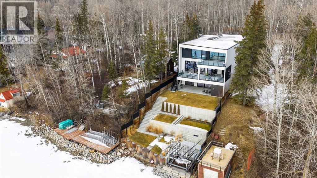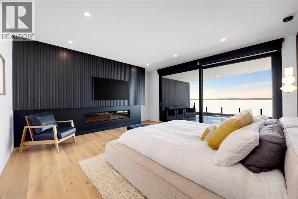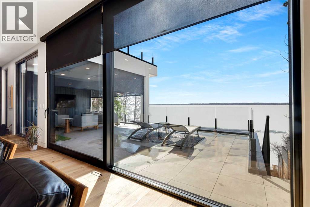 Presenting The Cliffs, a breathtaking custom lakefront residence by Award Winning Custom Home Builder: Square Structures. Designed to live in harmony with its surroundings, this architectural statement captures uninterrupted, south-facing lake views from every level, allowing light, water, and design to exist in perfect balance.Expansive walls of floor-to-ceiling glass dissolve the boundary between indoors and out, allowing the landscape to become part of everyday living. This 3890 sq.ft residence is expanded with 1,700 square feet of outdoor living space, including a fully screened outdoor lounge with fireplace, overhead heaters, and integrated media, an inviting setting for evenings by the water, regardless of the season.A refined palette of materials and meticulous craftsmanship define the interiors. Wide-plank white oak flooring grounds the open-concept main level, where a beautifully appointed living space flows effortlessly into the streamlined kitchen. With an eye for both form and function, the kitchen features porcelain countertops, integrated appliances, an induction cooktop, built-in coffee station, ice machine, and a discreet walk-through pantry with full-size refrigerator and freezer, all thoughtfully curated for seamless entertaining.The primary suite is a private sanctuary, offering direct access to a lake-facing balcony, a gas fireplace, walk-in closet and a spa-inspired ensuite with dual vanities, a walk-through shower, and custom tilework, all designed to calm and restore the soul.Throughout this residence, every detail has been considered: a dedicated home office, a private fitness studio with a wraparound balcony, four additional bedrooms, and a walk-out lower level complete with a family room and immersive theatre experience. In-floor heating and automated blinds on every level, a triple attached garage and lakeside outdoor storage provide comfort and ease, while professionally designed landscaping creates an invitation to the water’s edge. From sunrise reflections to fireside evenings, The Cliffs offers a lifestyle defined by a connection to nature and the moments that matter most. (id:63190)
