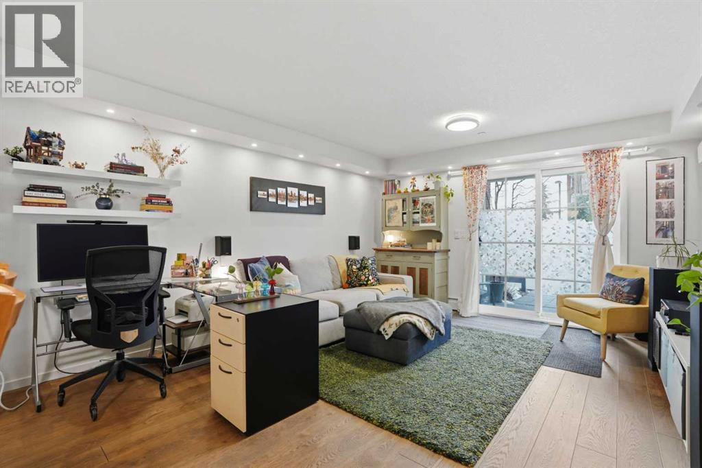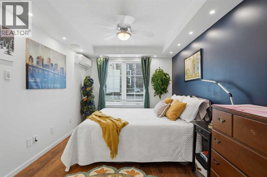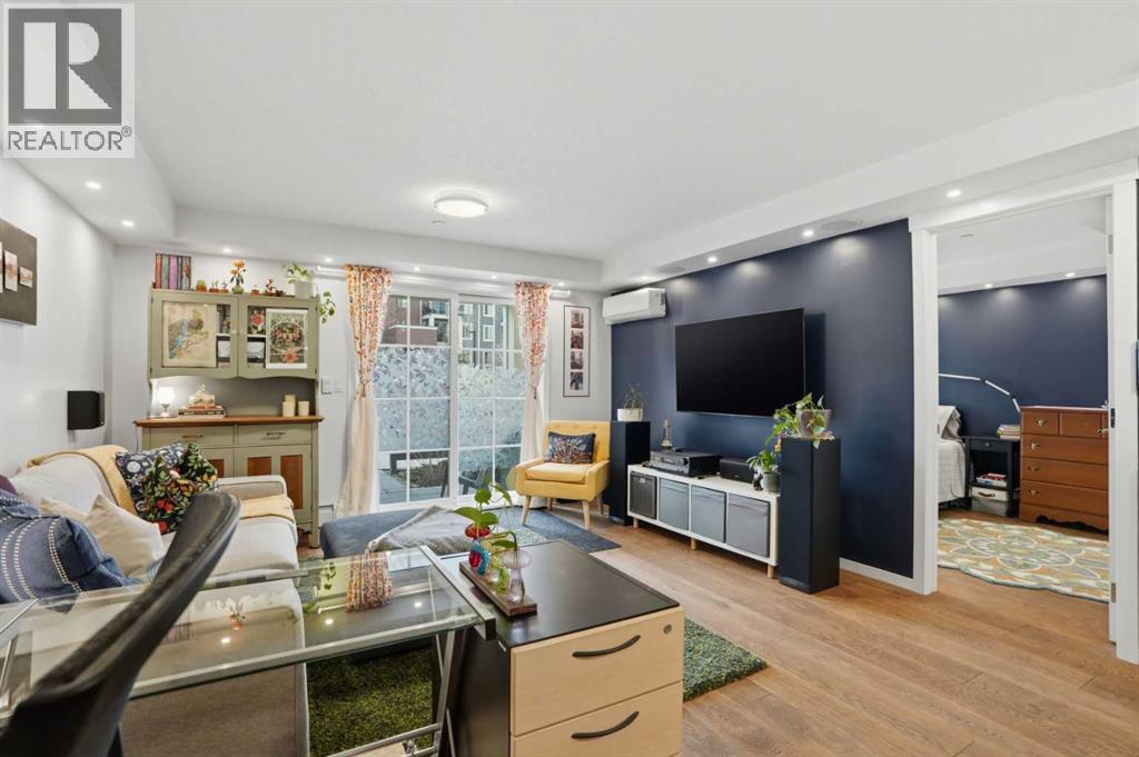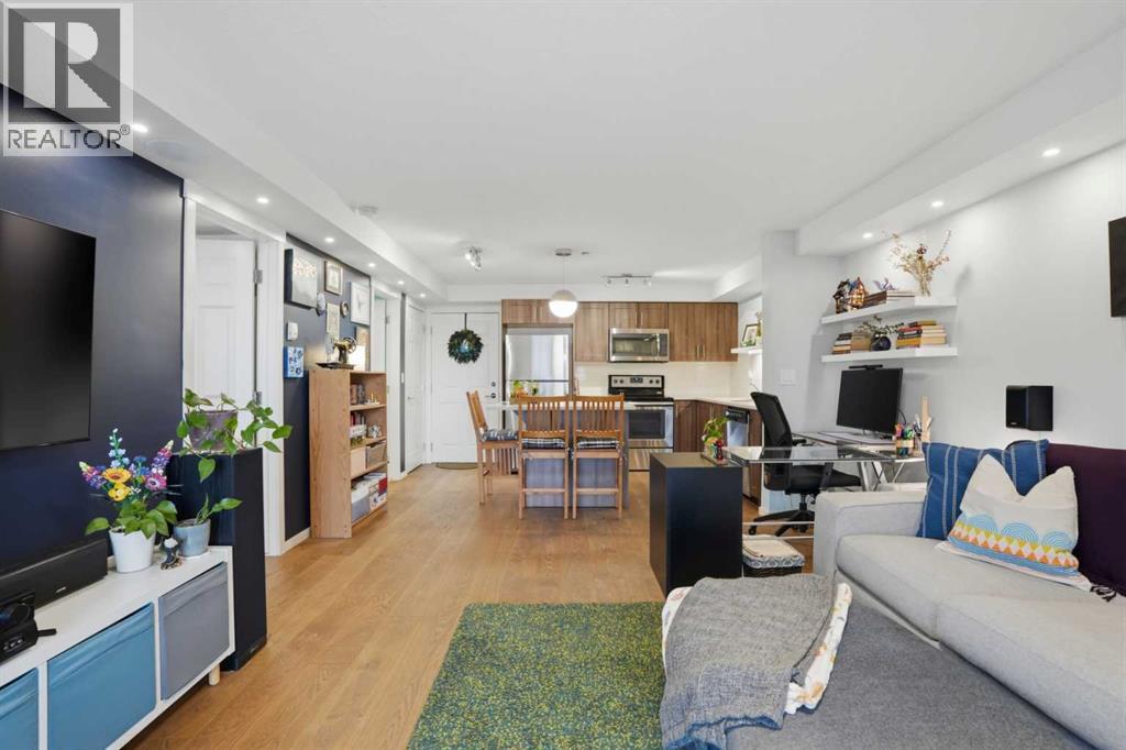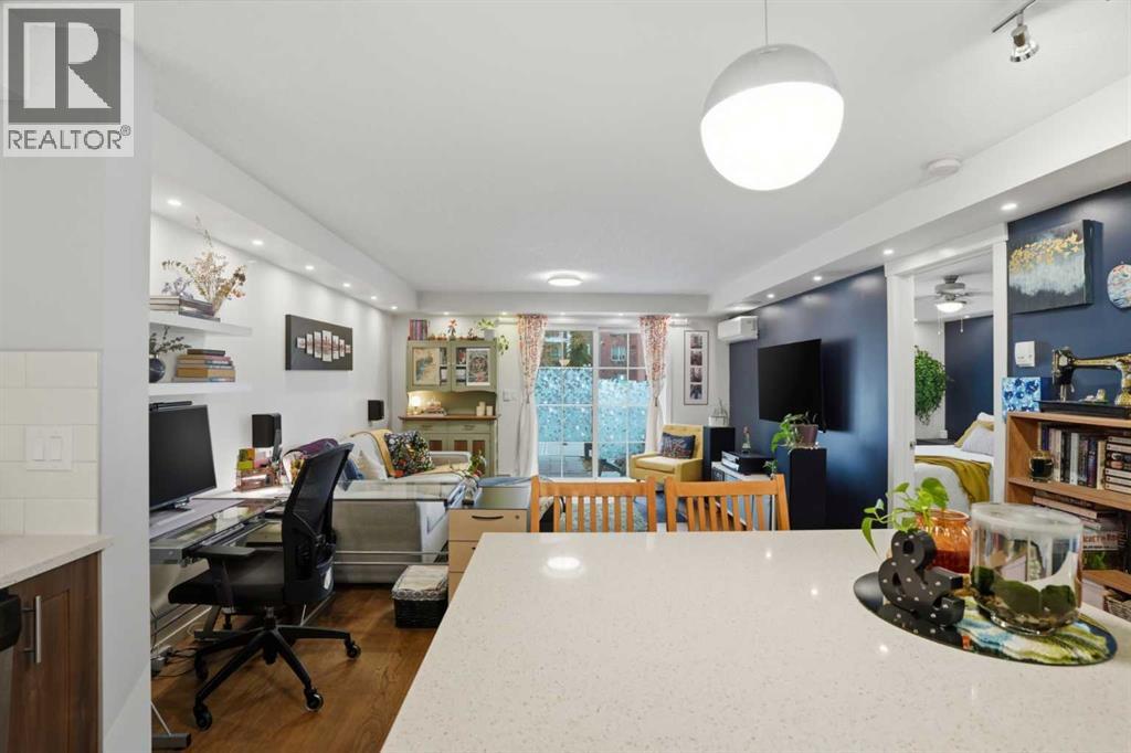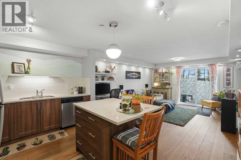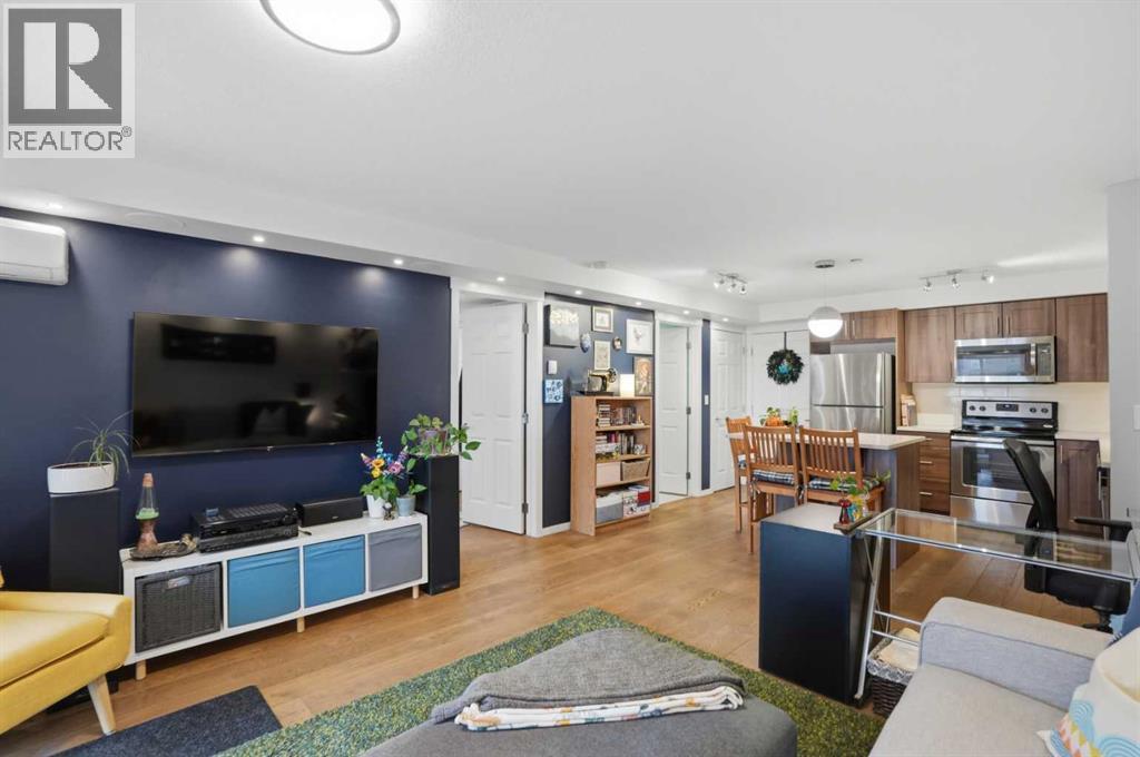 Welcome to this beautifully upgraded, and meticulously maintained former show suite, where thoughtful design meets everyday comfort. This 1-bedroom, 1-bathroom home offers a warm and inviting vibe from the moment you walk in - truly feeling like a big, cozy embrace. Situated on the main floor, this unit provides convenient, private access without the need to pass through the building, making it ideal for ease of living. Just steps from your patio, you’ll find your above-ground parking stall, and underground, additional secure storage. Inside, the home is rich with upgrades throughout. The gorgeous kitchen features a stunning stone island, warm-toned shaker-style cabinetry, and stainless appliances, while the engineered wide-plank hardwood flooring flows seamlessly through the space. In-ceiling speakers and upgraded recessed lighting create an elevated ambiance, perfect for both relaxing and entertaining, while the mini-split A/C in the living room & bedroom keeps you calm, cool & collected. The thoughtful layout includes in-suite laundry and substantial in-suite storage, ensuring functionality matches the home’s beauty. This pet-friendly building (with board approval - please refer to bylaws) is designed with your furry companions in mind, offering dedicated pet areas while also being in close proximity to a nearby nature reserve with scenic walking paths. Reasonable condo fees just add to this units appeal. Located in the young, vibrant community of Copperfield, you’ll enjoy easy access to amenities, shopping, and major transportation routes - bringing convenience right to your doorstep. This home offers a perfect blend of style, comfort, and practicality - making it a smart move. (id:63190)