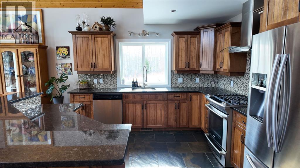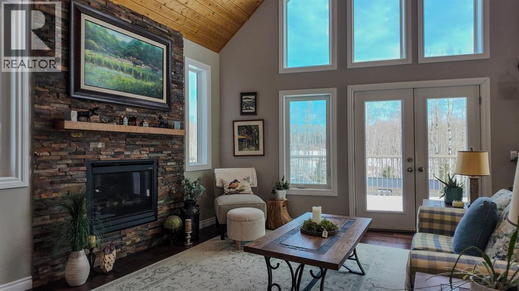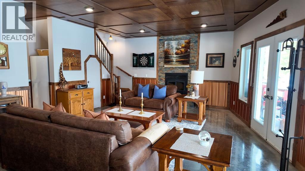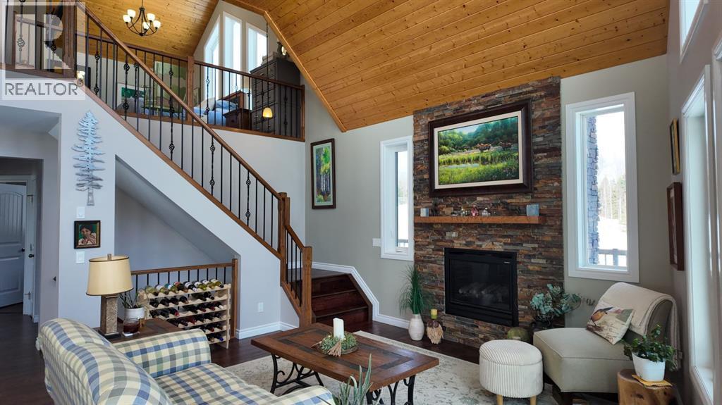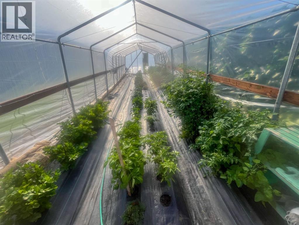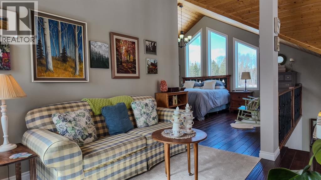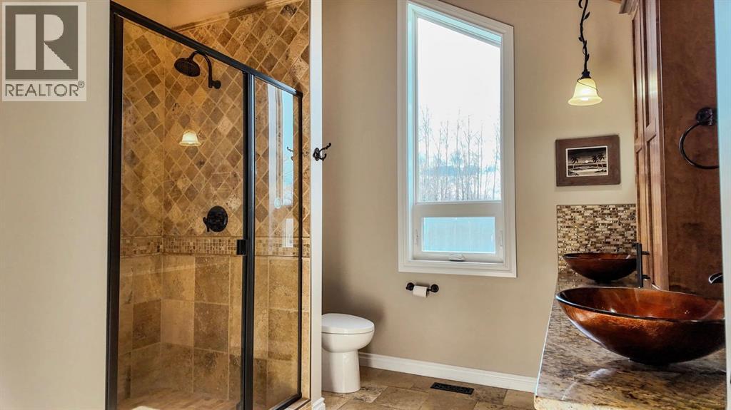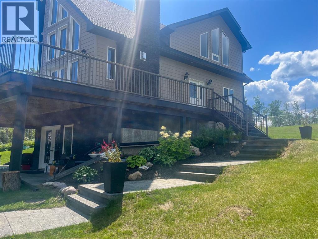Set on 7.24 beautifully developed acres, this stunning 1.5-storey A-frame home with a walk-out basement offers a rare combination of striking architecture, upscale finishes and functional acreage living. The home features 5 bedrooms and 3 bathrooms, thoughtfully designed to offer both space and privacy. Soaring vaulted ceilings and a dramatic A-frame feature wall create an impressive main living space, while triple-pane windows flood the home with natural light and showcase the quality craftsmanship throughout.The interior features engineered hardwood flooring, slate tile accents and rich dark maple cabinetry carried through the kitchen and bathrooms. The kitchen is both stylish and practical, complete with quartz countertops, stainless steel appliances and central vacuum floor sweeps, all open to the main living and dining areas. A gas fireplace adds warmth to the living room, while the walk-out basement offers additional living space with a cozy wood-burning fireplace.In the lower level, walnut ceilings and matching trim have been carried through to create a seamless, cohesive design that ties the entire home together beautifully. This level also extends the living space with comfort and warmth, enhanced by in-floor heating throughout.The loft is dedicated to a private primary retreat, featuring a reading area overlooking the main floor, a walk-in closet and a well-appointed ensuite with double vanities and a tiled walk-in shower. The main bathroom also includes a deep soaker tub and in-floor heat, with additional in-floor heating in the walk-out level.Recent upgrades include a new well (May 2025), water softener, washer and dryer and central vacuum system. The exterior is finished in durable Hardie board siding and surrounded by decking on three sides, including private access from one of the bedrooms and two gas hookups for BBQs.Previously used for commercial organic gardening, the property features a fully fenced 150’ x 300’ garden and greenhouse area, inc luding a 12’ x 50’ greenhouse plumbed for water. Established plantings include strawberries, apple trees, Saskatoon bushes, cherry trees, raspberries, haskap and asparagus.Additional improvements include two insulated, powered sheds (18’ x 20’ and 14’ x 24’, one with air conditioning), a 20’ x 30’ Quonset, chicken coop and a fully serviced RV site with power, sani-dump and water nearby. There is also an 8’ x 8’ powered dog house with a window, man door and doggy door. A 40’ high cube sea-can (9’6” high) with an attached 8’ x 14’ lean-to is negotiable, complete with electrical panel, LED lighting and outlets. A truly unique opportunity offering refined country living with exceptional versatility and space to grow. (id:63190)