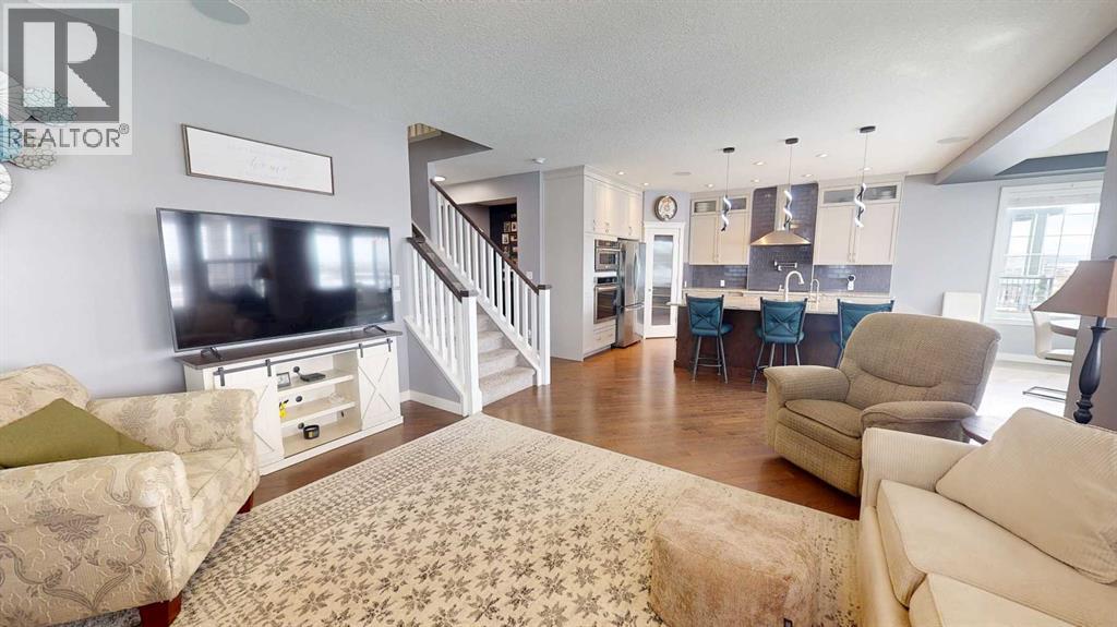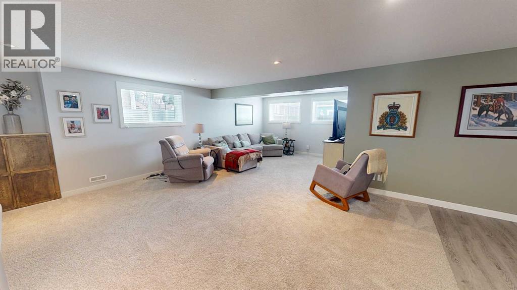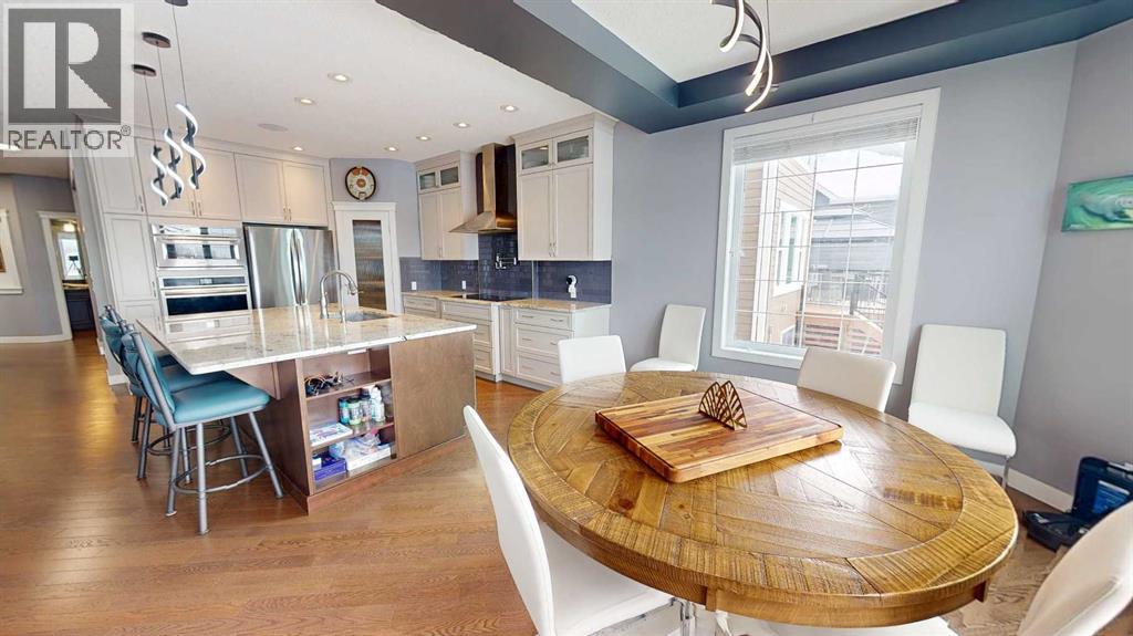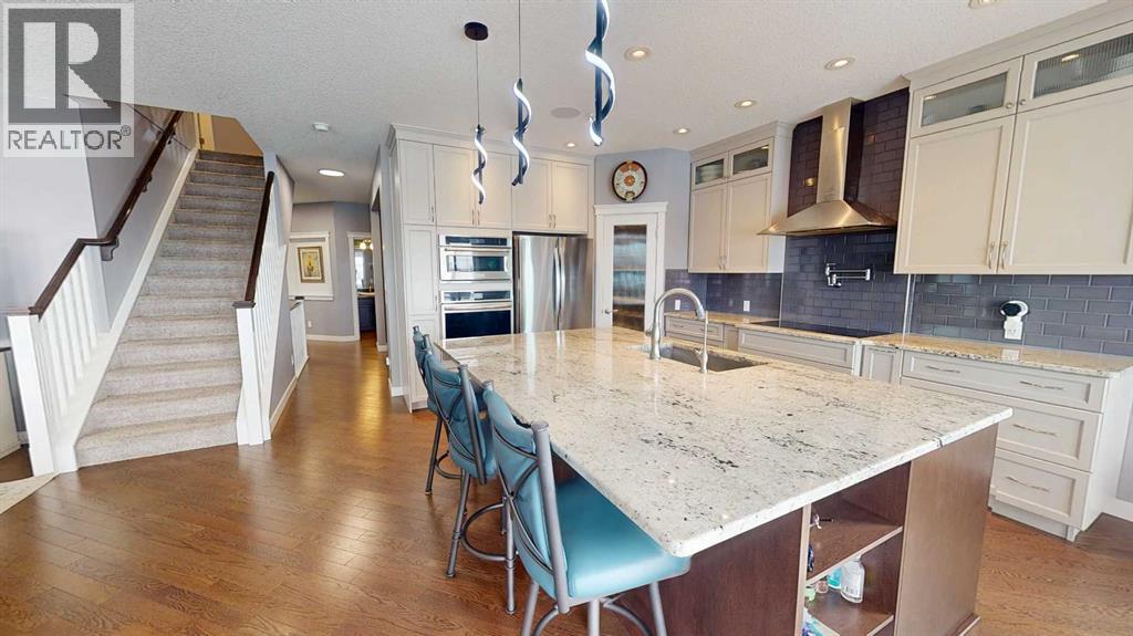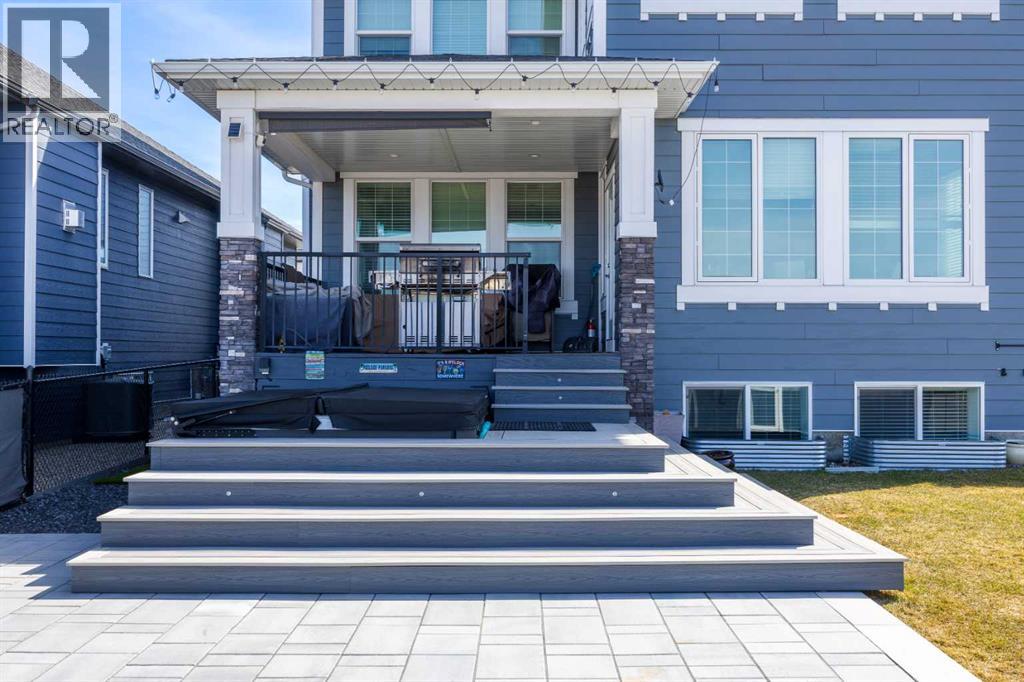 Welcome to 158 Ranch Road in Okotoks, where opportunities to own in this highly desirable community are few and far between. Built by Sterling Homes, this exceptional property offers over 4,300sqft of beautifully designed living space and showcases quality craftsmanship throughout. Step inside to a thoughtfully planned layout designed to suit every stage of family life. Upstairs, you’ll find four spacious bedrooms, an oversized linen closet, and a large bonus room over the garage that creates the perfect space for relaxing or gathering together. The primary retreat is a true standout, featuring vaulted ceilings, a luxurious 5-piece ensuite, and a massive walk-in closet. A unique flex space off the primary bedroom adds even more versatility, ideal for a home office with mountain views, a nursery, or a private workout area.The main floor blends elegance and function with a full office (or a main floor bedroom), an additional flex room perfect for a music room, homework area or creative space, and a bright open-concept living area finished with beautiful hardwood flooring and a striking gas fireplace. The kitchen is designed to impress, with ceiling-height custom cabinetry, built-in appliances, a massive granite island, cooktop with hood fan, filtered water and even an ice machine for added convenience. A large walk-through pantry and dedicated laundry room with its own sink make everyday living effortless. Natural light pours through the many triple-pane windows, highlighting the 9-foot ceilings and creating bright, open sightlines throughout the home. The lower level is equally impressive, offering a gym space, a spacious rec room, an additional bedroom, and a full bathroom for guests or extended family. Outside, enjoy a beautifully landscaped west-facing backyard complete with a fully fenced yard, concrete pathway, custom stonework patio and maintenance free deck. The deck has a built in hot tub that is included and is the perfect place to relax and take in the vie ws. Finished with durable Hardie board siding, two A/C units, Gemstone lights and an oversized Heated double garage with two single doors and extra storage space, this home delivers the perfect balance of luxury, comfort, and practicality. (id:63190)