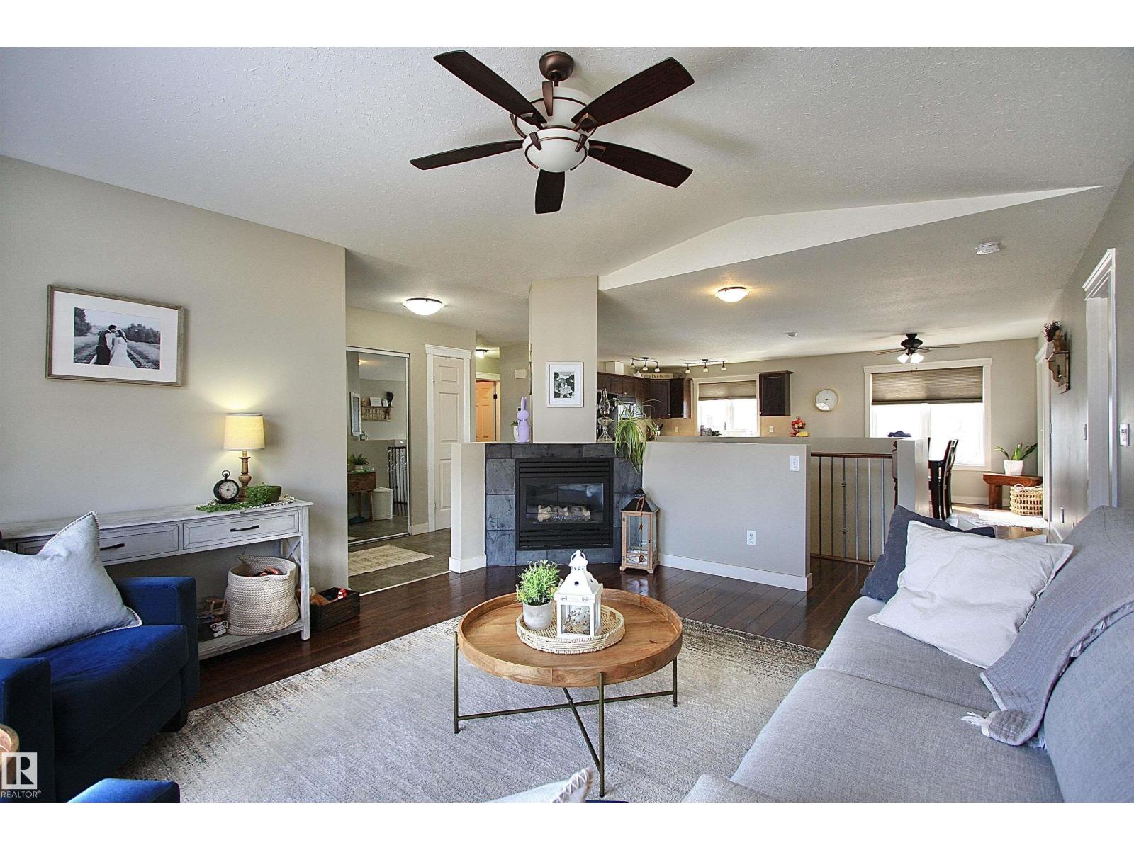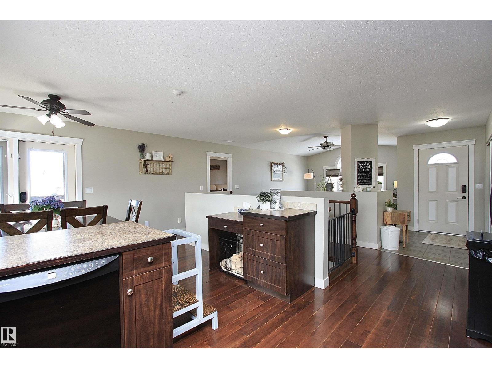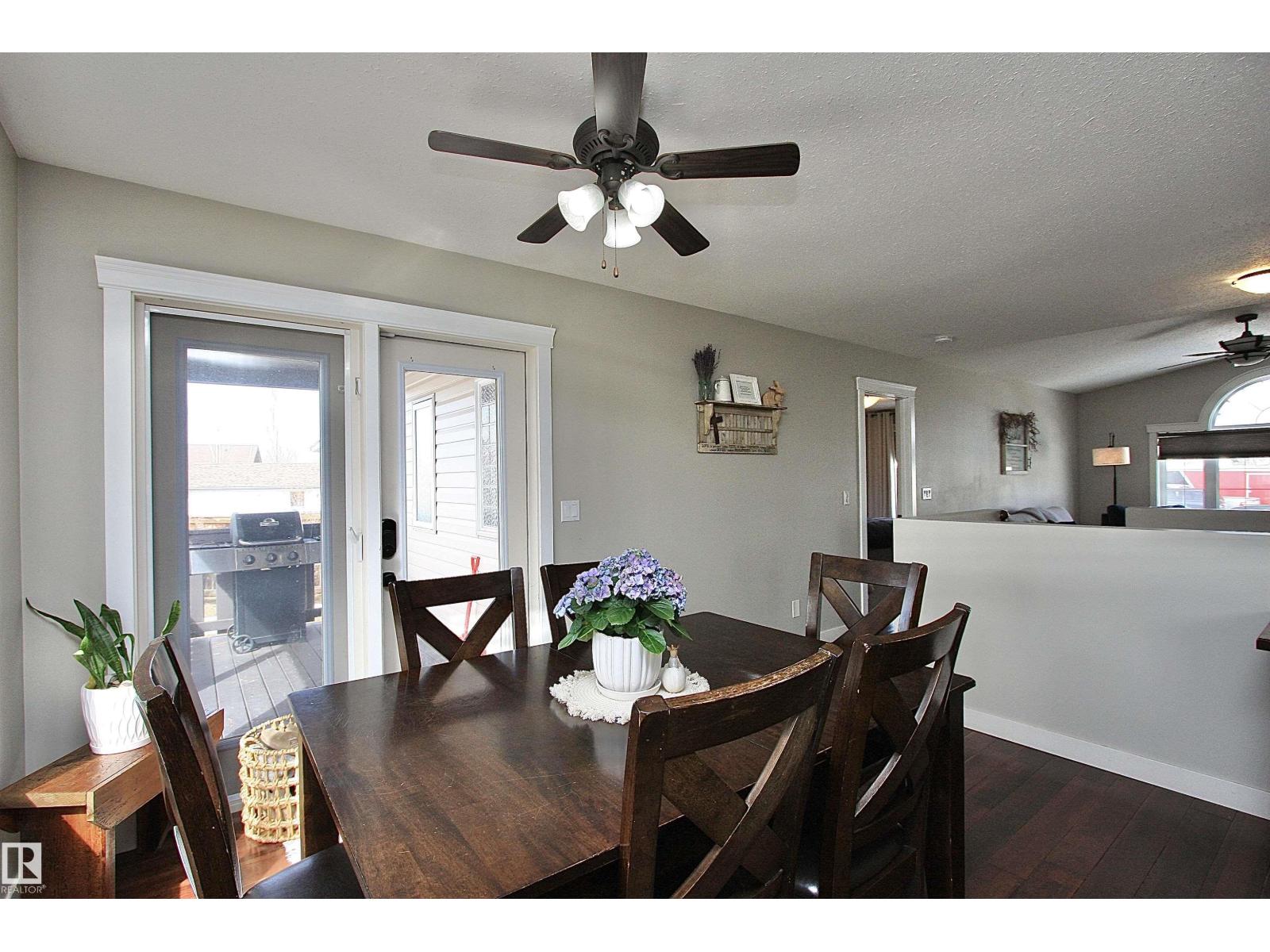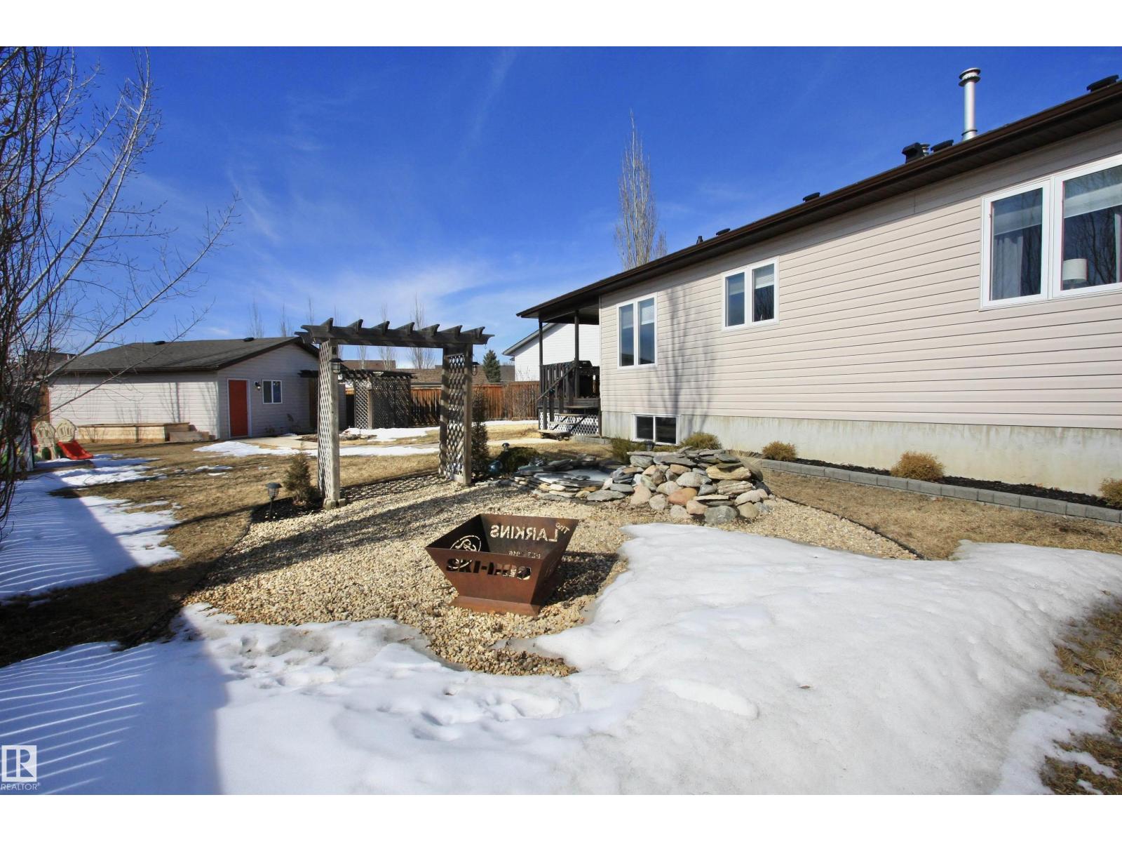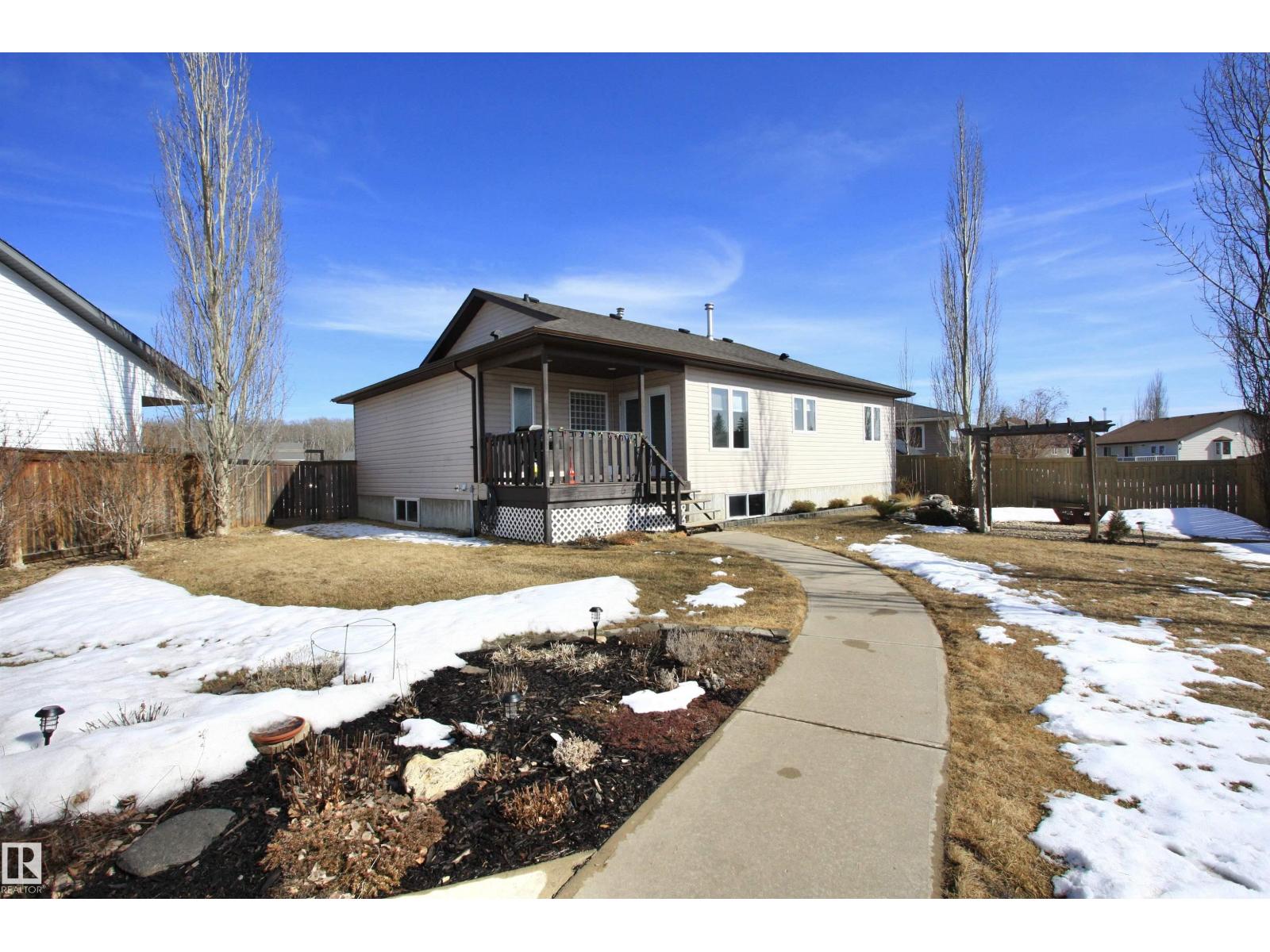 Welcome to Bashaw! Escape the hustle of the city and discover the charm of small-town living in Bashaw. This well-maintained 1,376 sq ft bungalow (built in 2006) offers 4 bedrooms and 3 full bathrooms, including a private ensuite. The bright main floor features vaulted ceilings, hardwood floors, a cozy gas fireplace, and large windows filling the kitchen, dining, and living areas with natural light. Enjoy a beautifully landscaped, gated yard on a generous 9,266 sqft lot with a water feature, firepit area, and plenty of room for kids and pets to play. Start your mornings on the covered front porch and end the day with BBQs on the covered rear deck. The insulated double detached garage and rear alley access provide exceptional RV parking. The lower level offers a large rec room, stylish laundry/bar area with new cabinetry, farm sink, and barn door, plus a flex room ideal for a home office or craft space and a spacious storage/utility room with shelving. Located in a quiet, family-friendly neighbourhood. (id:63190)