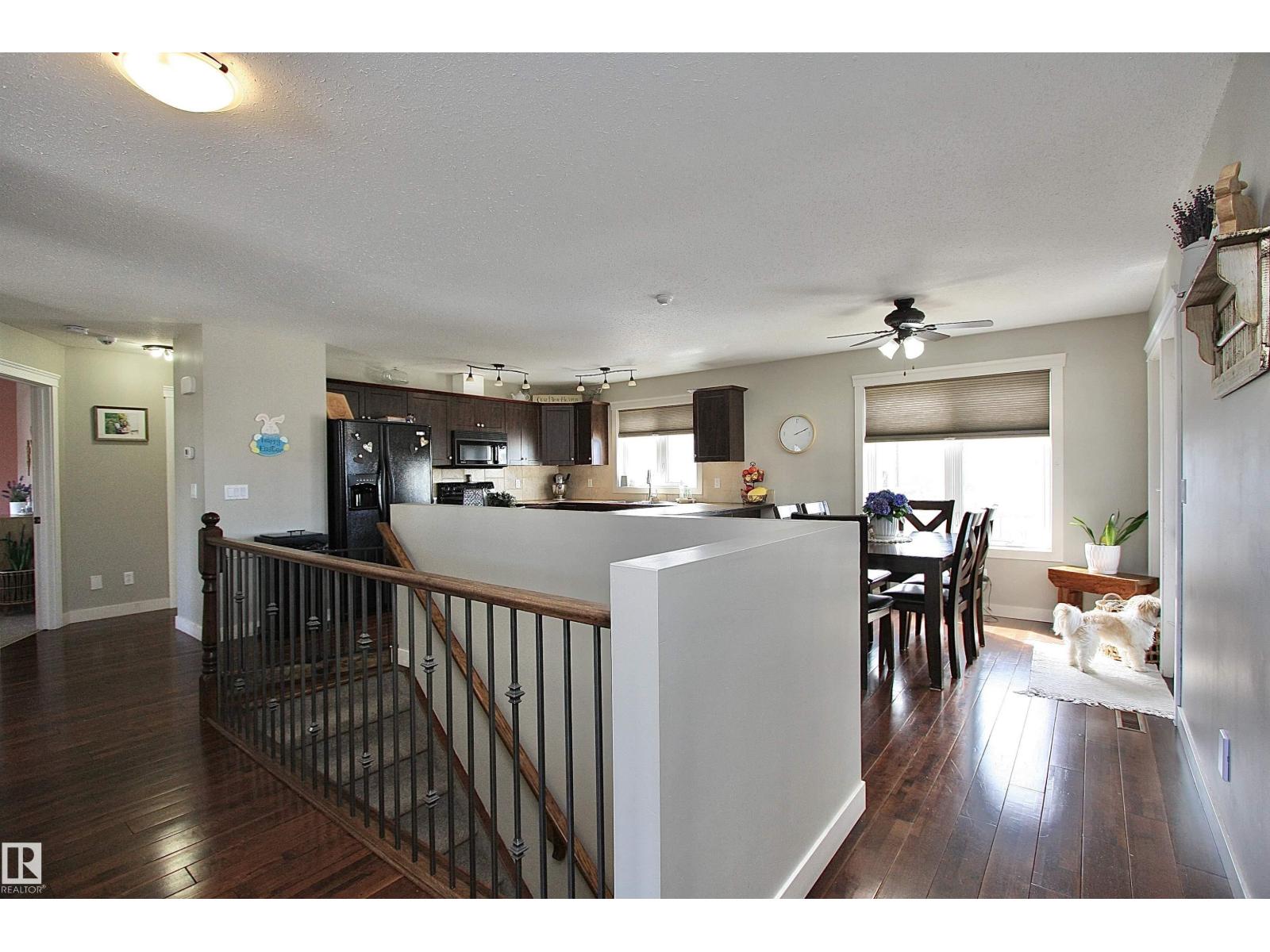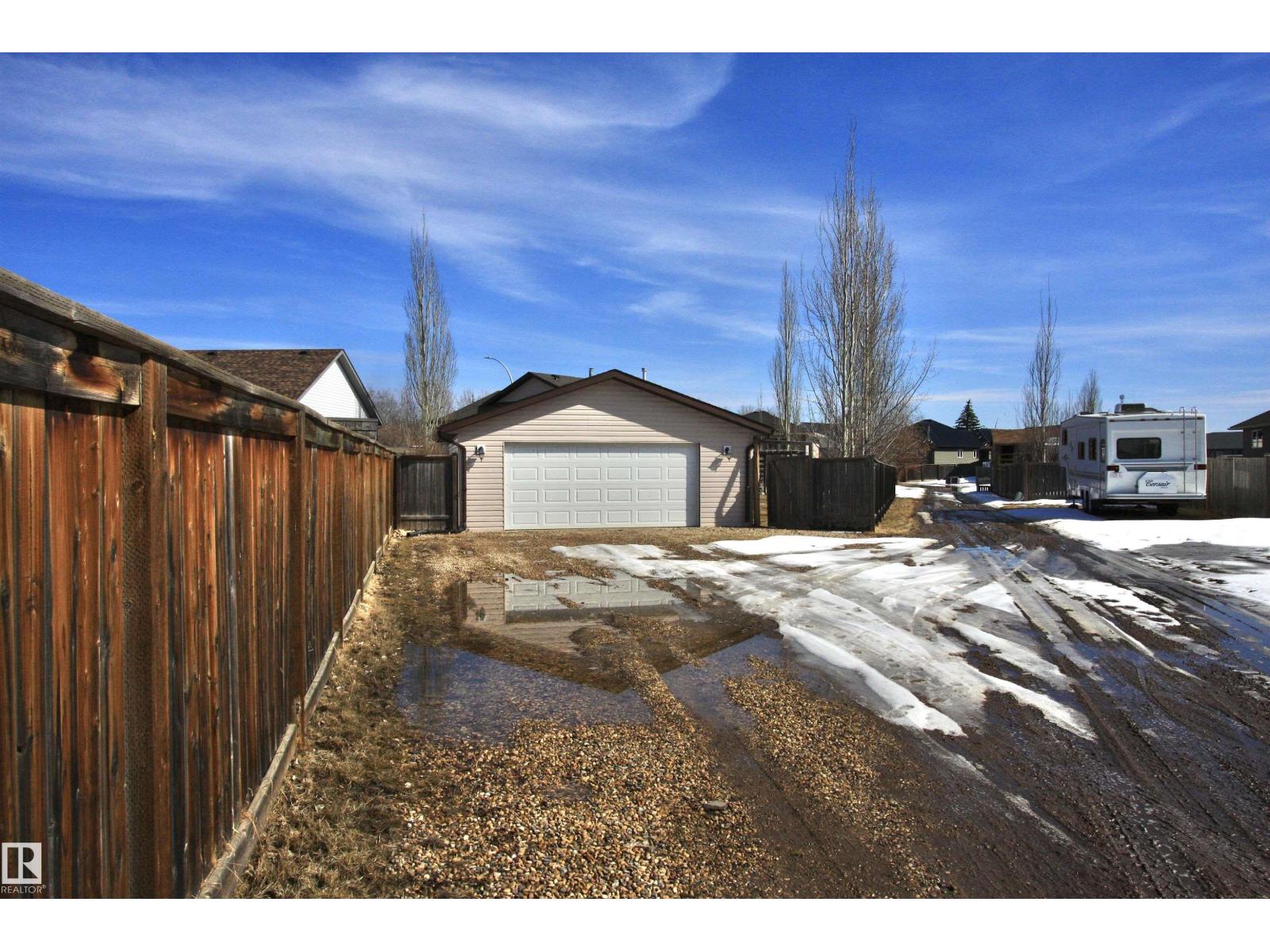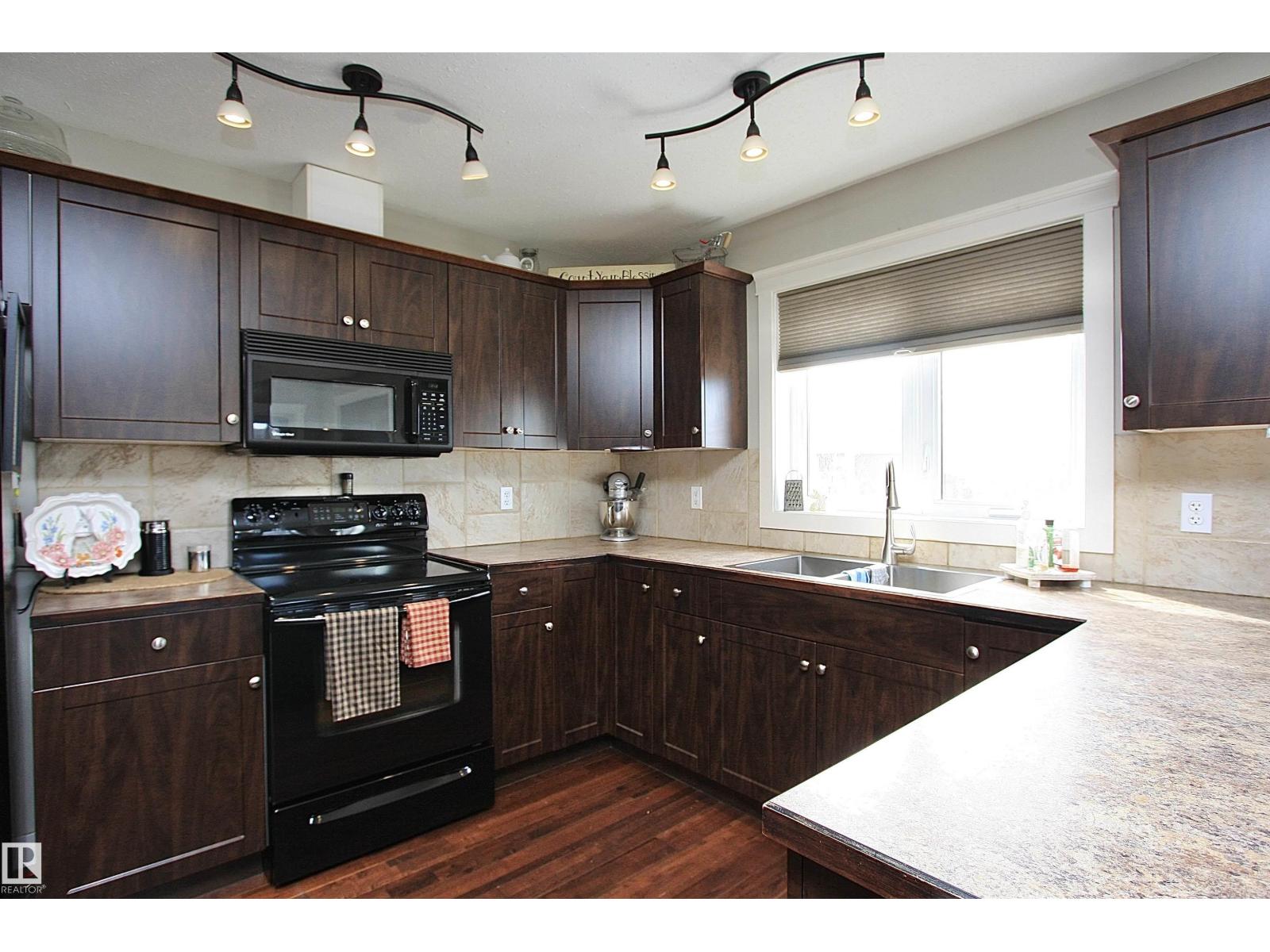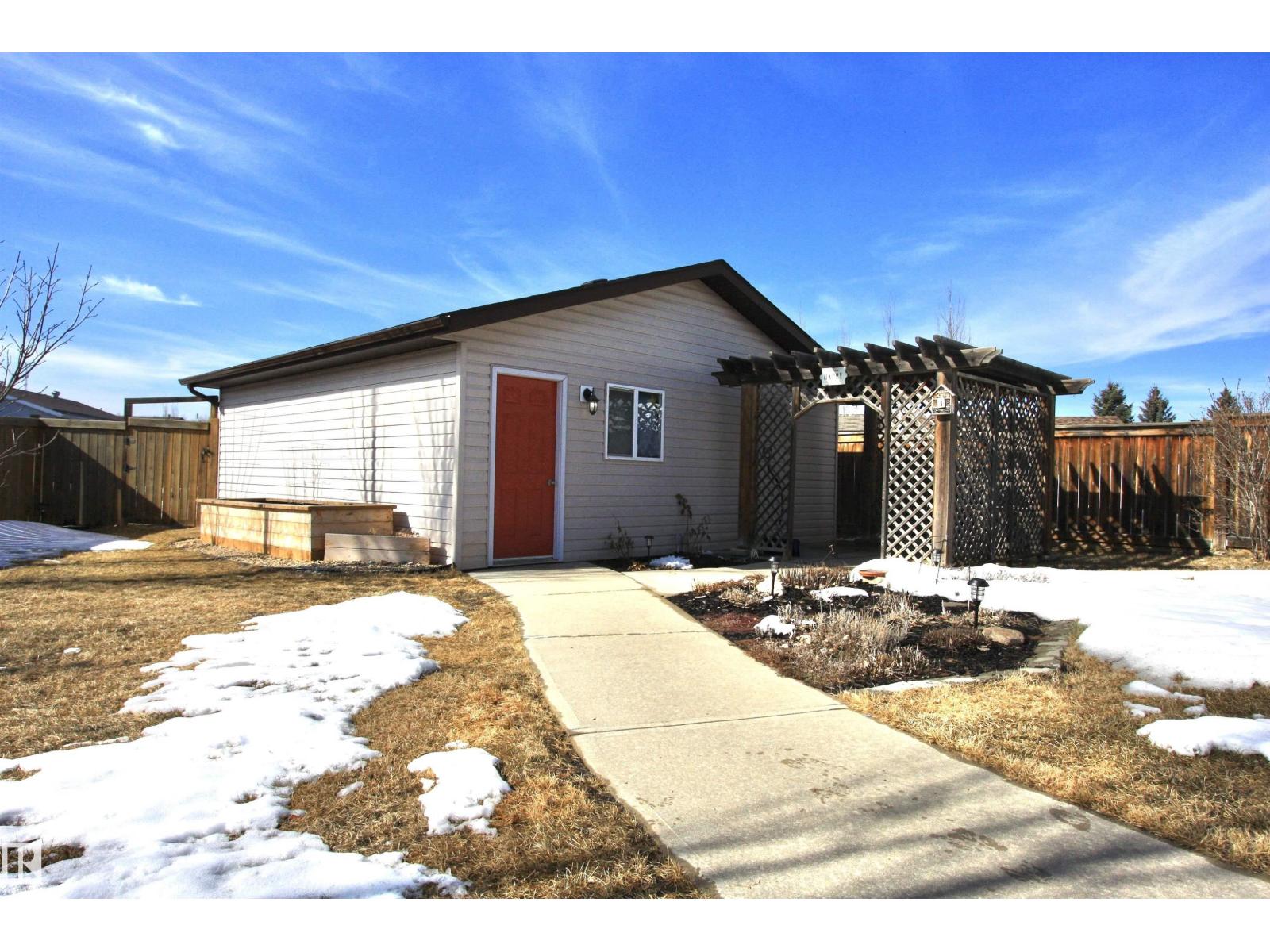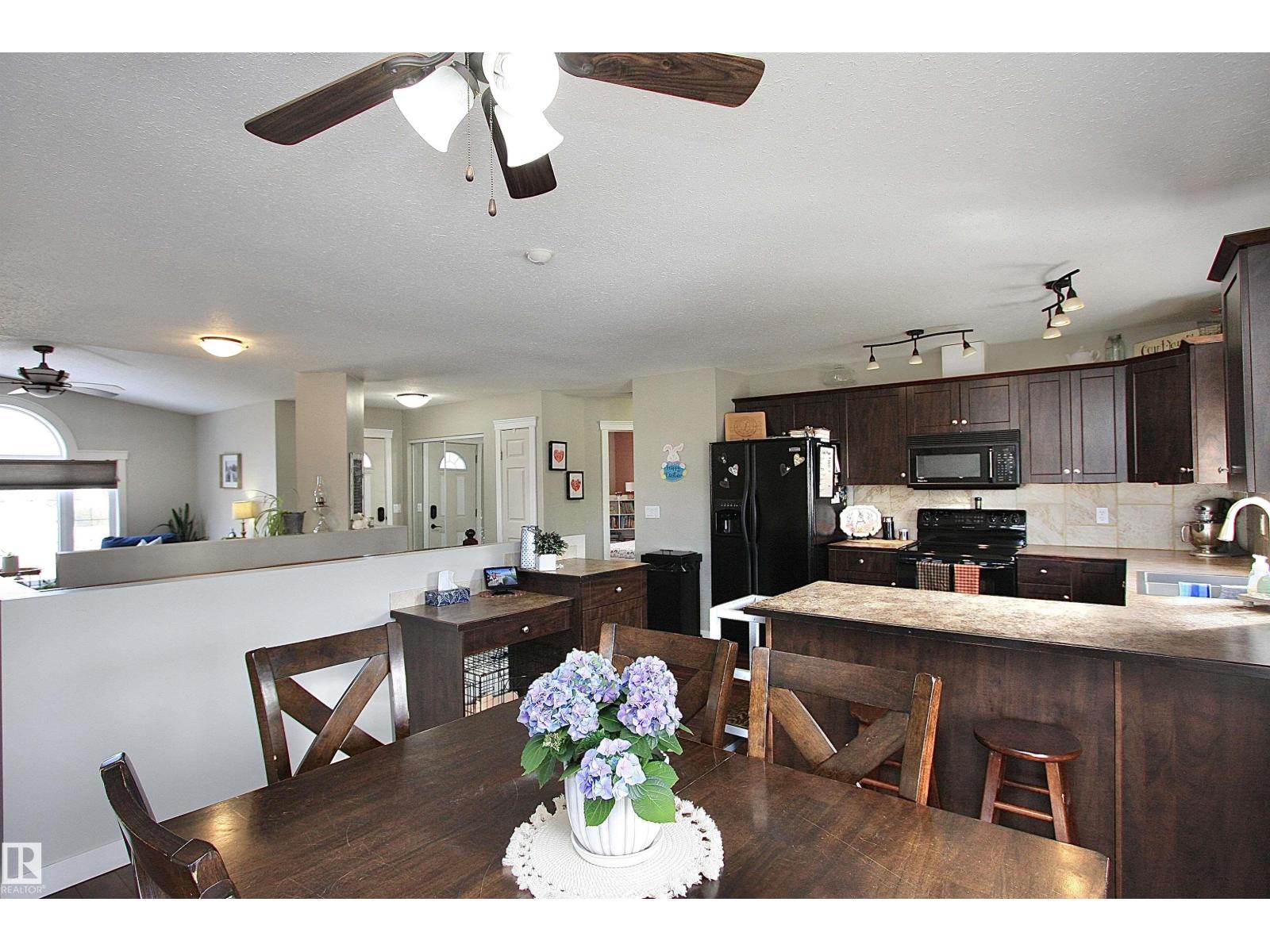 Welcome to Bashaw! Escape the hustle of the city and discover the charm of small-town living in Bashaw. This well-maintained 1,376 sq ft bungalow (built in 2006) offers 4 bedrooms and 3 full bathrooms, including a private ensuite. The bright main floor features vaulted ceilings, hardwood floors, a cozy gas fireplace, and large windows filling the kitchen, dining, and living areas with natural light. Enjoy a beautifully landscaped, gated yard on a generous 9,266 sqft lot with a water feature, firepit area, and plenty of room for kids and pets to play. Start your mornings on the covered front porch and end the day with BBQs on the covered rear deck. The insulated double detached garage and rear alley access provide exceptional RV parking. The lower level offers a large rec room, stylish laundry/bar area with new cabinetry, farm sink, and barn door, plus a flex room ideal for a home office or craft space and a spacious storage/utility room with shelving. Located in a quiet, family-friendly neighbourhood. (id:63190)