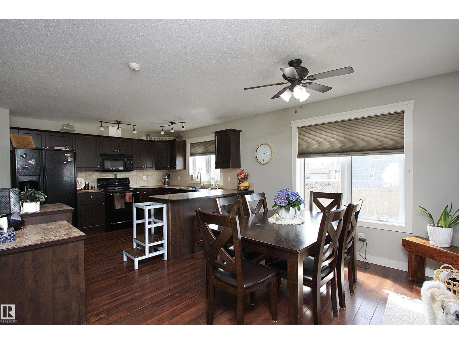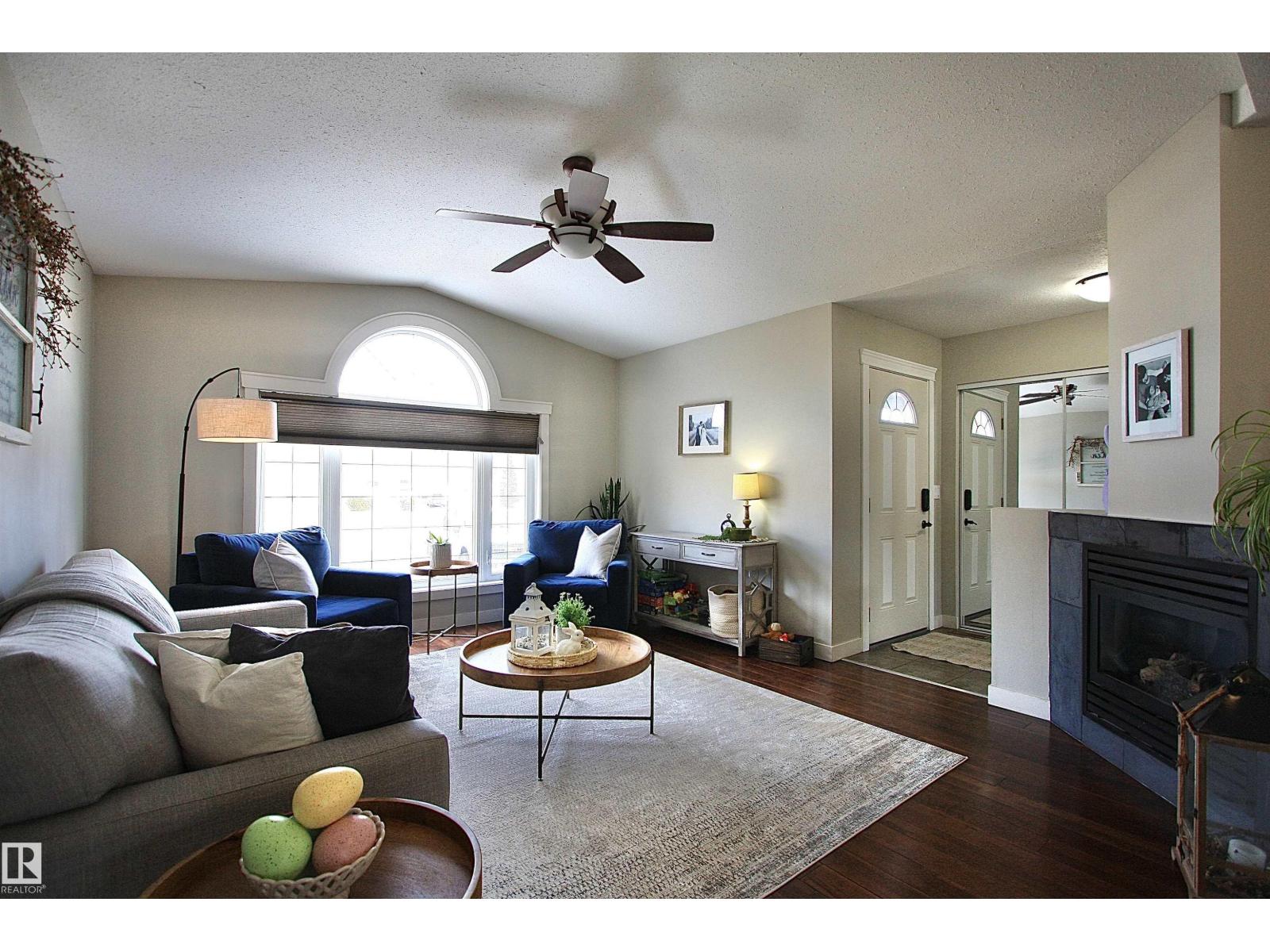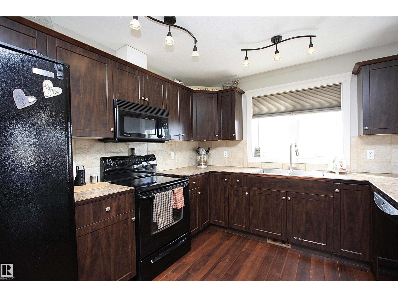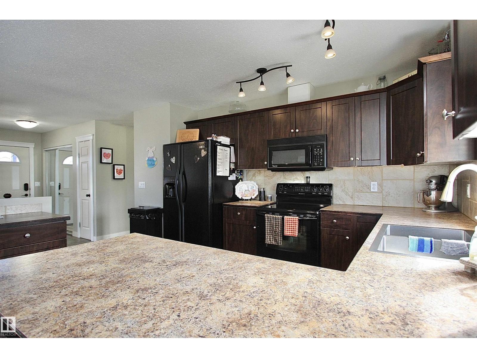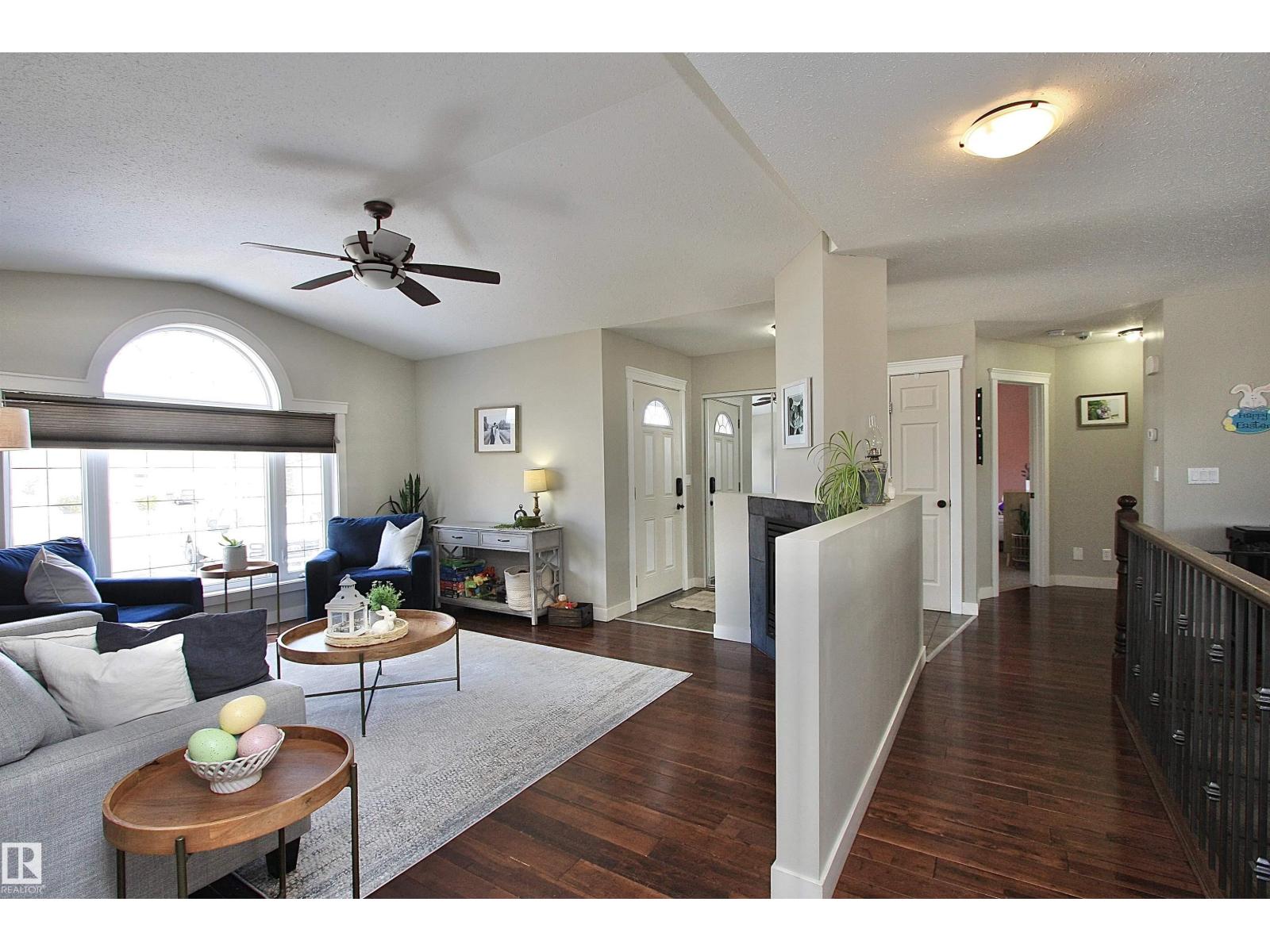 Welcome to Bashaw! Escape the hustle of the city and discover the charm of small-town living in Bashaw. This well-maintained 1,376 sq ft bungalow (built in 2006) offers 4 bedrooms and 3 full bathrooms, including a private ensuite. The bright main floor features vaulted ceilings, hardwood floors, a cozy gas fireplace, and large windows filling the kitchen, dining, and living areas with natural light. Enjoy a beautifully landscaped, gated yard on a generous 9,266 sqft lot with a water feature, firepit area, and plenty of room for kids and pets to play. Start your mornings on the covered front porch and end the day with BBQs on the covered rear deck. The insulated double detached garage and rear alley access provide exceptional RV parking. The lower level offers a large rec room, stylish laundry/bar area with new cabinetry, farm sink, and barn door, plus a flex room ideal for a home office or craft space and a spacious storage/utility room with shelving. Located in a quiet, family-friendly neighbourhood. (id:63190)