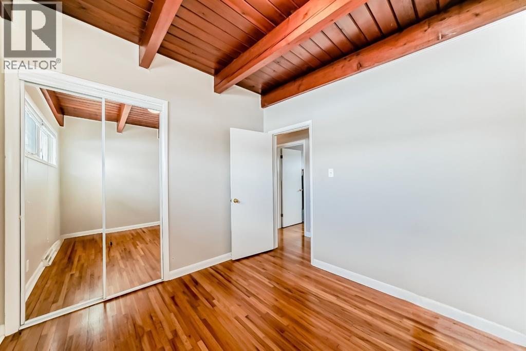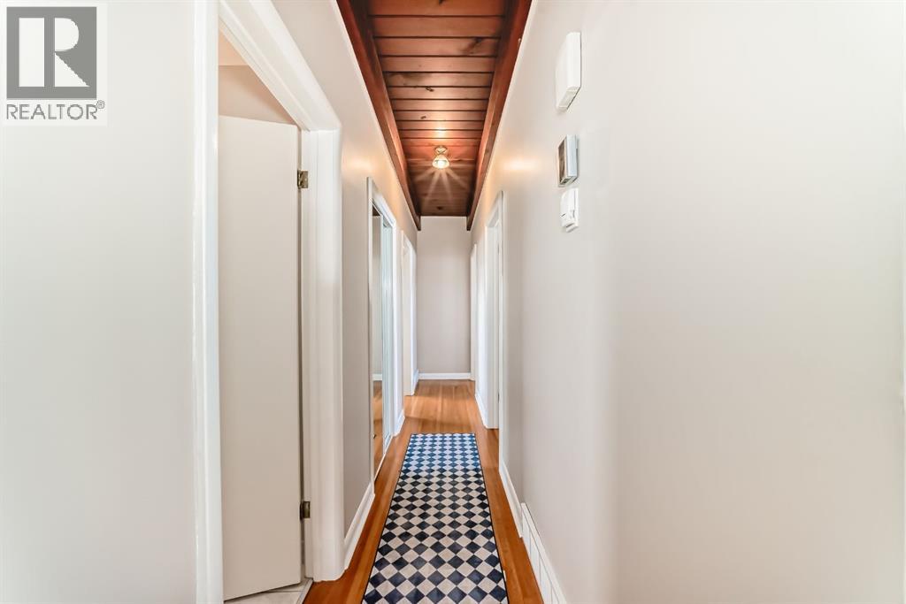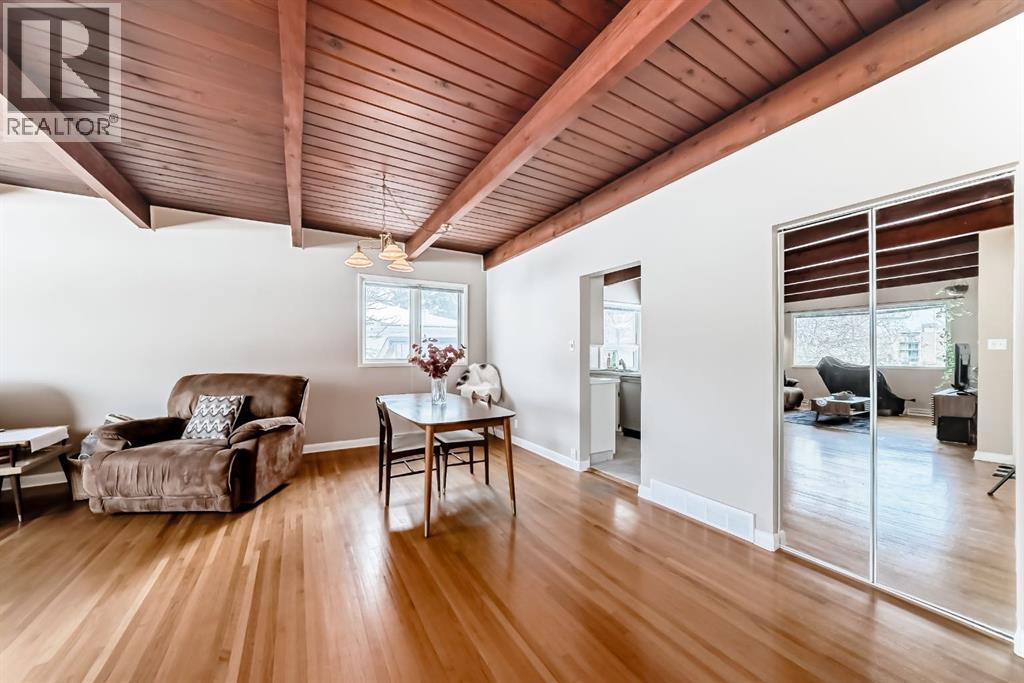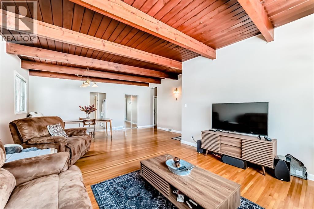 Welcome to this exceptional mid-century modern bungalow, beautifully maintained and full of character with timeless design and solid bones. Perfectly positioned directly across from a park and green space.. Showcasing timeless design, this home features stunning cedar plank ceilings with exposed beams and original hardwood flooring throughout the main level, creating warmth and architectural interest rarely found. Offering 4 bedrooms, a den, and 3 full bathrooms, the layout is both spacious and functional. The bright living and dining areas flow seamlessly, while the character-filled kitchen offers great potential and includes a charming eating nook. The primary bedroom is generously sized with large windows and a private 3-piece ensuite, complemented by two additional bedrooms and a full bathroom on the main floor—all bedrooms are bright, sun-filled spaces with oversized windows. The fully developed lower level features a separate entrance, a large family and recreation space, an additional bedroom, and a second room currently used as a bedroom (window does not meet egress requirements), plus a full bathroom and extensive storage. A large fenced yard, front patio for outdoor entertaining, and double detached garage complete this unique property. A rare opportunity to own a home with this much character and potential in an unbeatable location. Roof is in excellent condition and has just had full inspection and maintenance done. (id:63190)