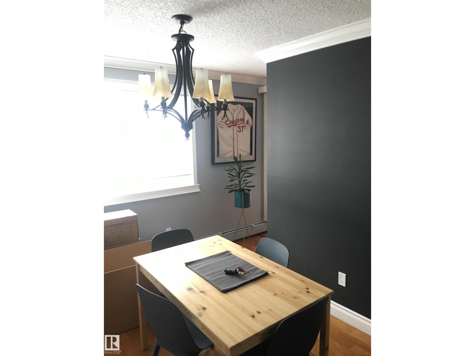 Beautiful one-bedroom unit in Strathcona, just off Whyte Ave. The condo shows very well and has been well maintained. Features 3½ oak hardwood and slate tile flooring throughout, along with an updated galley kitchen with stainless steel appliances, maple cabinetry, black granite counters, and an undermount sink. The kitchen is efficient in layout, with a separate dining area that opens to the living room, complete with an electric fireplace and feature wall. The bedroom offers a good-sized walk-in closet, and the 4-piece bath includes a deep jetted tub and in-suite washer/dryer combo. Additional coin laundry is available in the building. The building envelope (windows, doors, balconies, siding, and roof) was updated approximately 10 years ago. Excellent location within walking distance to Whyte Ave, the river valley, University of Alberta, transit, and amenities. Includes one outdoor parking stall. (id:63190)