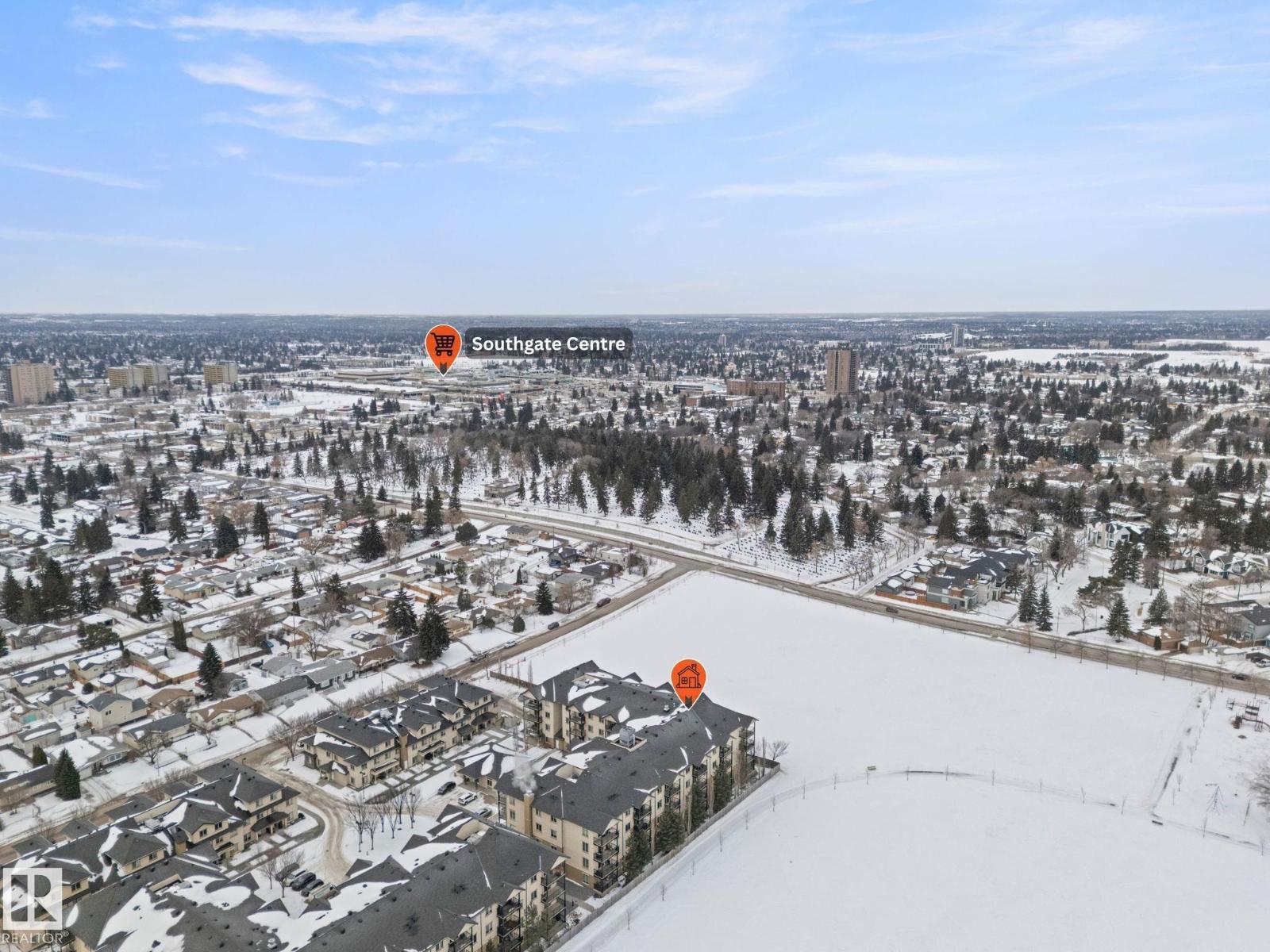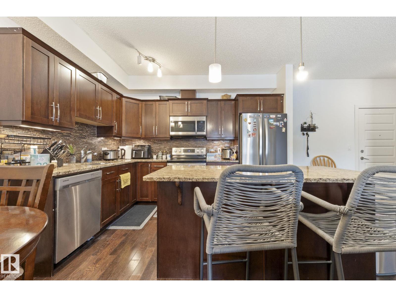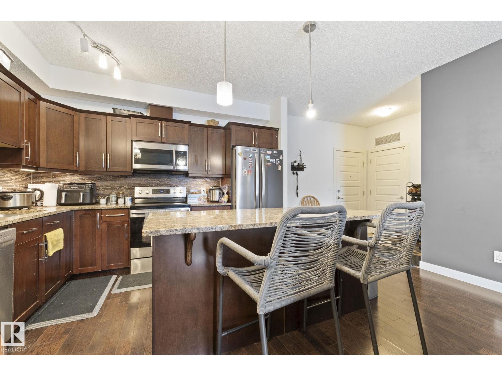 Welcome to Serenity Gardens in the desirable neighbourhood of Pleasantview — a move-in ready 2 bedroom, 2 bath, 933 sqft condo in a prime south Edmonton location. Featuring 9 ft ceilings, BRAND NEW LVP FLOORING INSTALLED IN APRIL 2026, granite countertops, air conditioning, and in-suite laundry, this bright open-concept layout offers both style and function. The kitchen includes a large island with eat-up bar and flows into a spacious living area that leads to a private treed balcony with natural gas BBQ hook-up. The primary suite offers a walk-through closet and 3-piece ensuite, while the second bedroom is privately positioned near a 4-piece bath. Complete with a titled underground heated parking stall and storage cage, and walking distance to schools, Southgate Centre, LRT, and transit with quick access to Whitemud Drive and Calgary Trail — this is convenient, low-maintenance living at its best. (id:63190)