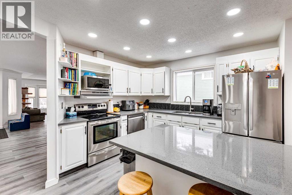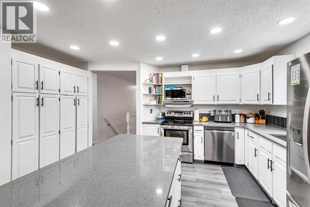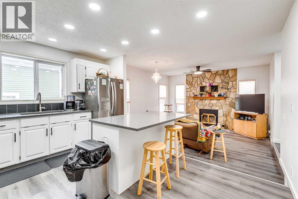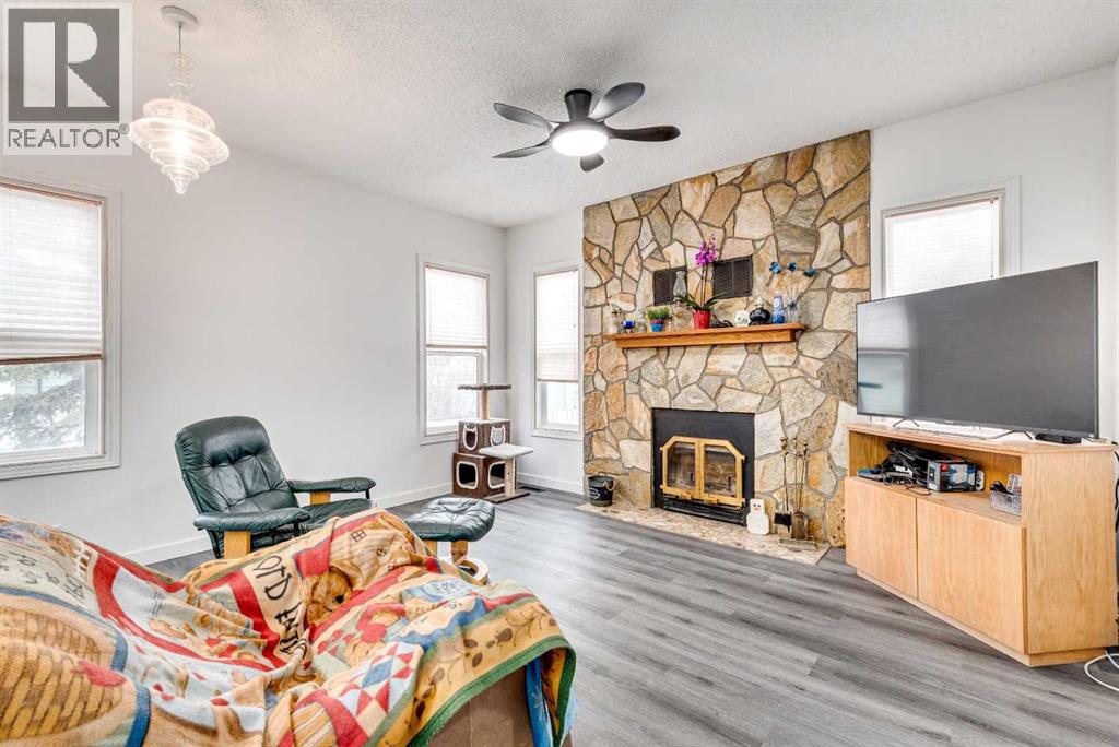 Welcome to this spacious and inviting family bungalow, offering 5 bedrooms and 3 bathrooms, this home provides room for everyone both inside and out. The main floor features a functional layout with front living room and dining room as well as access to the attached garage. You will enjoy preparing meals in the updated kitchen with convenient island with seating, quartz countertops and abundant storage, adjacent to a cozy sunken family room highlighted by a charming wood-burning fireplace. You’ll find 3 bedrooms on the main level, including a primary suite with a private 3-piece ensuite, as well as a bright 4-piece bathroom complete with a skylight. Recent updates including new flooring and fresh paint add a modern touch throughout. The fully developed basement offers incredible additional living space with an enormous rec room, complete with a comfortable sunken area with gas fireplace—perfect for relaxing or entertaining. Two additional bedrooms, a 3-piece bathroom, a cold room, and a large storage area with shelving add to the home’s functionality. In-floor heat in the basement ensures year-round comfort. Step outside the back entrance to enjoy the fully fenced yard and back deck—ideal for kids, pets, and outdoor gatherings. Located in the vibrant Town of Three Hills, you’ll appreciate access to multiple parks, playgrounds, and walking trails, along with excellent recreational facilities including an aquatic centre, arena, and community events year-round. The town also offers convenient downtown shopping, dining, and essential services, as well as a modern health centre providing a wide range of medical care for residents. (id:63190)