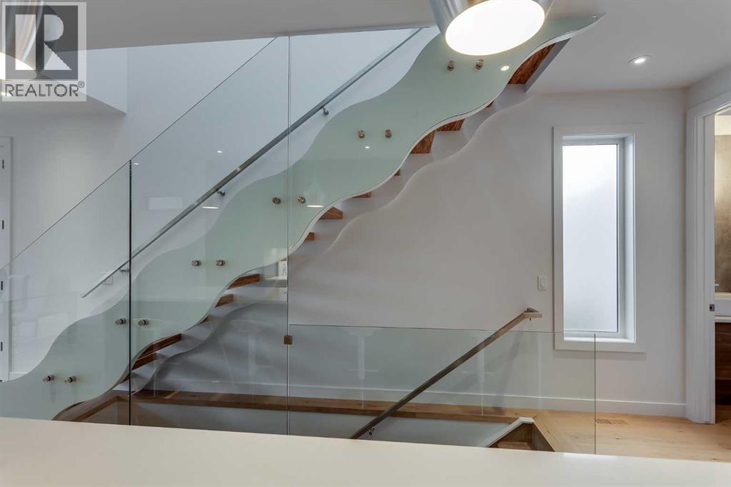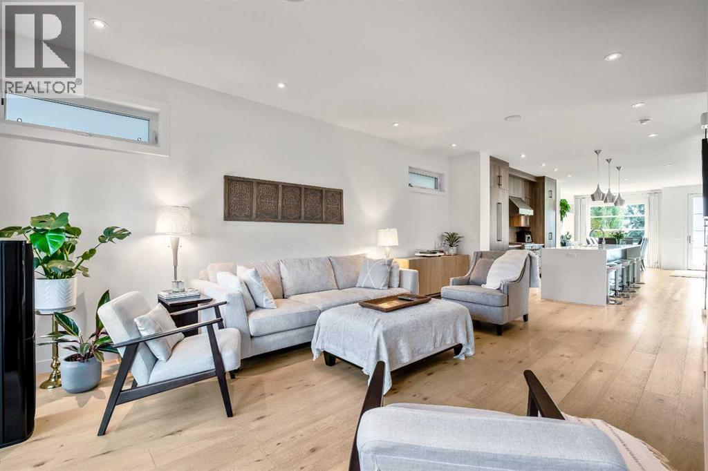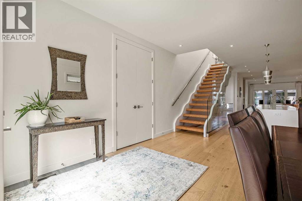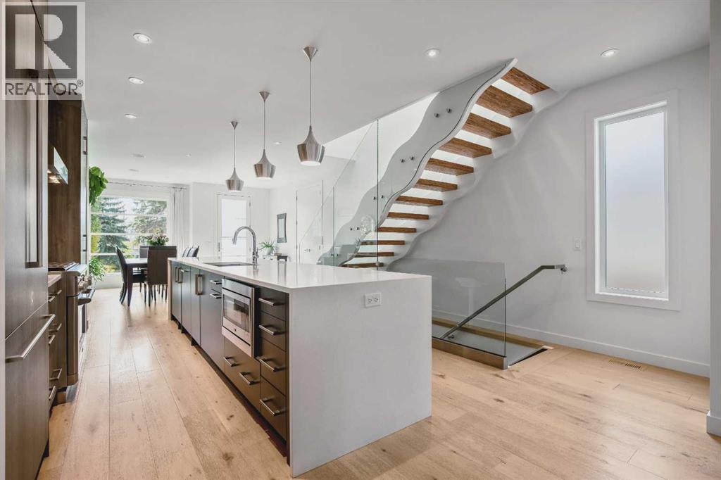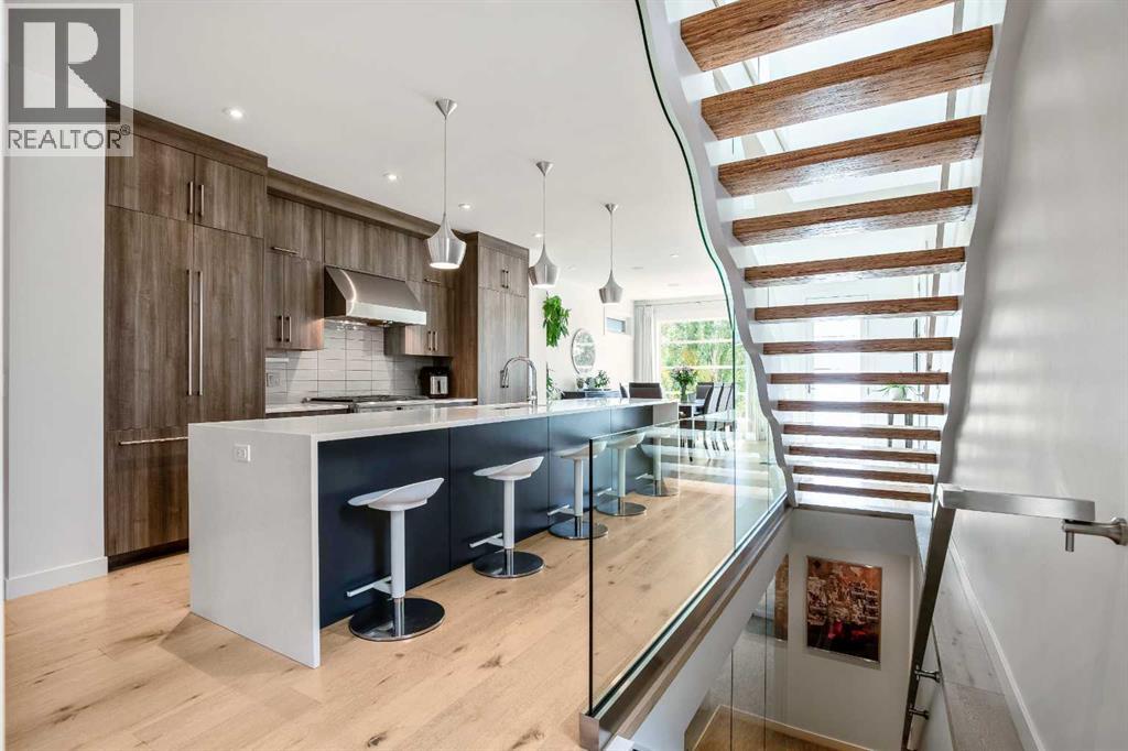 Perfectly positioned in desirable North Glenmore Park, this beautifully designed infill offers over 2,600 sq ft of developed living space just steps from the Glenmore Reservoir pathways and Aquatic Centre, along with some of Calgary’s best recreation amenities. Enjoy a highly walkable lifestyle with close proximity to the Glenmore Aquatic Centre, Stu Peppard Arena, the new Glenmore Twin Arenas (currently under construction), the outdoor track and field facility, Tennis Centre, Garrison Curling Club, Crowchild Twin Arenas, and the Elbow River pathway system connecting to the Glenmore Reservoir. Nearby golf options include Earl Grey Golf Club and Lakeview Golf Course, along with excellent local schools including two high schools and St. James School. Inside, the home showcases exceptional craftsmanship and modern design. The main level features 9-foot ceilings and engineered hardwood flooring throughout, creating a bright and welcoming atmosphere. A spacious front dining area flows seamlessly into the heart of the home — a chef-inspired kitchen complete with Bosch and GE appliances, gas cooktop, wine fridge, extended cabinetry, soft-close drawers, and a striking quartz waterfall island with seating for six. The lifestyle living room centers around a custom gas fireplace and includes built-in speakers, upper transom windows, and easy access to both the mudroom and outdoor living space. A striking architectural double-stringer staircase with exposed paralam treads and sleek glass railing leads to the upper level. Upstairs, vaulted ceilings and skylights create an open and airy feel. Two spacious children's bedrooms share a well-appointed 4-piece bathroom, while a convenient upper-level laundry room is tucked behind a stylish barn door. The front primary retreat offers a walk-in closet designed for two and a spa-inspired 5-piece ensuite featuring a freestanding tub, oversized tiled shower, and dual vanities.The fully developed lower level is ideal for entertaining, comp lete with a large recreation room, wet bar, fourth bedroom, 4-piece bathroom, and additional storage.Outside, the garden-sized deck provides the perfect space for summer evenings or cozy fall gatherings, while the double detached garage completes the property.With quick access to downtown and close proximity to local shops, Wild Rose Brewery, The Garrison Pub & Eatery, and the vibrant amenities of Marda Loop, this home offers the perfect balance of luxury living and an active Calgary lifestyle. (id:63190)