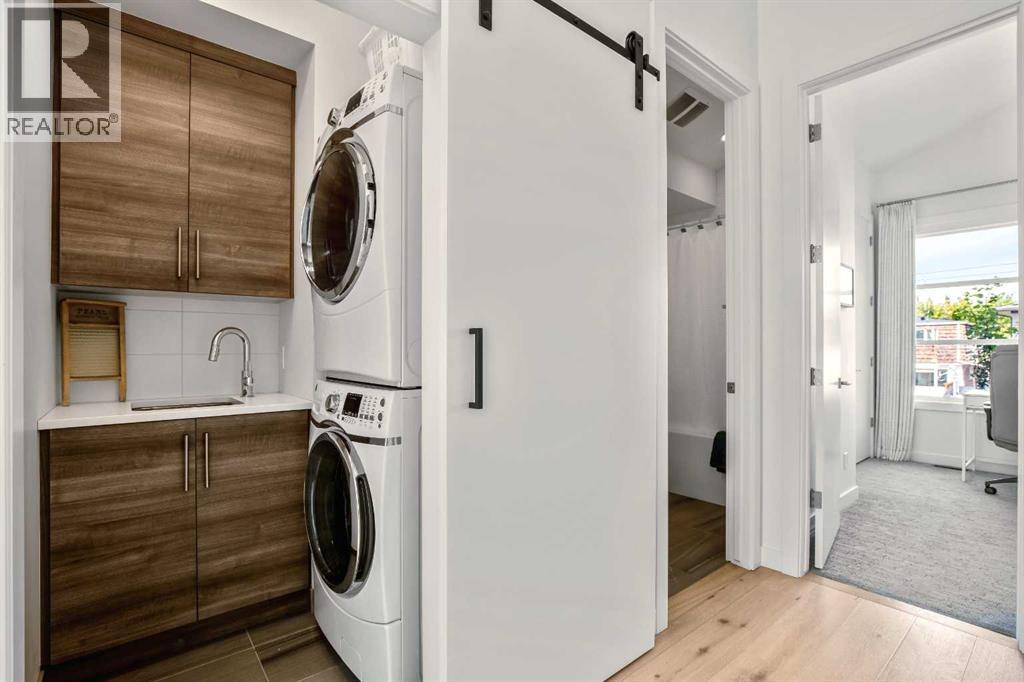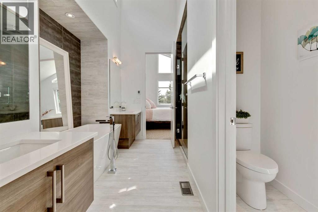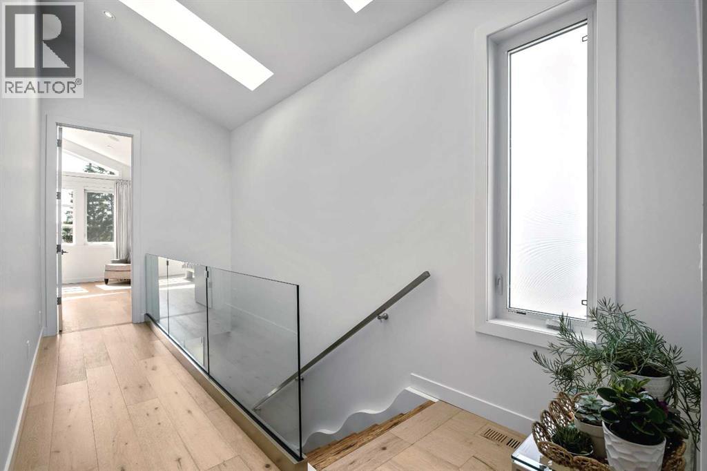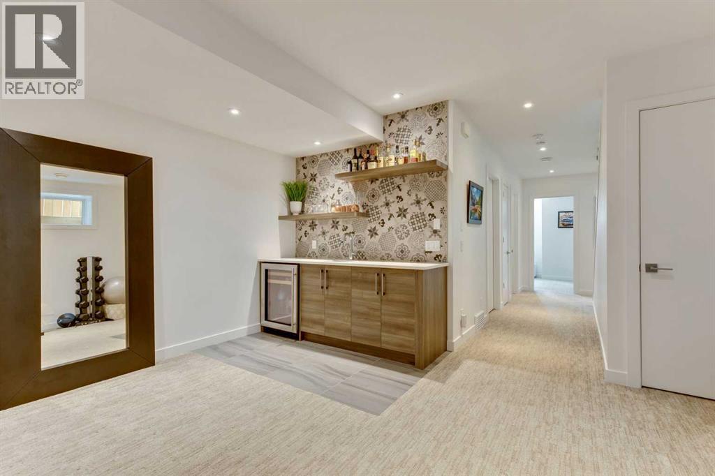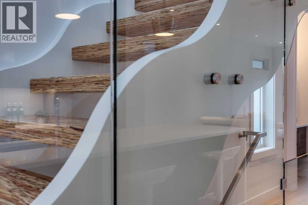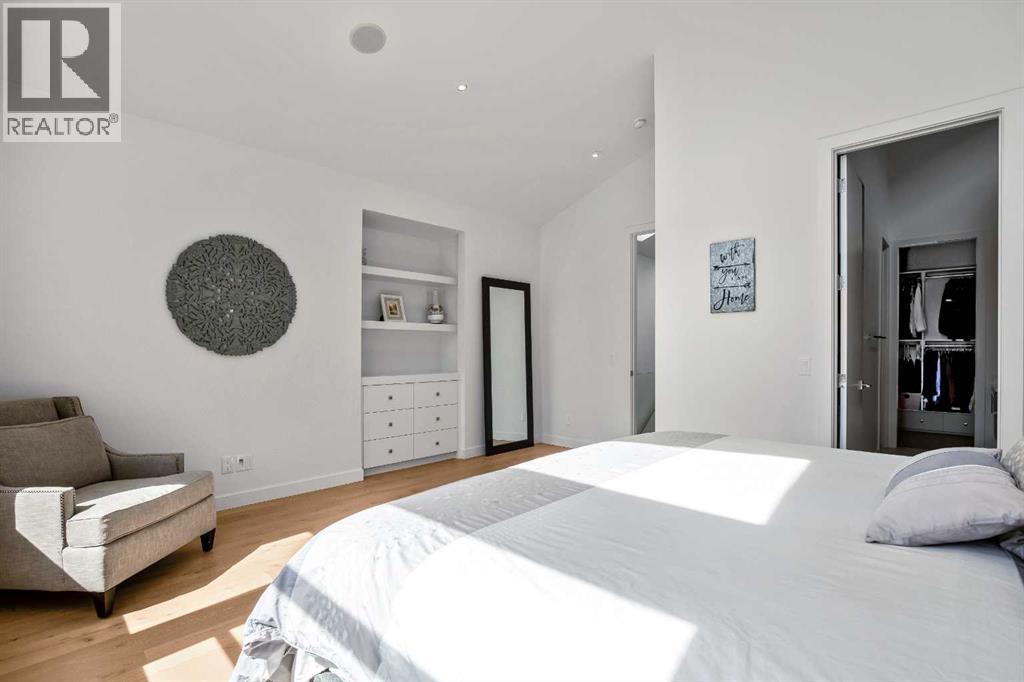 Perfectly positioned in desirable North Glenmore Park, this beautifully designed infill offers over 2,600 sq ft of developed living space just steps from the Glenmore Reservoir pathways and Aquatic Centre, along with some of Calgary’s best recreation amenities. Enjoy a highly walkable lifestyle with close proximity to the Glenmore Aquatic Centre, Stu Peppard Arena, the new Glenmore Twin Arenas (currently under construction), the outdoor track and field facility, Tennis Centre, Garrison Curling Club, Crowchild Twin Arenas, and the Elbow River pathway system connecting to the Glenmore Reservoir. Nearby golf options include Earl Grey Golf Club and Lakeview Golf Course, along with excellent local schools including two high schools and St. James School. Inside, the home showcases exceptional craftsmanship and modern design. The main level features 9-foot ceilings and engineered hardwood flooring throughout, creating a bright and welcoming atmosphere. A spacious front dining area flows seamlessly into the heart of the home — a chef-inspired kitchen complete with Bosch and GE appliances, gas cooktop, wine fridge, extended cabinetry, soft-close drawers, and a striking quartz waterfall island with seating for six. The lifestyle living room centers around a custom gas fireplace and includes built-in speakers, upper transom windows, and easy access to both the mudroom and outdoor living space. A striking architectural double-stringer staircase with exposed paralam treads and sleek glass railing leads to the upper level. Upstairs, vaulted ceilings and skylights create an open and airy feel. Two spacious children's bedrooms share a well-appointed 4-piece bathroom, while a convenient upper-level laundry room is tucked behind a stylish barn door. The front primary retreat offers a walk-in closet designed for two and a spa-inspired 5-piece ensuite featuring a freestanding tub, oversized tiled shower, and dual vanities.The fully developed lower level is ideal for entertaining, comp lete with a large recreation room, wet bar, fourth bedroom, 4-piece bathroom, and additional storage.Outside, the garden-sized deck provides the perfect space for summer evenings or cozy fall gatherings, while the double detached garage completes the property.With quick access to downtown and close proximity to local shops, Wild Rose Brewery, The Garrison Pub & Eatery, and the vibrant amenities of Marda Loop, this home offers the perfect balance of luxury living and an active Calgary lifestyle. (id:63190)