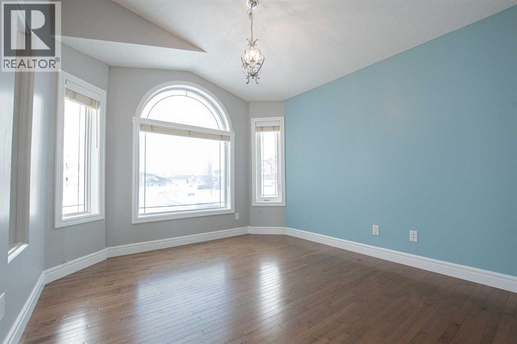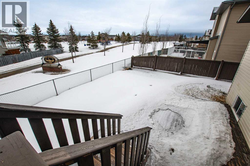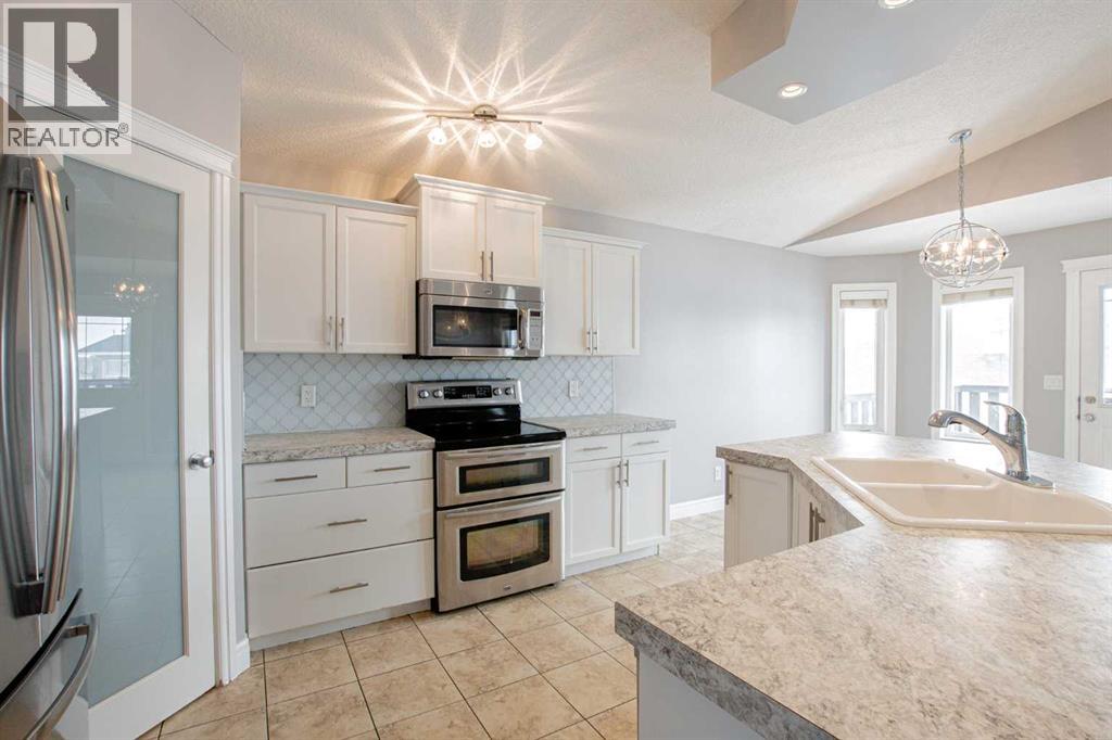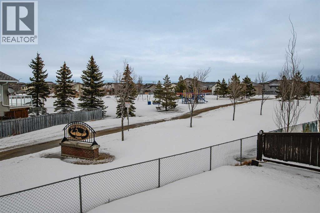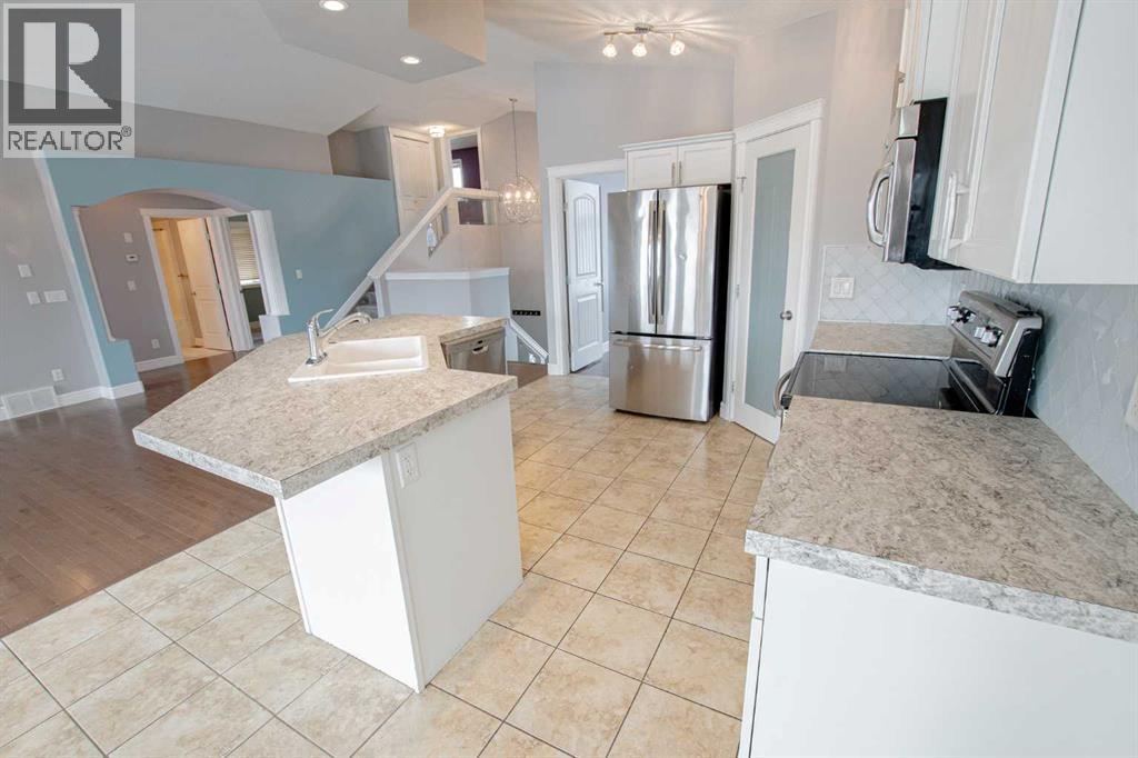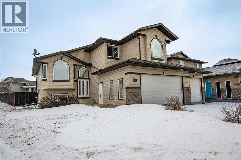 Backing onto Pat Gorman Park with no rear neighbours, this fully developed 1,636 sq. ft. modified bi-level offers a functional layout and family-friendly setting.Featuring 5 bedrooms, 3 bathrooms, and a den, the main floor presents an open-concept design with a bright kitchen complete with espresso cabinetry, stainless steel appliances, corner pantry, tiled backsplash, and a central island with eating bar. The dining area provides direct access to a two-tiered deck with views of the park.The living room showcases vaulted ceilings and a gas fireplace. The primary bedroom is privately located on its own level and includes a walk-in closet and ensuite with double sinks, jetted tub, and separate shower.The fully developed basement offers a large family room, two bedrooms, and a full bathroom.Heated triple car garage adds to the functionality and appeal of this property. (id:63190)