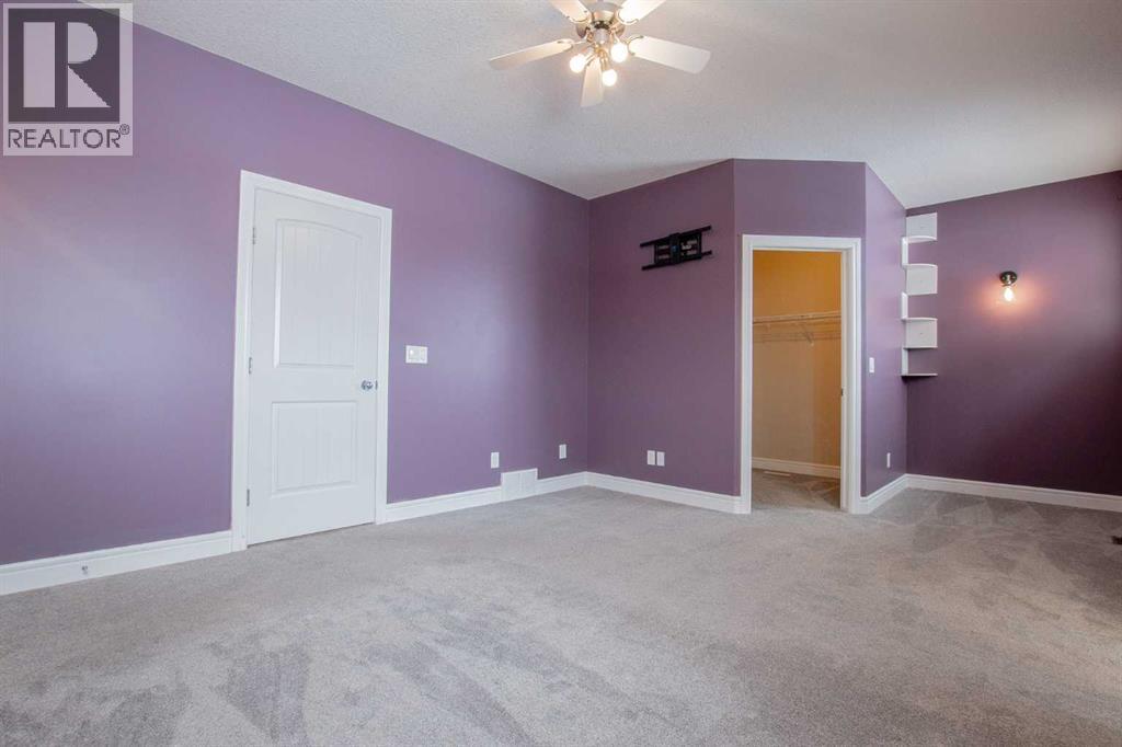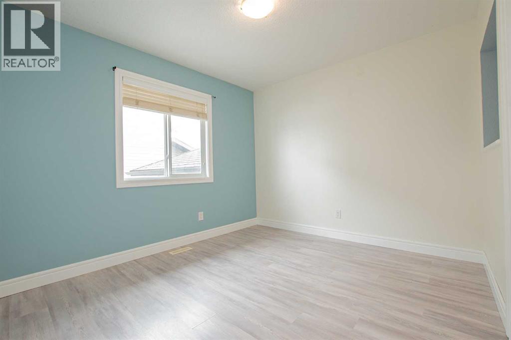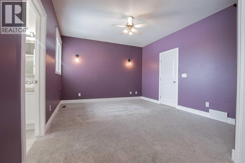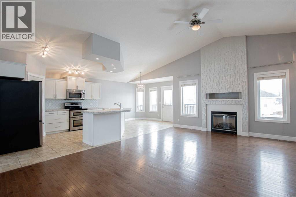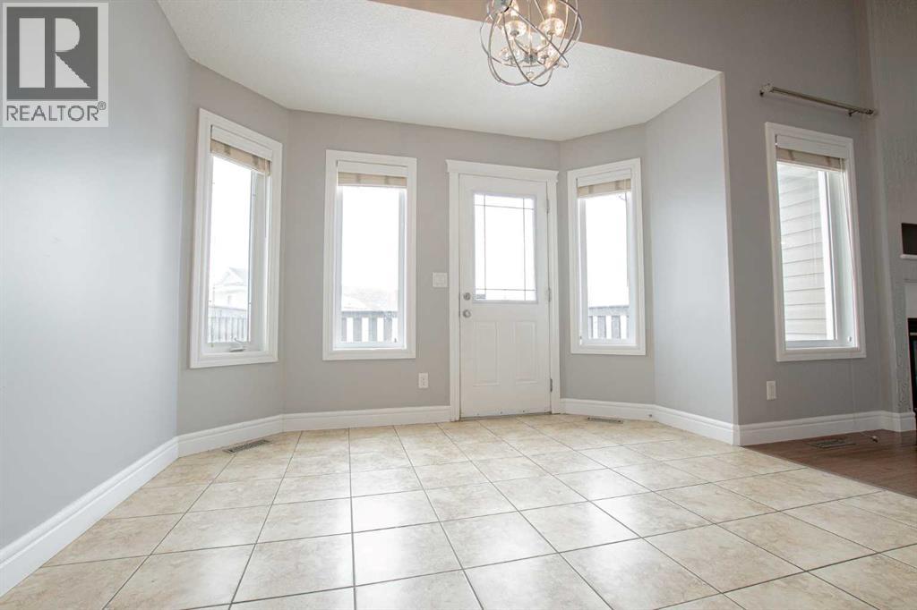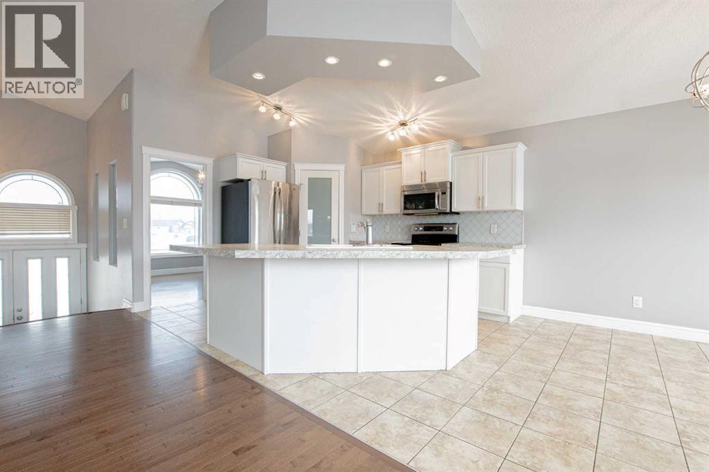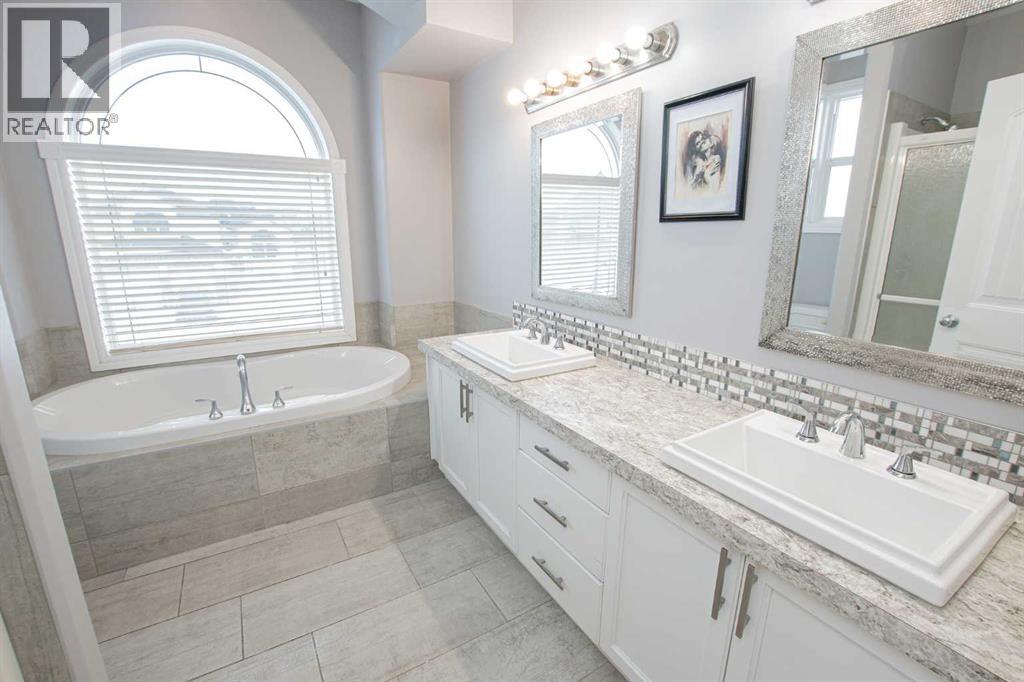 Backing onto Pat Gorman Park with no rear neighbours, this fully developed 1,636 sq. ft. modified bi-level offers a functional layout and family-friendly setting.Featuring 5 bedrooms, 3 bathrooms, and a den, the main floor presents an open-concept design with a bright kitchen complete with espresso cabinetry, stainless steel appliances, corner pantry, tiled backsplash, and a central island with eating bar. The dining area provides direct access to a two-tiered deck with views of the park.The living room showcases vaulted ceilings and a gas fireplace. The primary bedroom is privately located on its own level and includes a walk-in closet and ensuite with double sinks, jetted tub, and separate shower.The fully developed basement offers a large family room, two bedrooms, and a full bathroom.Heated triple car garage adds to the functionality and appeal of this property. (id:63190)