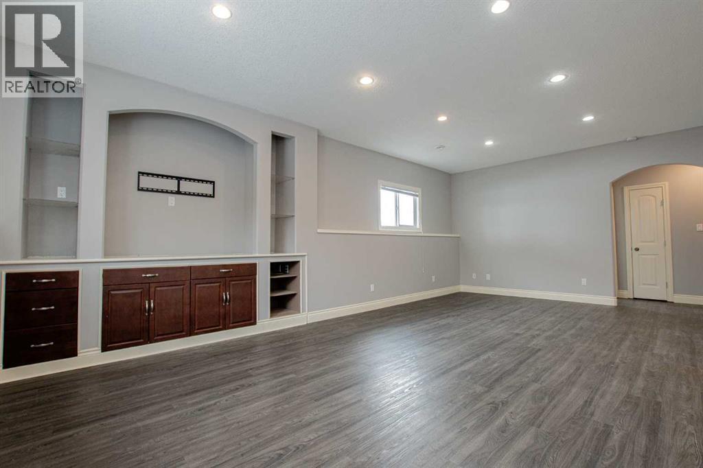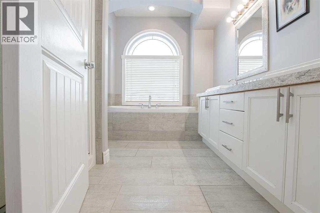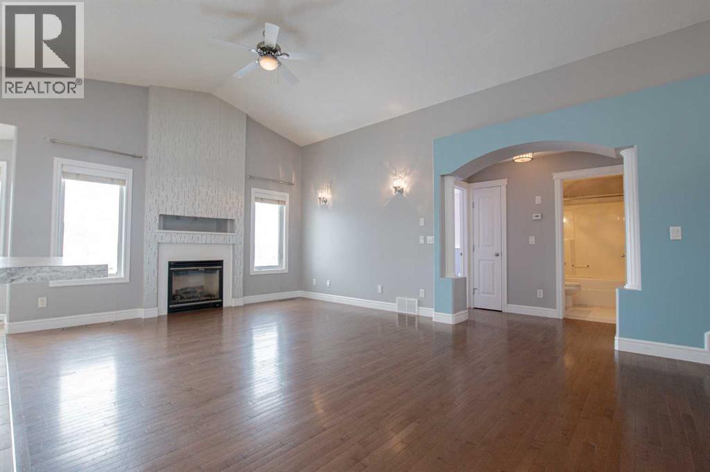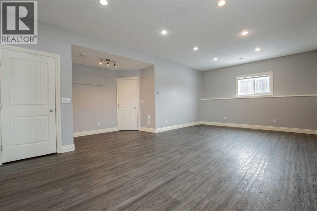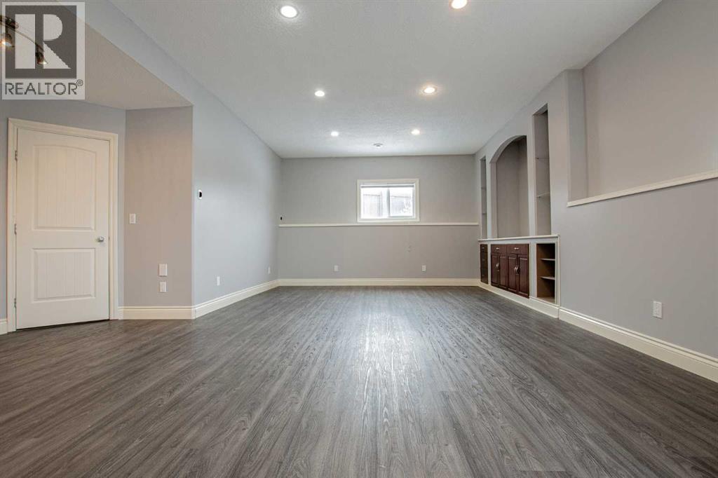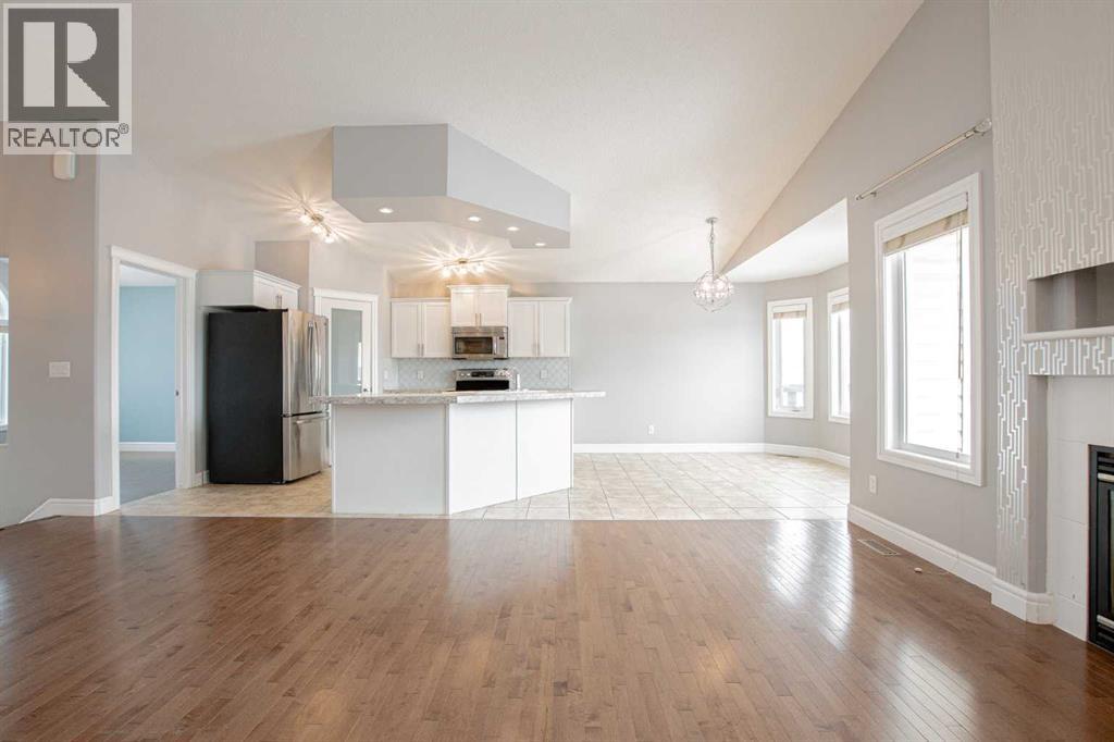 Backing onto Pat Gorman Park with no rear neighbours, this fully developed 1,636 sq. ft. modified bi-level offers a functional layout and family-friendly setting.Featuring 5 bedrooms, 3 bathrooms, and a den, the main floor presents an open-concept design with a bright kitchen complete with espresso cabinetry, stainless steel appliances, corner pantry, tiled backsplash, and a central island with eating bar. The dining area provides direct access to a two-tiered deck with views of the park.The living room showcases vaulted ceilings and a gas fireplace. The primary bedroom is privately located on its own level and includes a walk-in closet and ensuite with double sinks, jetted tub, and separate shower.The fully developed basement offers a large family room, two bedrooms, and a full bathroom.Heated triple car garage adds to the functionality and appeal of this property. (id:63190)