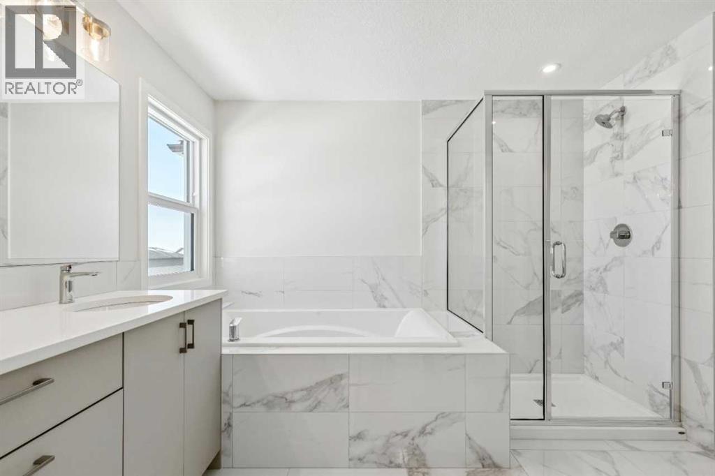 Step into Cedarglen Homes beautifully designed newest quick possession where style, function, and everyday comfort come together seamlessly. The heart of the home is a stunning galley style kitchen with a specious 9' island that's perfect for entertaining family and friends. The main floor impresses with soaring 9' ceilings and matching 8' doors, a bright office with lots of natural light, and a separate mudroom complete with built in bench & coat hooks to keep you organized. Just off the dining area is an elegant electric fireplace that creates a warm inviting space for cozy evenings. Step outside to your elevated deck with gas line ready for effortless summer barbecues. Upstairs offers a spacious central bonus room ideal for relaxing or gathering. The thoughtfully designed compartment-style bathroom offers double sinks and a private water closet. Everyday living made easier with walk through laundry off closet. (id:63190)