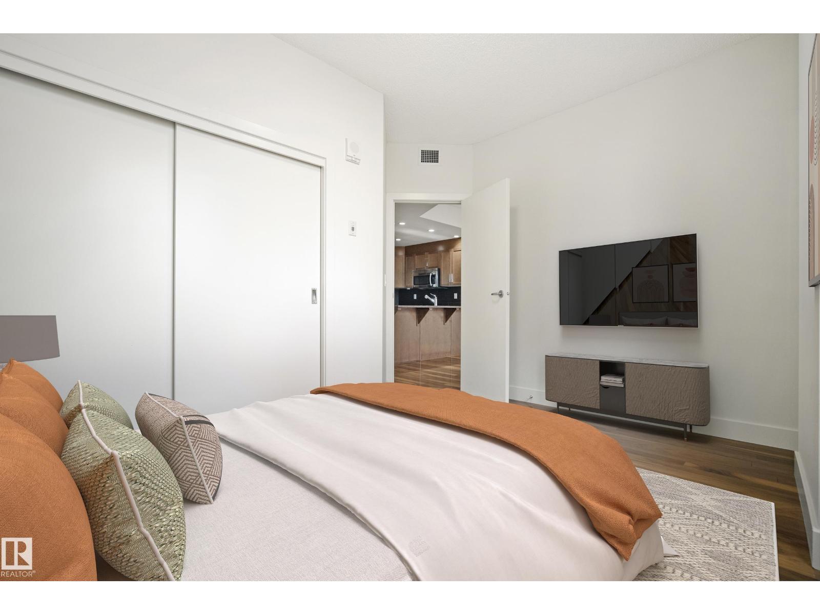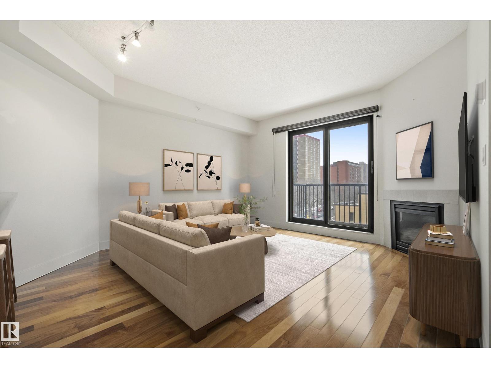 Urban Sophistication on the Victoria Promenade. Experience the ultimate lifestyle at Illuminada II, where the River Valley and Victoria Golf Course serve as your backyard. This refined 1-bedroom condo is a masterclass in efficient luxury, perfect for those seeking a high-end, lock-and-go residence in Edmonton’s premier walking district. The interior features soaring 9' ceilings and a wall of floor-to-ceiling windows, bathing the space in natural light. The open-concept layout is anchored by a gourmet kitchen with dark cabinetry and a social eating bar, leading into a living area with a cozy gas fireplace. Enjoy the peace of a concrete building with superior soundproofing and year-round comfort via a modern HVAC system. Pet-friendly (w/ board approval) and just steps from the elite dining and boutiques of 124th Street. Simply the best of urban living. *Some Photo Are Virtually Staged* (id:63190)