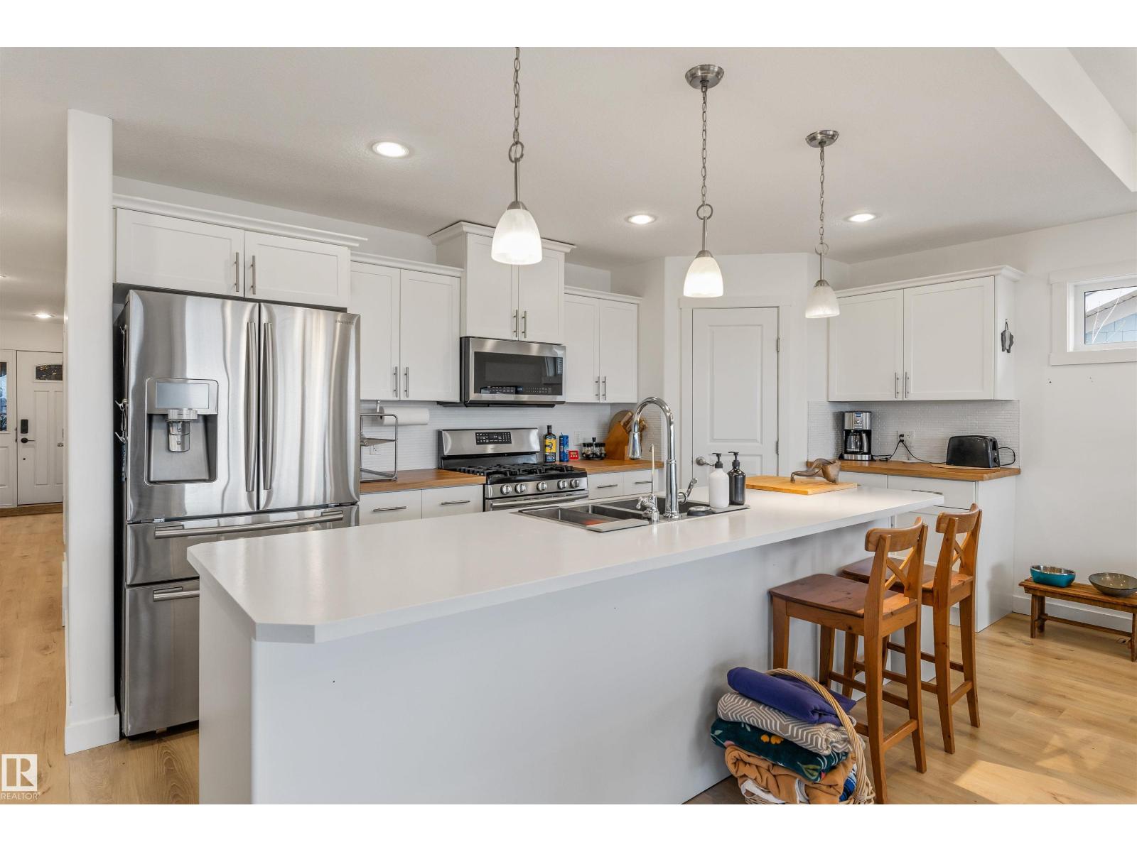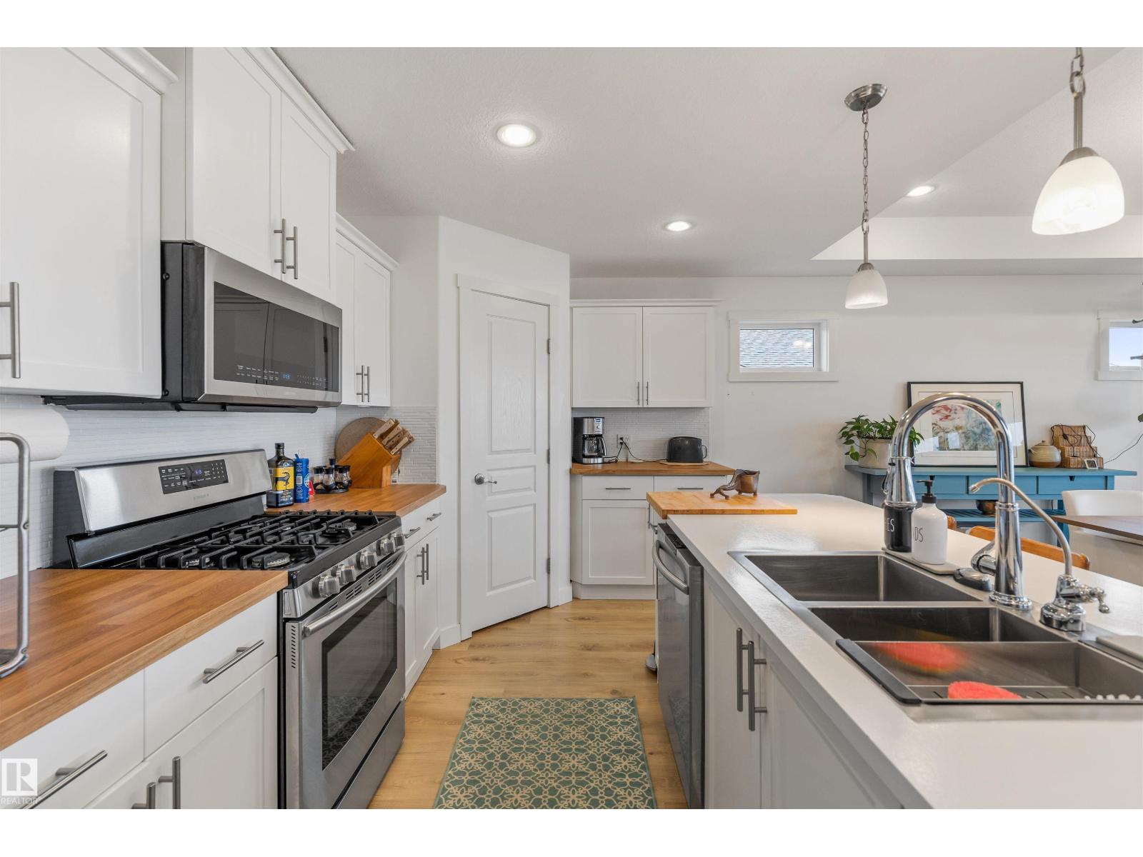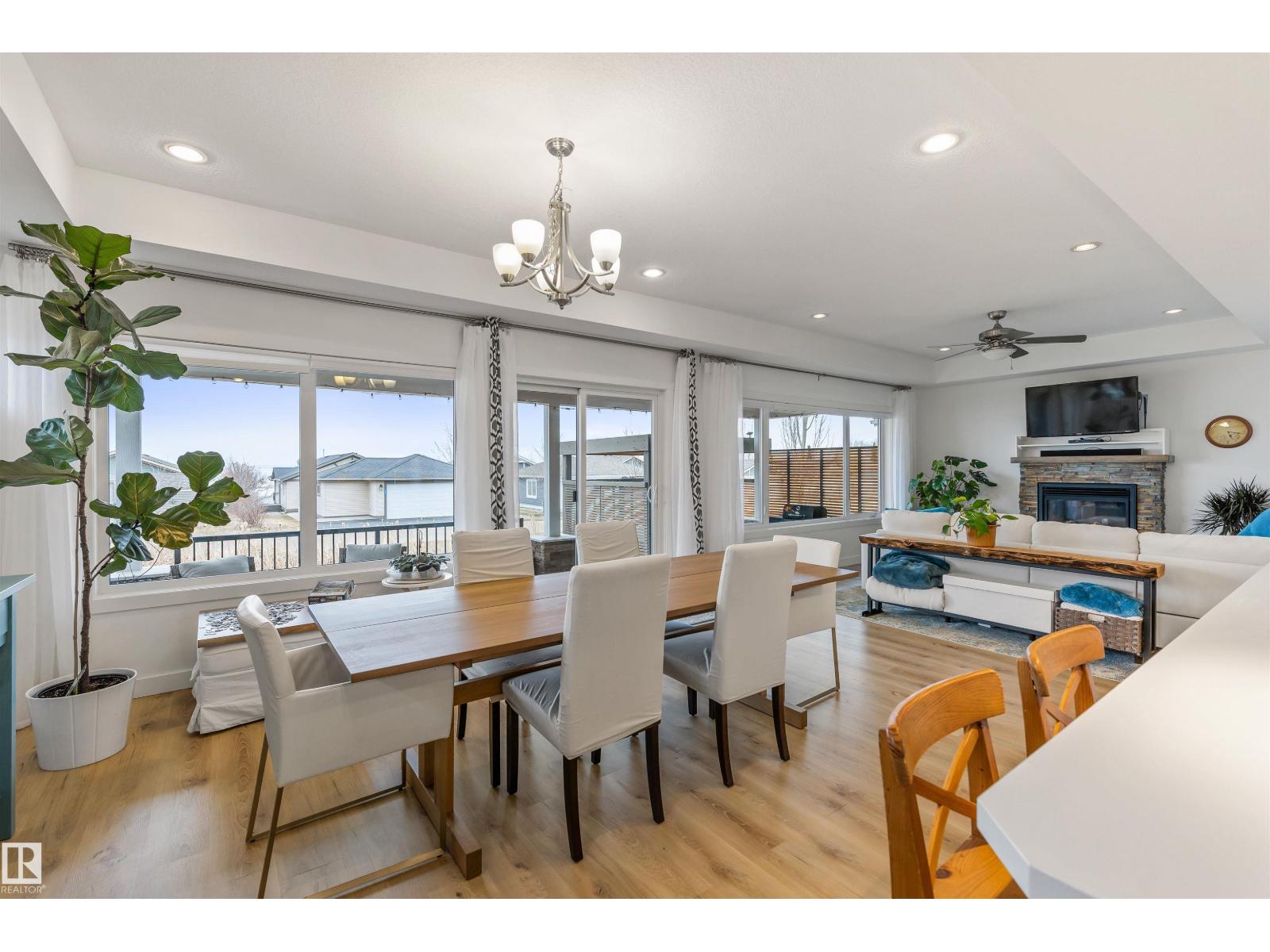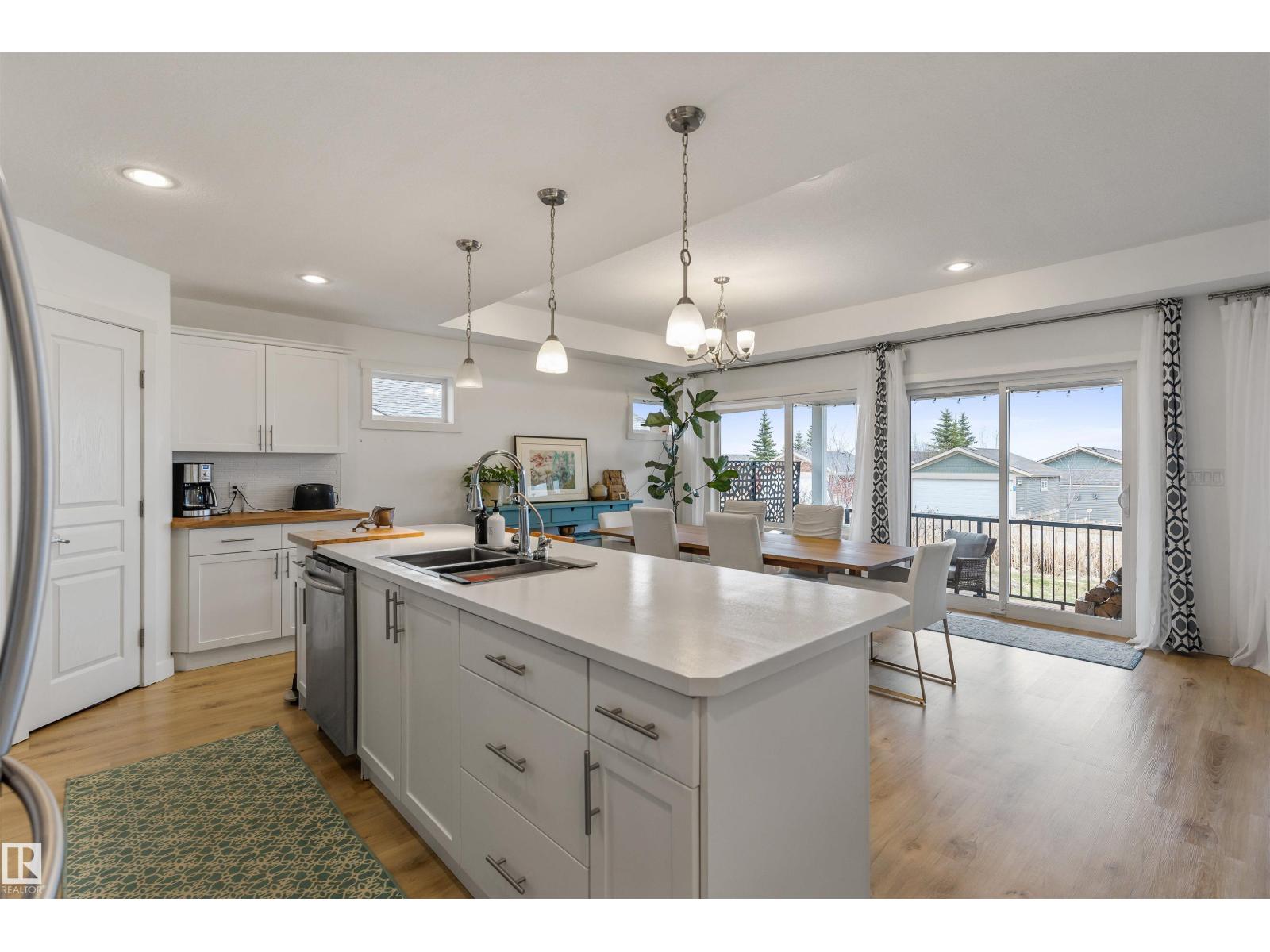 Discover this stunning bungalow in the Estates At Water's Edge. The kitchen is spacious and features white cabinetry, tile backsplash, stainless steel appliances (including a GAS STOVE), a huge eating bar island, corner pantry and an abundance of storage! The living room features a GAS FIREPLACE and has patio doors. The covered deck faces south with partial lake views and a private hot tub! The primary bedroom has a three-piece ensuite and a walk-in closet. Two additional bedrooms, a four piece main bathroom and a laundry room with sink complete the main floor. Crafted directly on the property, this home includes a solid concrete crawlspace, offering generous room for storage. A double attached HEATED OVERSIZED GARAGE completes this home. Additional features include VINYL PLANK flooring throughout the main floor and on demand hot water! A gated community, municipal water/sewer, private marina, outdoor heated pool, beachfront park and clubhouse are all amazing features in Estates at Water's Edge! (id:63190)
