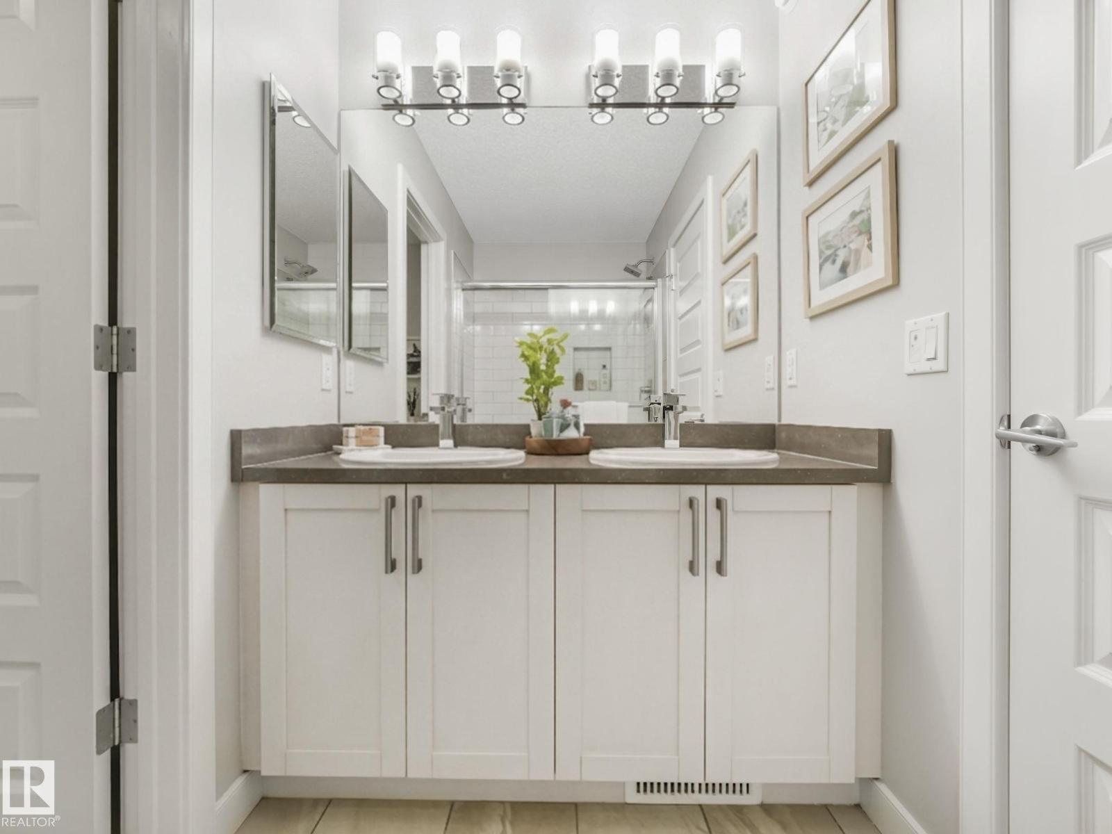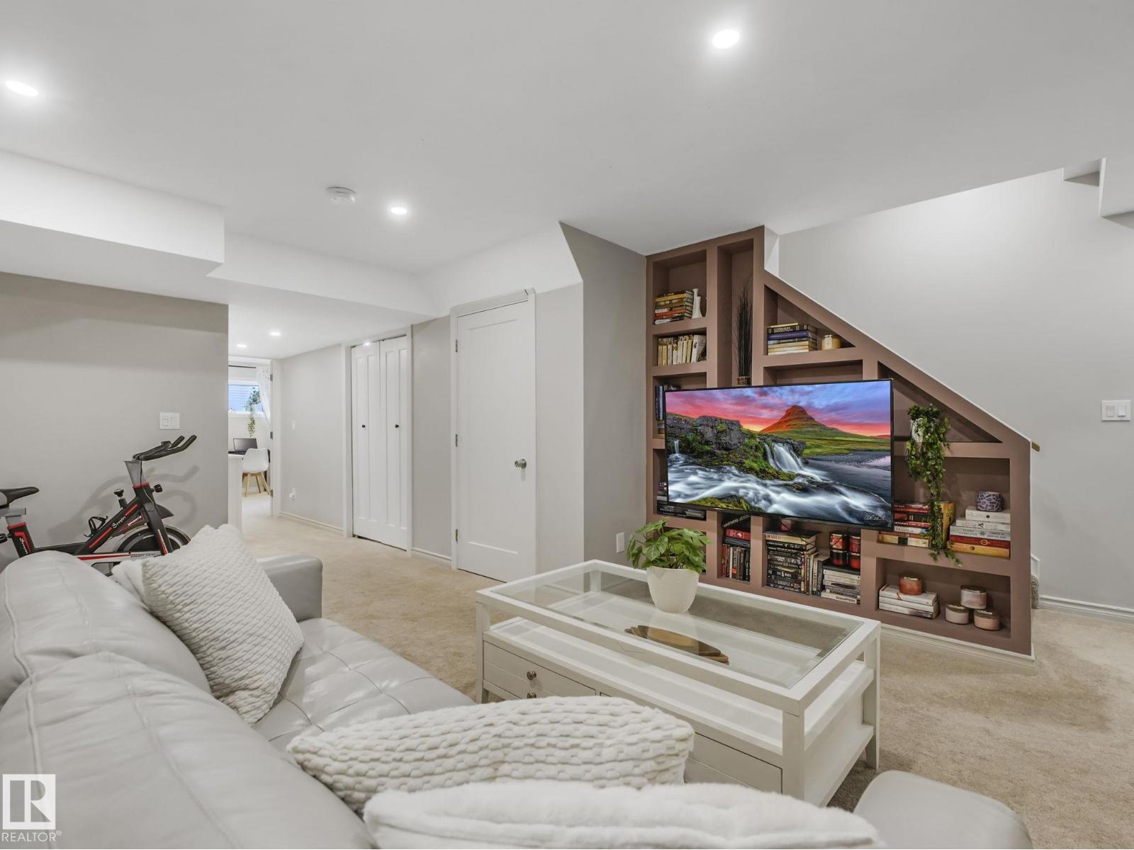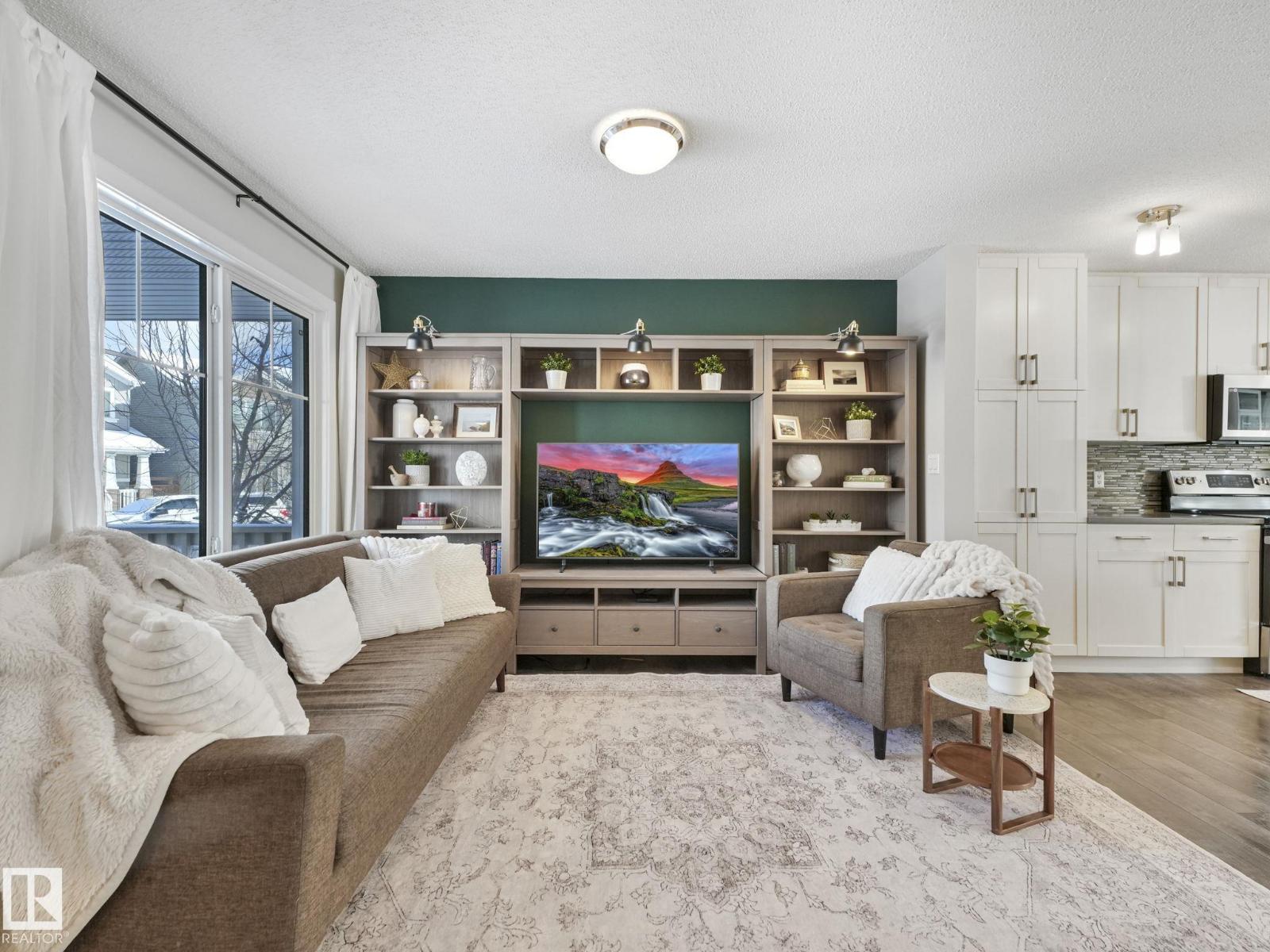 Designer dream home in sought after Chappelle offering nearly 2200 sq ft of finished living space across 3 levels! The bright airy main floor features an upgraded kitchen with large island, breakfast bar, quartz counters, tile backsplash & ceiling height cabinetry, plus newer microwave hood fan & dishwasher approx 1.5 years old. Enjoy two separate living spaces including one with electric fireplace, perfect for relaxing, kids play area or home office. Fresh paint & custom wainscoting add style throughout. The fully finished basement offers a spacious rec room with custom built in bookcases, full bath & large bedroom. Upstairs you will find a primary suite with WIC, 4 pc ensuite with double sinks & large shower, 2 additional bedrooms, 4 pc bath & convenient laundry. Outside enjoy a 3836 square foot PIE SHAPED lot, newly built double garage, extended concrete parking pad & raised garden beds. Located in a family friendly HOA community with parks, trails & play spaces nearby! (id:63190)