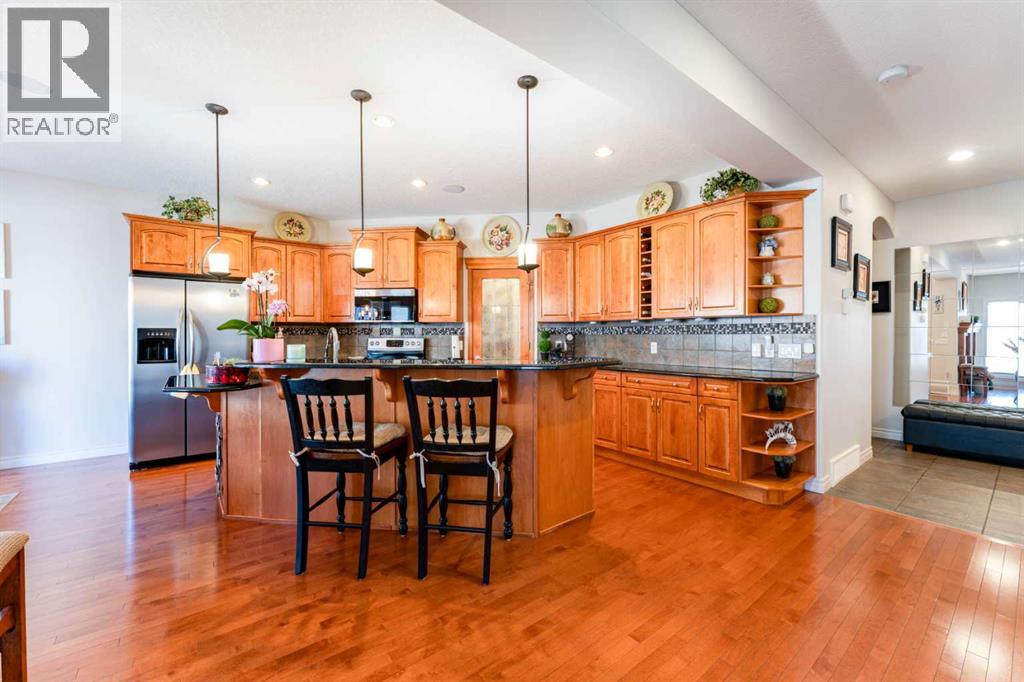 Welcome to 14 Bridlerange Circle SW! Step into this BEAUTIFULLY UPGRADED and SPACIOUS 2-storey home offering 2,945.33 sq ft of total living space, including a fully developed basement—thoughtfully designed for growing families. From the moment you arrive, the charming curb appeal, enhanced by stone accents, vinyl siding, and upgraded front railings, along with a double attached garage, sets the tone for what’s inside. The welcoming foyer opens into a bright, open-concept main floor featuring 9-FOOT CEILINGS and rich HARDWOOD FLOORING that flows throughout the main living areas, creating an airy and elegant feel. The spacious living room is anchored by a beautifully upgraded DOUBLE-SIDED FIREPLACE with modern tile surround and mantle, seamlessly connecting to the dining area and creating a warm, inviting atmosphere for both everyday living and entertaining. The heart of the home is the stunning fully UPGRADED KITCHEN, showcasing refinished cabinetry, stylish backsplash, upgraded countertops, a raised eating bar, and a built-in wine bar, perfectly blending functionality and style. A BRAND-NEW REFRIGERATOR adds even more value. The adjacent dining area is ideal for hosting family dinners and special occasions. A 2-piece bathroom, main floor laundry, and direct access to the double attached garage add everyday convenience. Step outside to your newly built 10’ x 20’ deck with durable steel railings, complemented by a spacious private backyard—perfect for summer BBQs, entertaining, or simply relaxing. Enjoy evenings under the OUTDOOR SMART CEILING LIGHTING SYSTEM, adding both ambiance and modern convenience to your outdoor space. Upstairs, you’ll find a rare and highly desirable bonus family room—perfect for movie nights, a kids’ play area, or a second living space. The UPGRADED STAIRCASE with modern railings adds a stylish architectural touch. The primary retreat offers a peaceful escape, complete with a walk-in closet and a luxurious 5-piece ensuite featuring double sin ks, a soaker tub, and a separate shower. Two additional generously sized bedrooms and a full 4-piece bathroom complete the upper level—perfect for a growing family. The FULLY DEVELOPED BASEMENT expands your living space with a large recreation room featuring a wet bar—ideal for entertaining or family fun nights. You’ll also find two additional bedrooms, a home office, and a 3-piece bathroom, offering incredible flexibility for guests, teens, or multi-generational living. Located in the highly sought-after community of BRIDLEWOOD, this home offers a family-friendly lifestyle with UNBEATABLE CONVENIENCE: walking distance to parks, playgrounds, and pathways, THREE EXCELLENT SCHOOLS and daycare options, quick connections to major routes for commuting, and overall a safe, welcoming neighborhood. With its thoughtful upgrades, modern finishes, and expansive living spaces, this home delivers exceptional value and comfort for today’s growing family. (id:63190)
