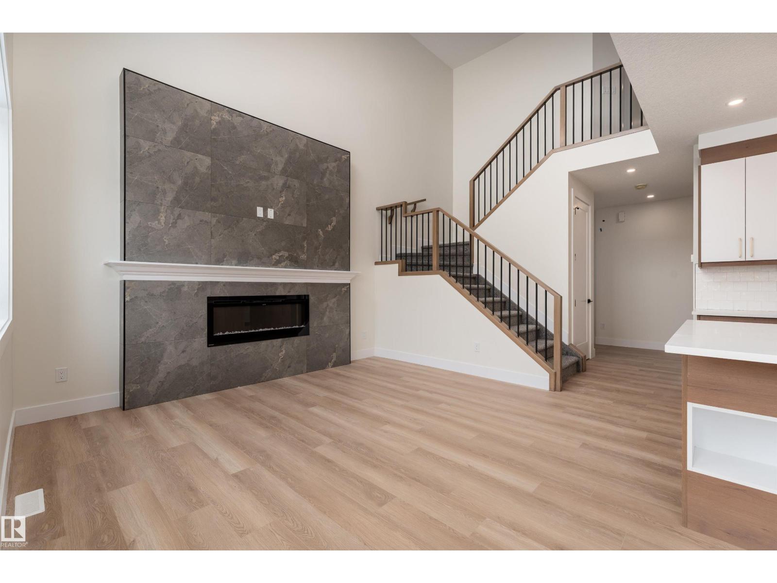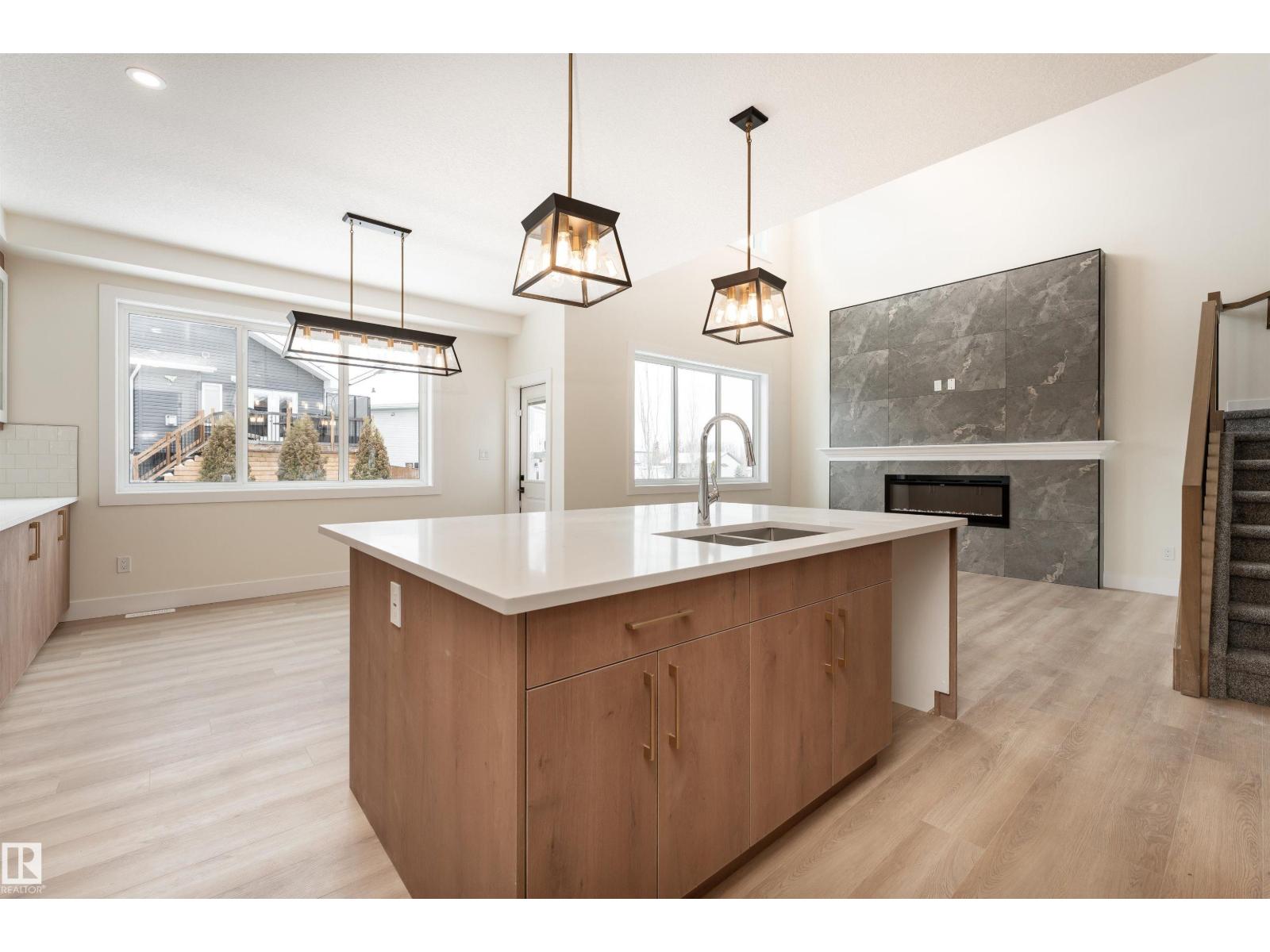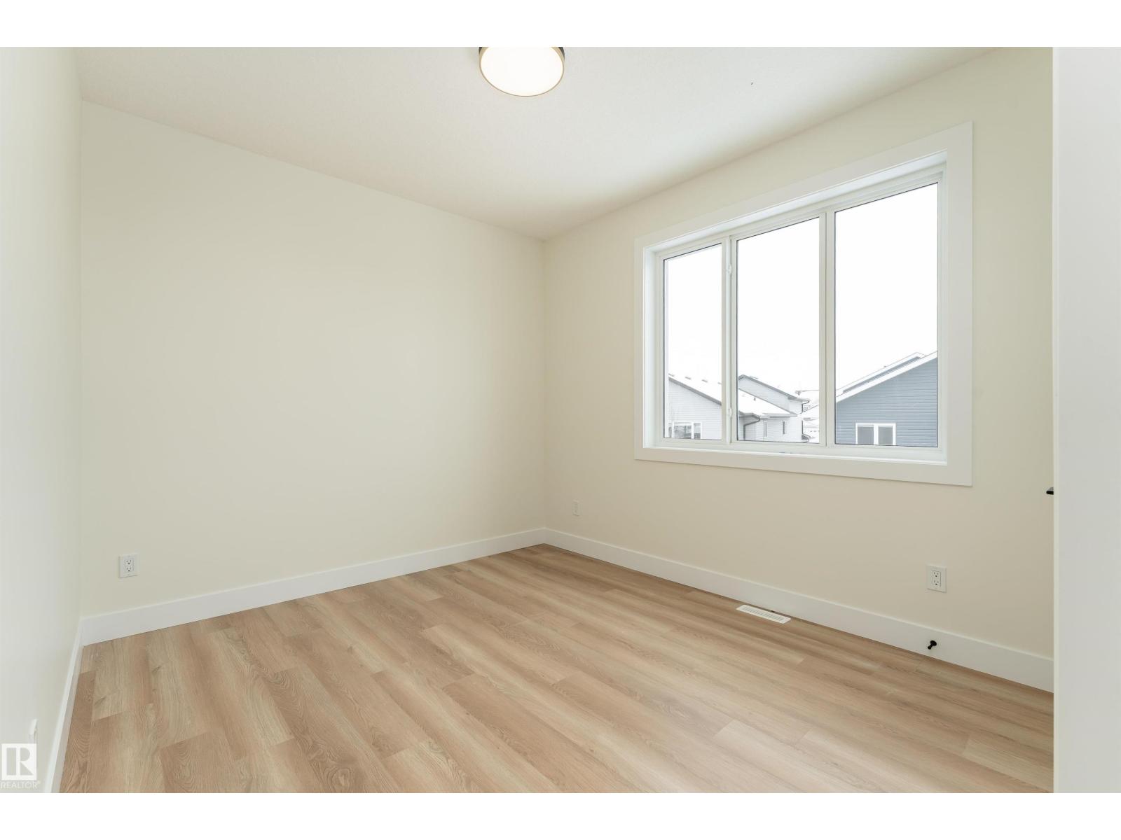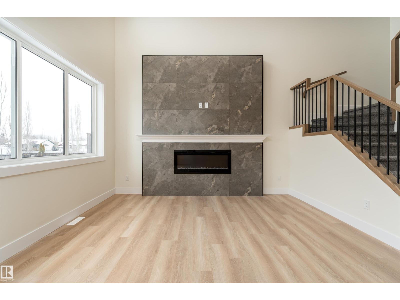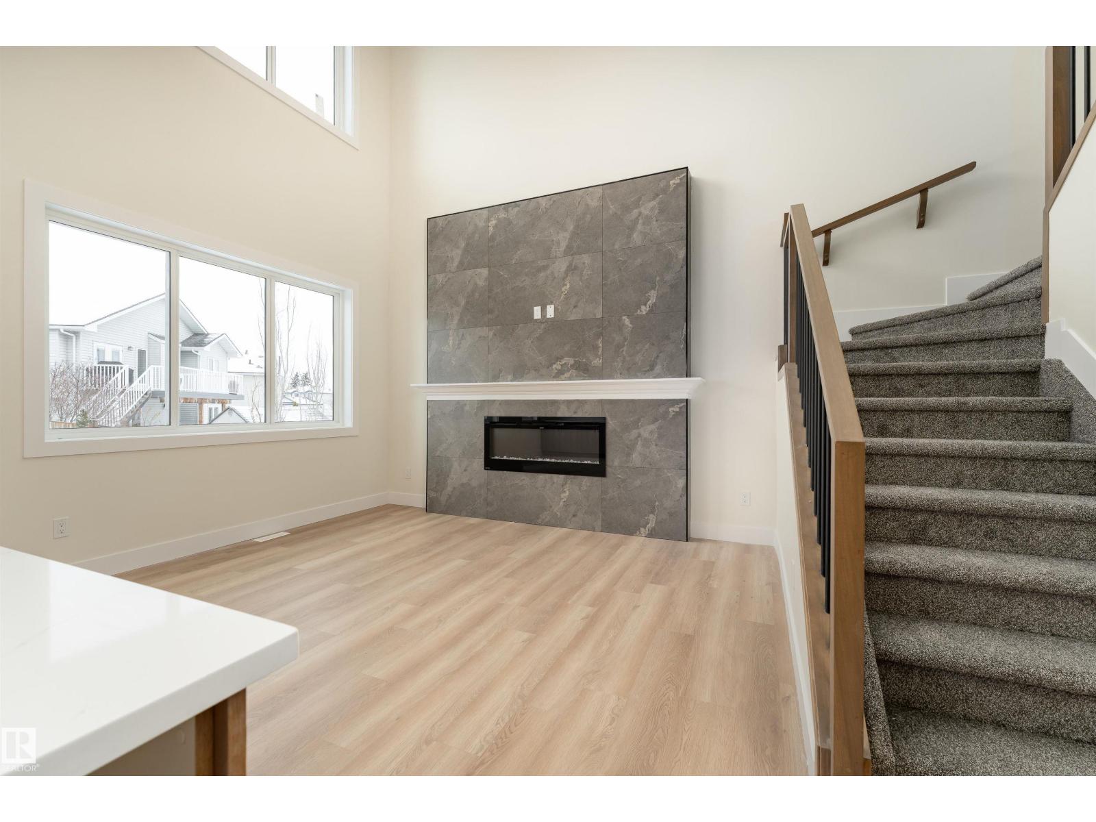 Bright, spacious, and thoughtfully designed, this brand new 2,145 sq ft two storey home in Gibbons offers modern family living with room to grow. The main floor features an open living room with a tile surround fireplace, a spacious dining area, and a modern kitchen with a large island and pantry, all filled with natural light from oversized windows. A versatile den or bedroom and a convenient two piece bathroom complete the level. Upstairs offers a generous family room, a private primary suite with a five piece ensuite and walk in closet, two additional bedrooms, a four piece bathroom, and upper level laundry. The unfinished basement with a separate side entrance provides excellent future suite potential. An oversized attached triple garage, spacious yard, and east facing front with a west facing backyard deliver incredible sunlight throughout the day. Located near playgrounds, schools, shopping, and public transportation, this never lived in home is ready to be made your own. (id:63190)