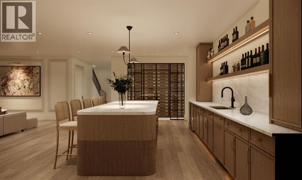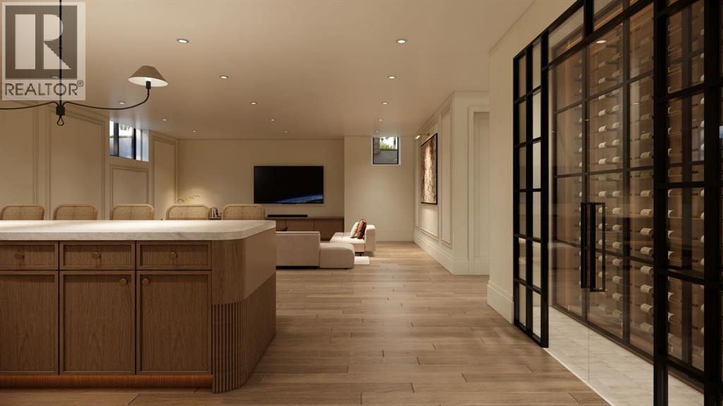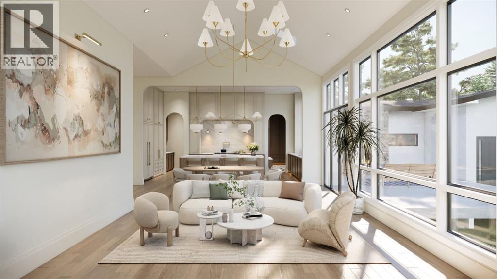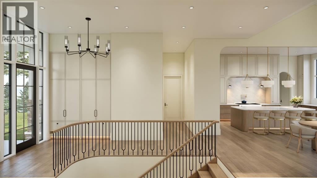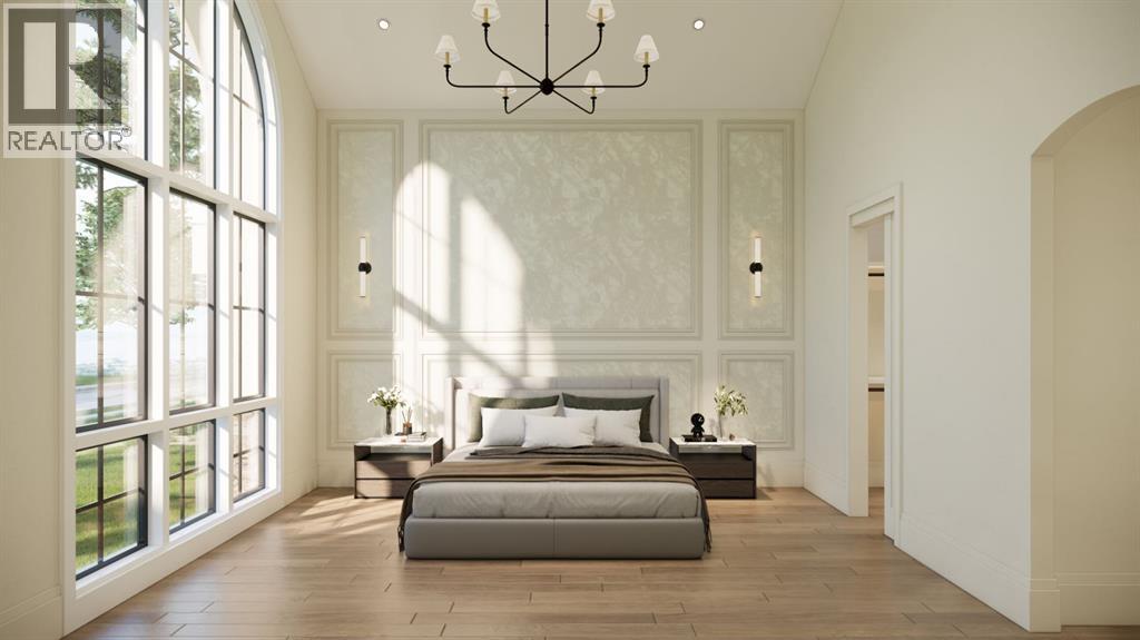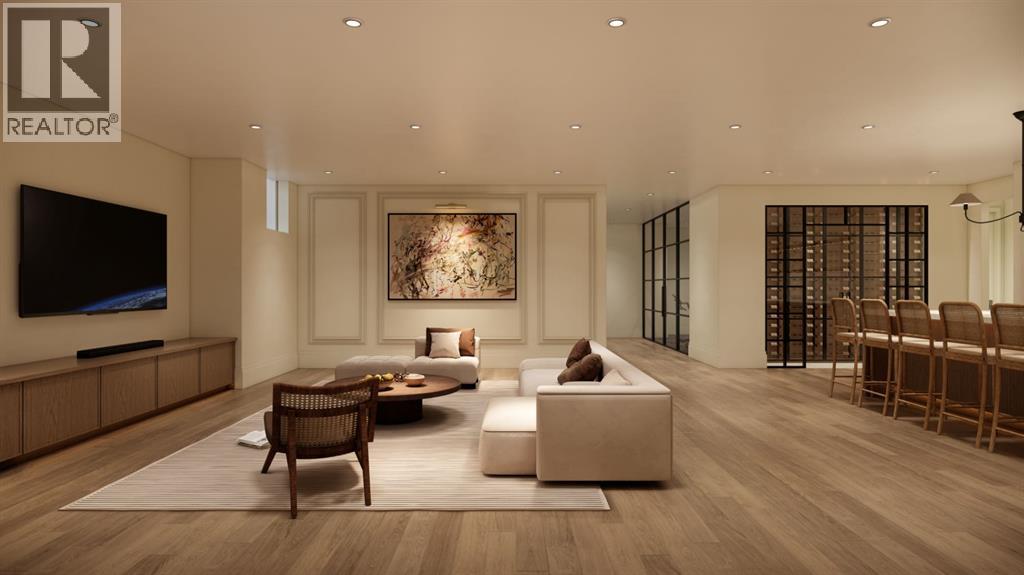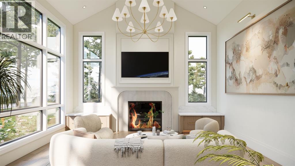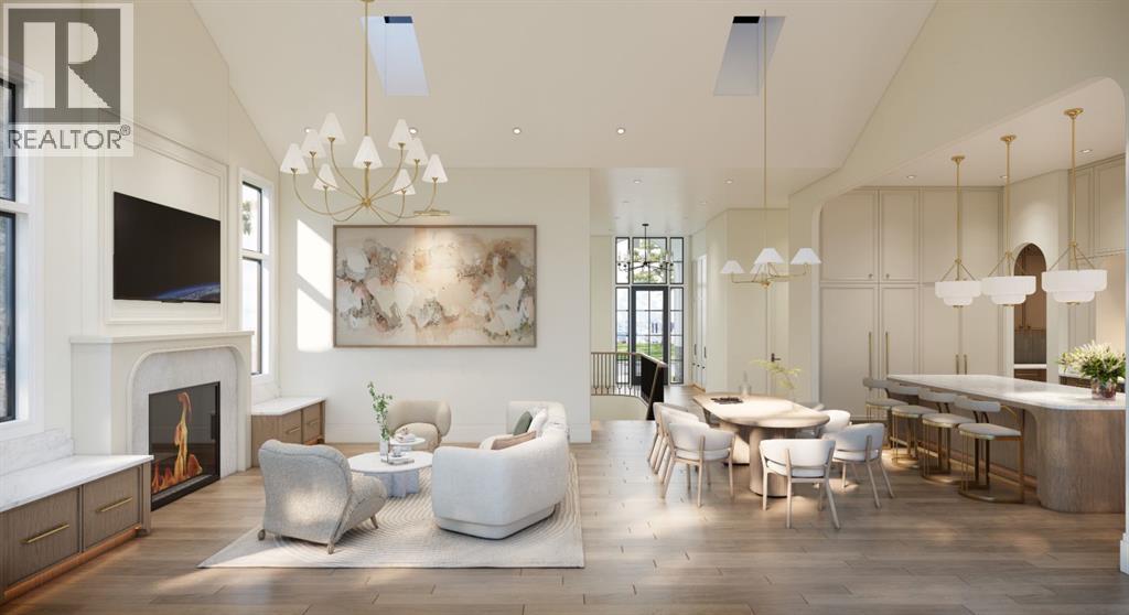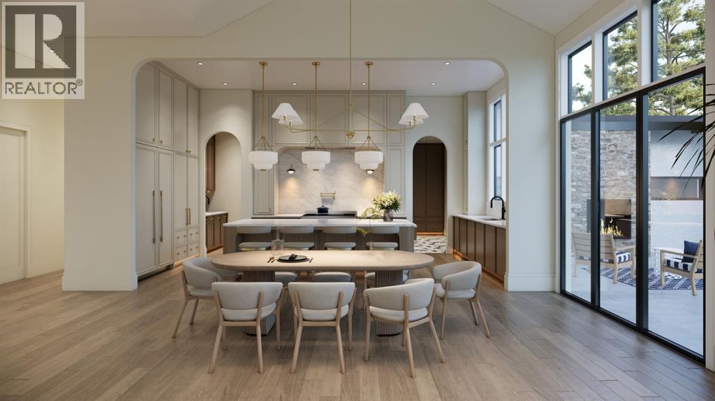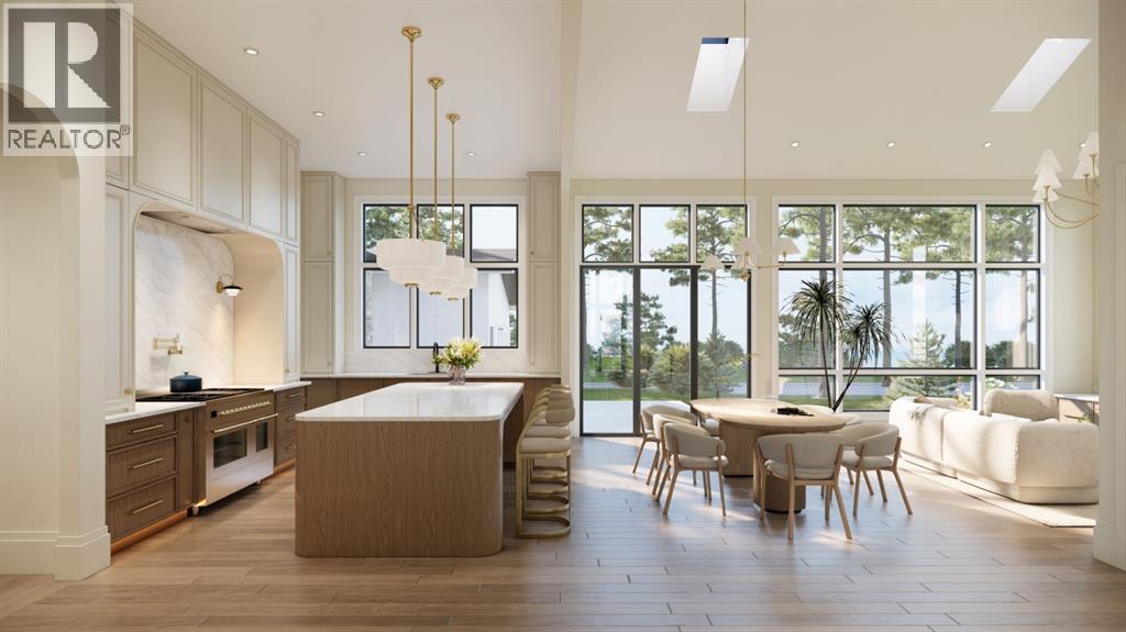 This exceptional custom bungalow located on a quiet corner lot offers over 4,400 square feet of total developed living space with 4 bedrooms, a rare attached triple tandem garage, a west facing backyard, and impressive architectural ceiling heights including 12-foot ceilings throughout the main level, 10-foot ceilings in the basement, and a front office. The home opens through a statement front foyer with designer lighting, wide plank hardwood flooring, and custom millwork detailing that continues throughout the main floor. The front office features elegant wall panelling and built-in cabinetry with glass fronts, while the great room is anchored by a striking fireplace feature wall framed by expansive windows that highlight the 16-foot vaulted ceiling, multiple skylights fill the space with natural light. The chef’s kitchen, equipped with high-end Thermador appliances, is designed as a true centrepiece with custom cabinetry, Taj Mahal quartzite countertops, a large oak island, designer hardware, and elevated plumbing fixtures. The adjacent dining area is positioned beside large windows overlooking the backyard, and heading out to the large deck with a gas fireplace. The main level primary retreat is designed as a luxurious private space with its own dramatic 16-foot vaulted ceiling, oversized windows, and generous proportions. The spa inspired ensuite features a freestanding tub, large walk-in shower with full height tile, dual vanities with custom cabinetry, quartz countertops, in-floor heating, and a spacious walk-in closet with extensive built-ins and a center island. The main floor is further completed by a second primary bedroom and an ensuite, a designer powder room with a fluted vanity and porcelain countertop, a mudroom with custom cabinetry and built-in bench seating, and a fully finished laundry room with cabinetry and quartz counters leading to the attached triple tandem garage. The fully developed lower level continues the home’s refined design with 10-f oot ceilings, a gym, a large recreation and entertainment area, a custom wet bar, extensive cabinetry, and a glass enclosed wine display. Two additional bedrooms are generously sized and paired with beautifully finished bathrooms featuring custom vanities, quartz counters, and full tile showers, creating a home that blends thoughtful layout with elevated finishes throughout. Located near the Glenmore Reservoir, North Glenmore Park, and Weaselhead Flats with endless walking and cycling pathways. Enjoy quick access to downtown, top rated schools, nearby golf courses, and a vibrant community atmosphere with parks, recreation, and local amenities just minutes away. Buyers will have the opportunity to work with the builder and customize select finishes. Call today to book your private tour. (id:63190)