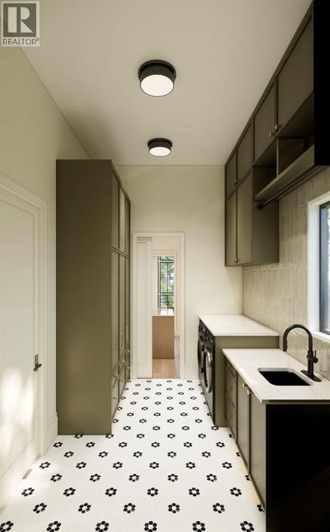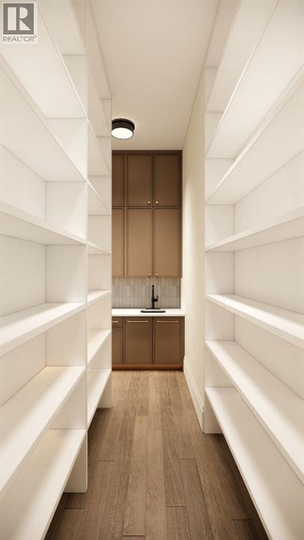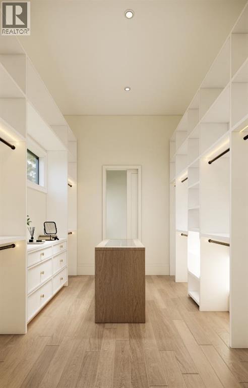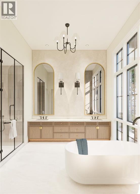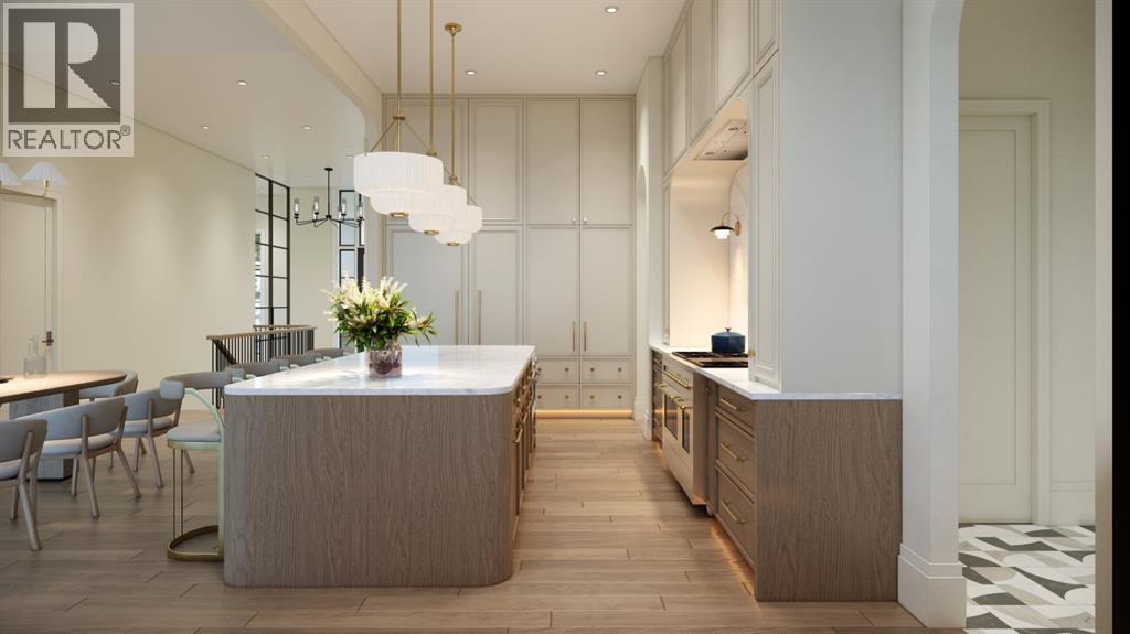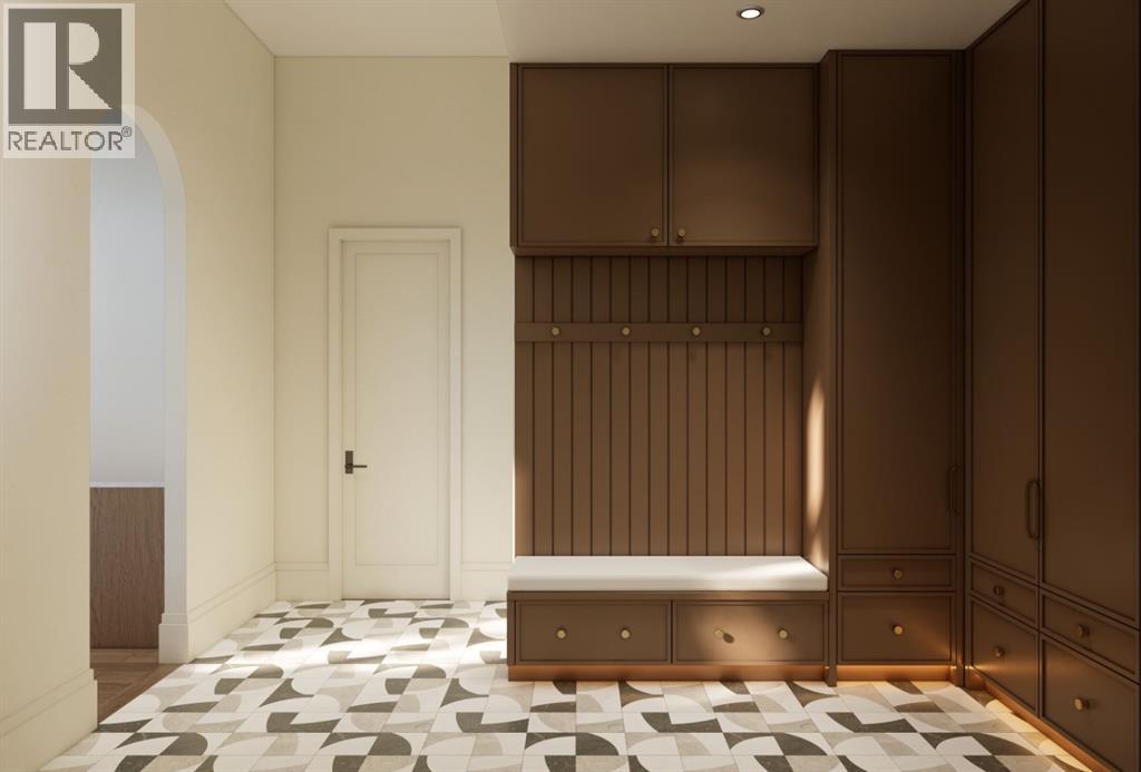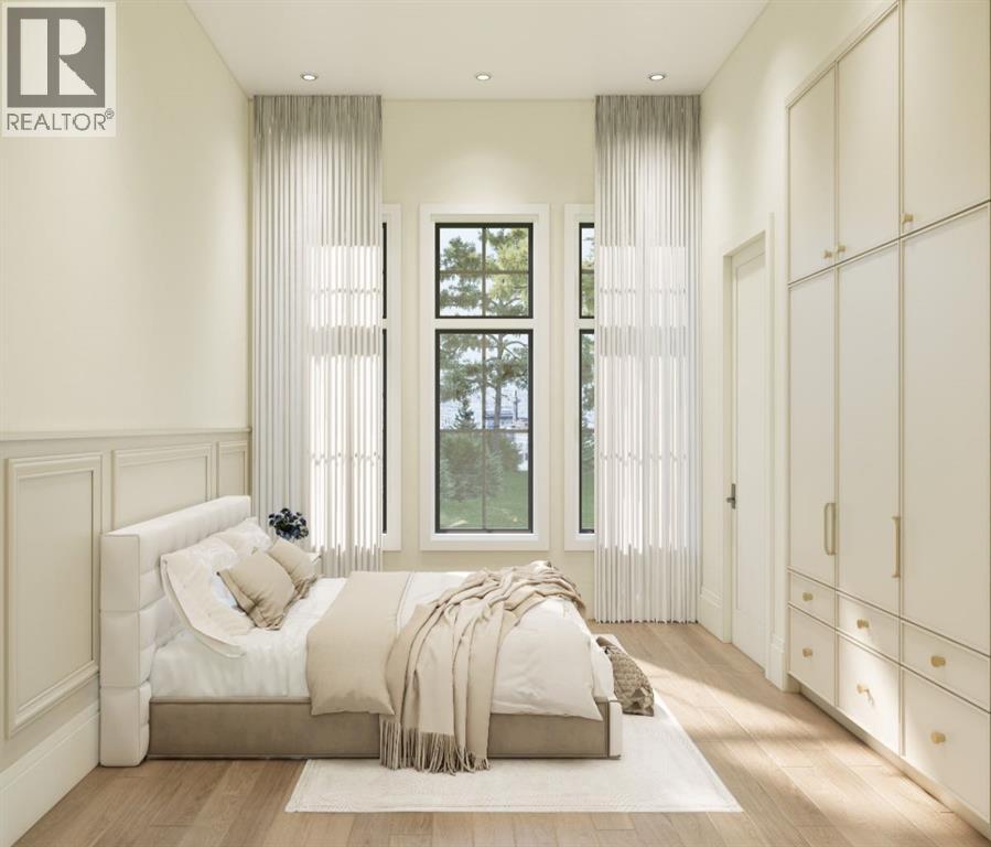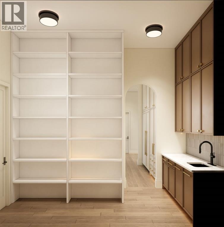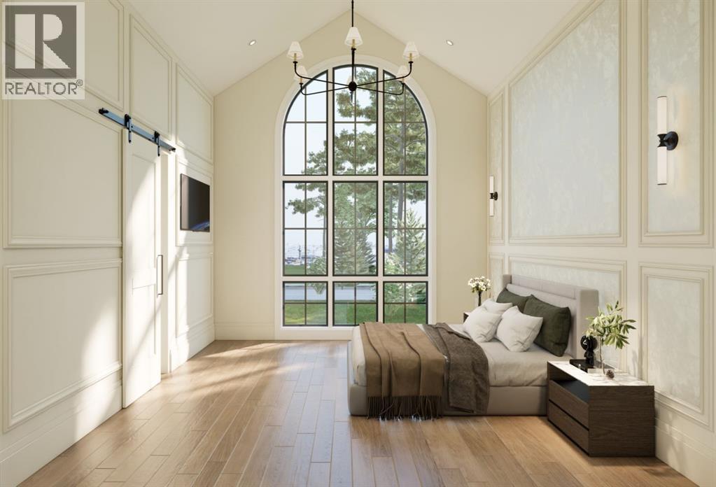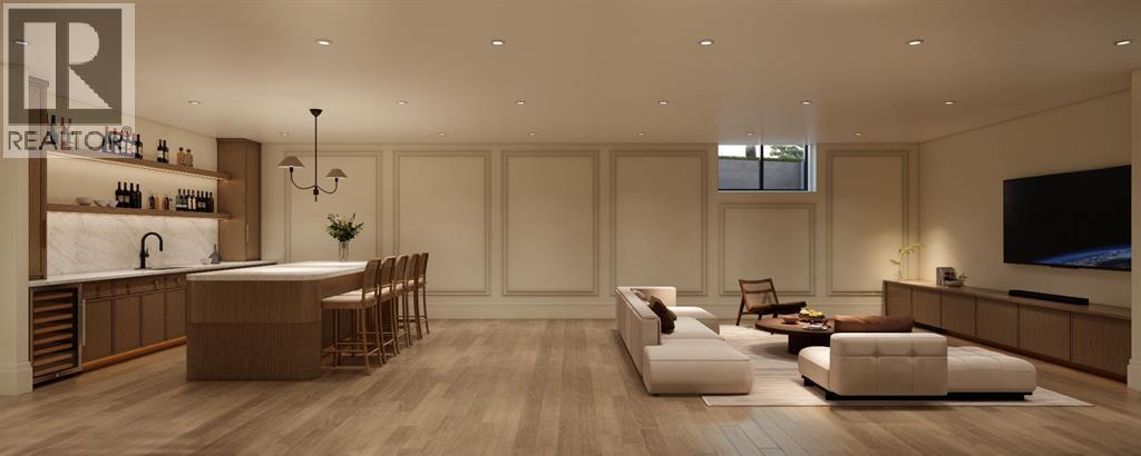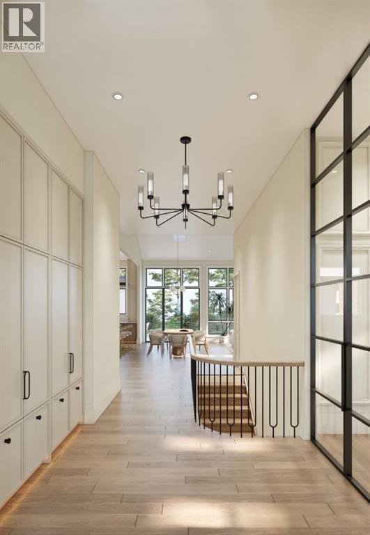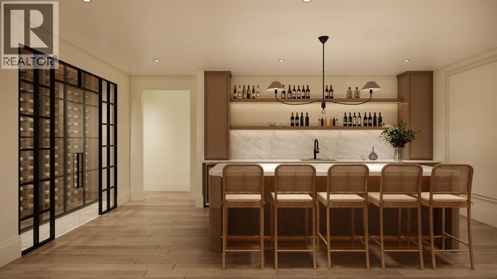 This exceptional custom bungalow located on a quiet corner lot offers over 4,400 square feet of total developed living space with 4 bedrooms, a rare attached triple tandem garage, a west facing backyard, and impressive architectural ceiling heights including 12-foot ceilings throughout the main level, 10-foot ceilings in the basement, and a front office. The home opens through a statement front foyer with designer lighting, wide plank hardwood flooring, and custom millwork detailing that continues throughout the main floor. The front office features elegant wall panelling and built-in cabinetry with glass fronts, while the great room is anchored by a striking fireplace feature wall framed by expansive windows that highlight the 16-foot vaulted ceiling, multiple skylights fill the space with natural light. The chef’s kitchen, equipped with high-end Thermador appliances, is designed as a true centrepiece with custom cabinetry, Taj Mahal quartzite countertops, a large oak island, designer hardware, and elevated plumbing fixtures. The adjacent dining area is positioned beside large windows overlooking the backyard, and heading out to the large deck with a gas fireplace. The main level primary retreat is designed as a luxurious private space with its own dramatic 16-foot vaulted ceiling, oversized windows, and generous proportions. The spa inspired ensuite features a freestanding tub, large walk-in shower with full height tile, dual vanities with custom cabinetry, quartz countertops, in-floor heating, and a spacious walk-in closet with extensive built-ins and a center island. The main floor is further completed by a second primary bedroom and an ensuite, a designer powder room with a fluted vanity and porcelain countertop, a mudroom with custom cabinetry and built-in bench seating, and a fully finished laundry room with cabinetry and quartz counters leading to the attached triple tandem garage. The fully developed lower level continues the home’s refined design with 10-f oot ceilings, a gym, a large recreation and entertainment area, a custom wet bar, extensive cabinetry, and a glass enclosed wine display. Two additional bedrooms are generously sized and paired with beautifully finished bathrooms featuring custom vanities, quartz counters, and full tile showers, creating a home that blends thoughtful layout with elevated finishes throughout. Located near the Glenmore Reservoir, North Glenmore Park, and Weaselhead Flats with endless walking and cycling pathways. Enjoy quick access to downtown, top rated schools, nearby golf courses, and a vibrant community atmosphere with parks, recreation, and local amenities just minutes away. Buyers will have the opportunity to work with the builder and customize select finishes. Call today to book your private tour. (id:63190)