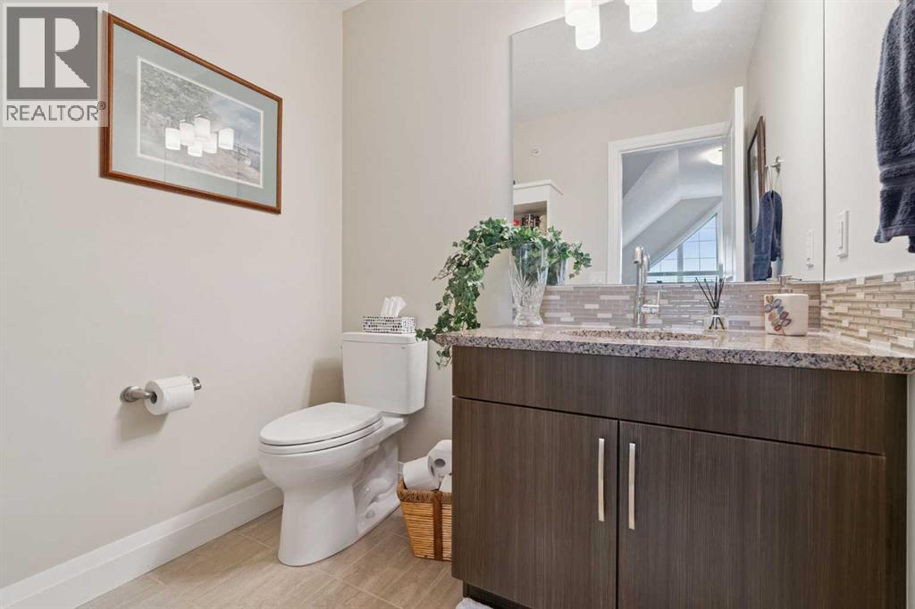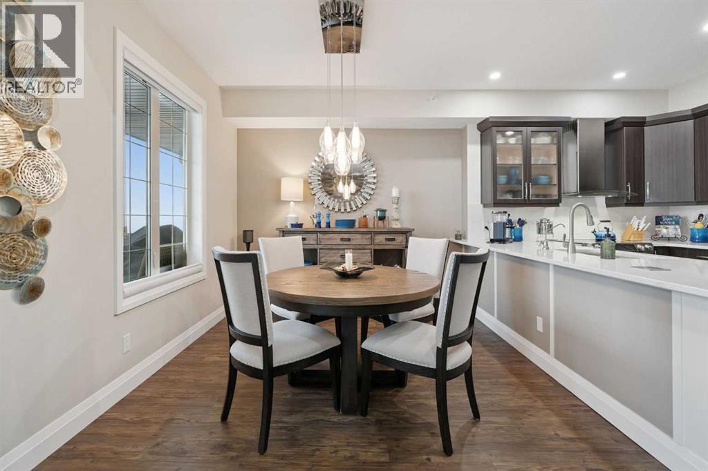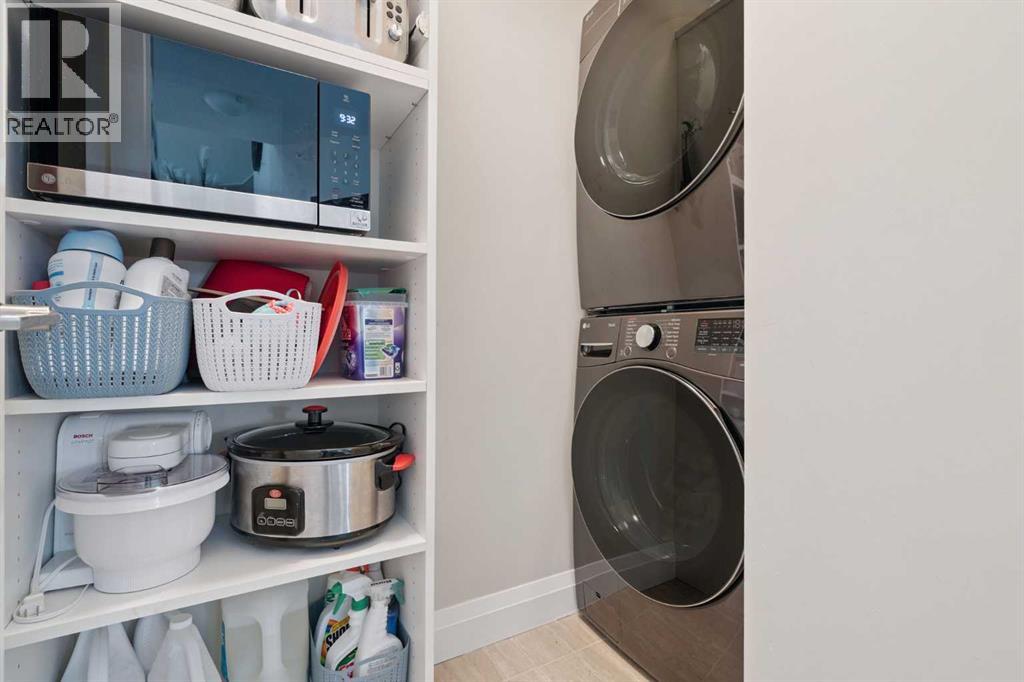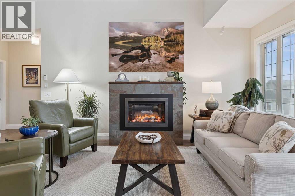 Breathtaking End Unit in One of Cochrane’s Most Luxurious Apartment Buildings. This premium 1,440 sq. ft. end unit offers 2 bedrooms and 2.5 bathrooms, showcasing a truly unique loft design with soaring ceilings that create a dramatic, high-end ambiance throughout. This unit has been meticulously cared for, upgraded and maintained. It very easy to say this is one of the nicest Apartment units in the entire town of Cochrane. Thoughtfully updated, the home features beautiful custom built-in cabinetry in the kitchen, complemented by a matching dry bar in the living room—perfect for entertaining. Quartz countertops and a full-height backsplash add a touch of modern luxury while offering durability and easy maintenance. New carpets throughout the home as well a truly breathtaking fireplace add class and charm to this lovely home. Expansive windows flood the space with natural light, enhancing the open-concept layout and emphasizing the impressive ceiling height. Step out onto the large balcony and enjoy breathtaking southeast-facing views of the mountains and rolling hills. The spacious primary bedroom offers excellent versatility, complete with dual closets and a well-appointed 3-piece ensuite. The second bedroom is exceptionally designed with high-end custom millwork, functioning perfectly as a home office while also featuring a cleverly integrated Murphy bed for guests. The loft level provides a cozy yet sophisticated retreat—ideal for relaxing with a book or enjoying a movie—highlighted by a stunning built-in entertainment unit. Multi-level apartment living is rare in Cochrane, and this residence stands out with its exceptional design and attention to detail. Additional features include in-suite laundry discreetly tucked into a well-organized front room, two titled underground heated and secure parking stalls, and a large titled storage unit. The building itself offers excellent amenities, including bicycle storage, recycling facilities, and a charming shared library . Condo fees provide exceptional value, covering all utilities except electricity and telecommunications. Ideally located close to shopping, restaurants, and schools, this meticulously maintained building reflects pride of ownership throughout. Wide, well-lit hallways and a clean, secure parkade further enhance the living experience. This is luxury living at its finest. (id:63190)