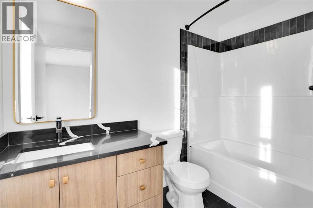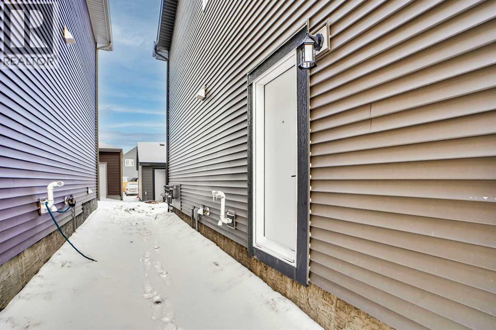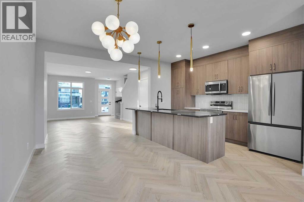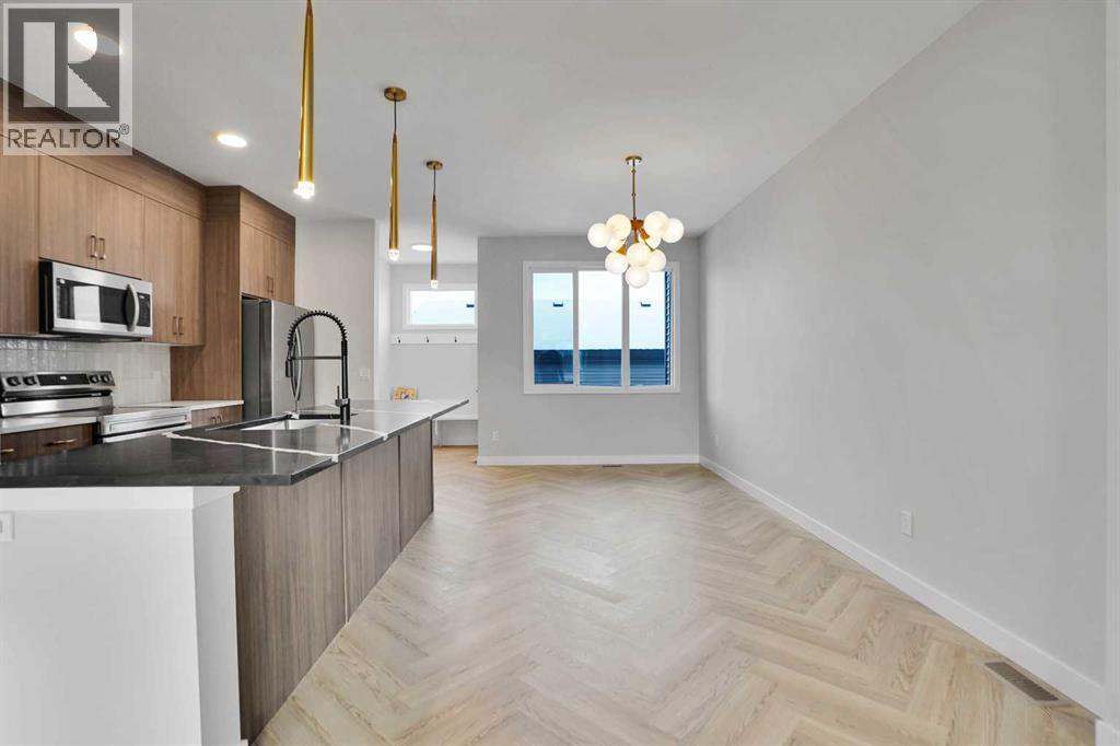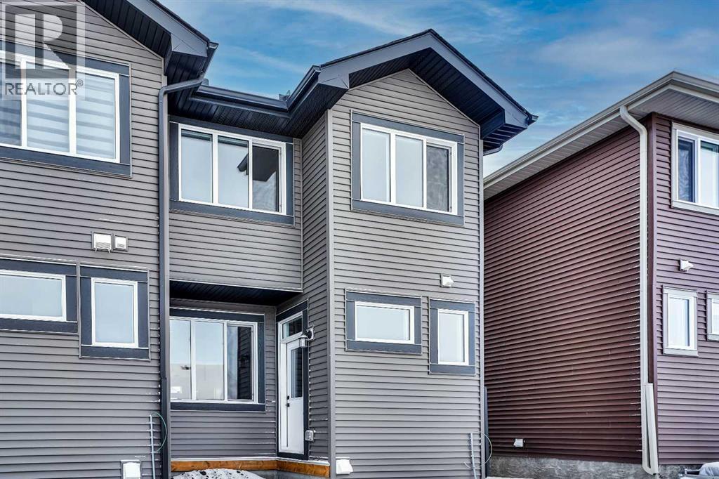 Discover modern elegance in the highly sought-after community of Cobblestone Creek! This brand-new, end-unit townhome offers over 1,525 sq. ft. of thoughtfully designed living space, perfect for families, first-time buyers, or those looking to downsize without compromise.The open-concept main floor impresses with 9’ ceilings, expansive windows for maximum natural light, and a seamless flow between the spacious living area and dining zone. The chef-inspired kitchen is a standout, featuring quartz countertops, a large central island, stainless steel appliances, and sleek cabinetry—ideal for both daily life and entertaining. Upstairs, retreat to a luxurious primary suite complete with a private ensuite and a generous walk-in closet. Two additional well-sized bedrooms offer flexibility for guests or a home office, complemented by the convenience of upper-level laundry. A separate side entrance leads to the basement, providing excellent potential for future development. Outside, you’ll find a detached double garage (under construction) with paved lane access. Enjoy a low-maintenance lifestyle with NO CONDO FEES in a growing neighborhood close to schools, parks, and shopping. With quick access to major routes, commuting to Calgary or heading to the mountains is a breeze. Quick possession available—move in today! (id:63190)