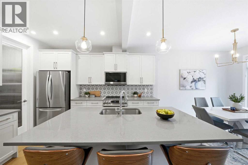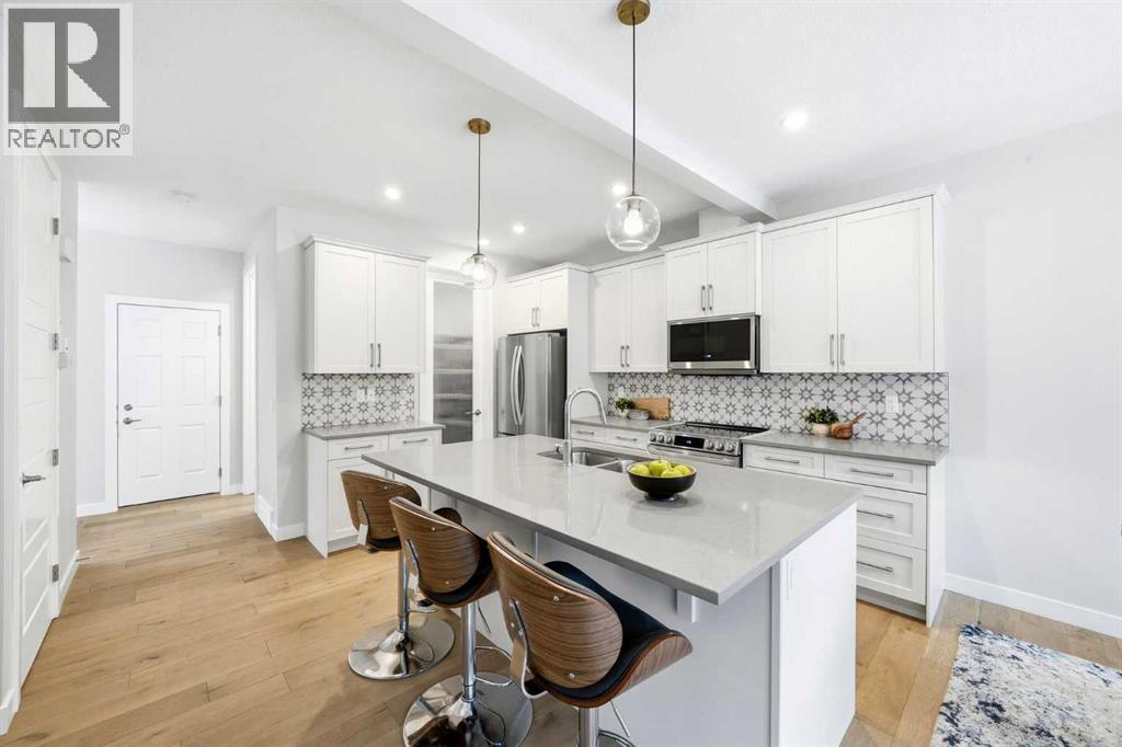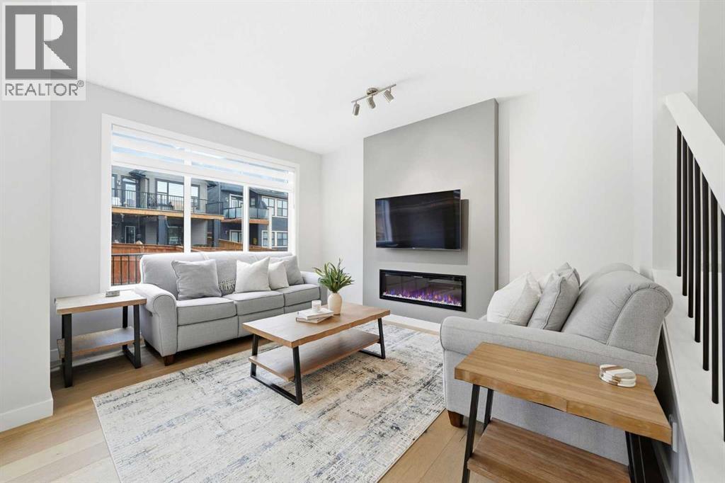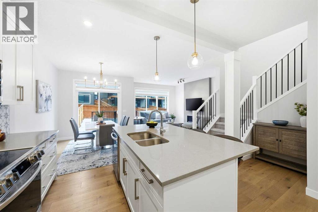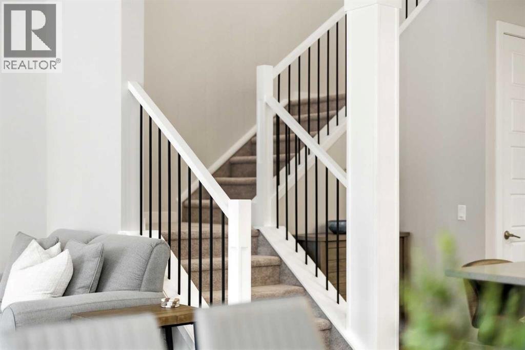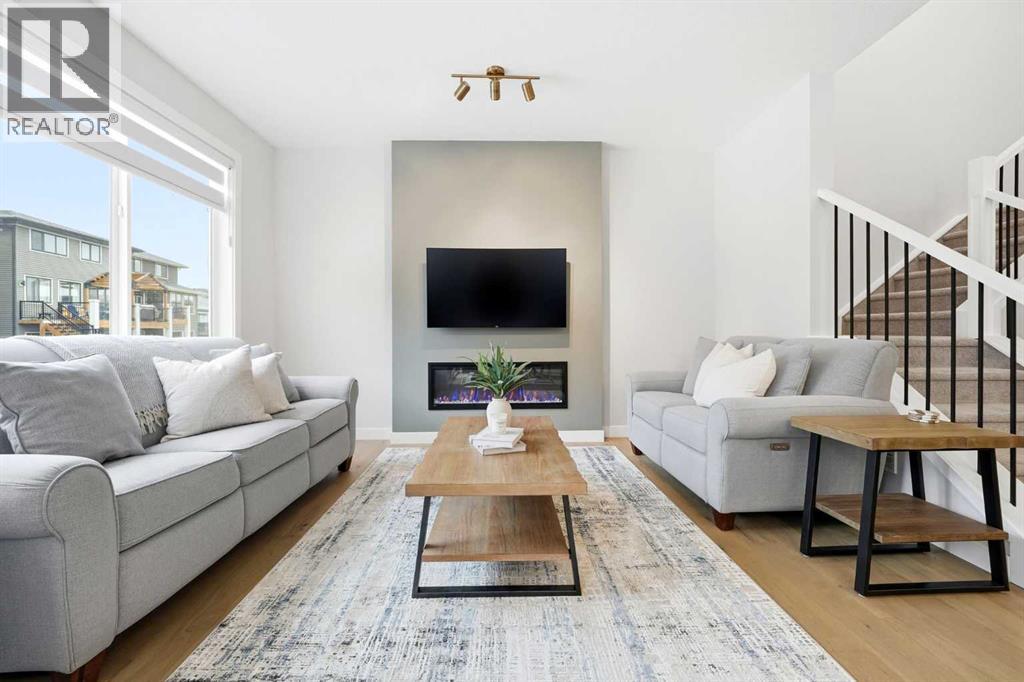 This duplex-style property is a rare offering in the elevated community of Precedence in Cochrane. Surrounded by stunning hillside views and kilometres of scenic walking paths, this neighbourhood seamlessly connects you to nature—leading throughout the community, down to the winding Bow River, and over to the popular Spray Lakes Recreation Centre. This location truly has it all. Offering tremendous value, this home is ideal for first-time buyers or those looking to downsize, complete with the convenience of a double attached garage. Step inside and immediately appreciate the gorgeous engineered hardwood flooring that flows throughout the main floor. The kitchen is bright, modern, and timeless, featuring crisp white cabinetry, stainless steel appliances, quartz countertops, a large island perfect for entertaining, and a walk-in pantry providing ample storage. The living room is anchored by a stylish electric fireplace, creating a warm and contemporary focal point. With plenty of space for family gatherings, the dining room also offers direct access to the large west-facing backyard. A stylish open railing leads you to the upper level, where thoughtful design continues with a walk-in laundry room, two additional bedrooms or office spaces, and a full bathroom. The primary bedroom serves as a peaceful retreat, perfect for unwinding at the end of the day. It is complemented by a luxurious ensuite featuring dual sinks, quartz countertops, a spacious shower, and additional shelving, while a walk-in closet completes this well-appointed space. Outside, the newly built oversized composite deck is a standout feature—designed for durability and low maintenance, with a charming brick patio just off the deck that creates the perfect extension for outdoor lounging or entertaining. The yard has been thoughtfully finished with low-maintenance rock, allowing you to relax and enjoy the outdoor space all season long. This home is truly turn-key, complete with custom window coverings an d wand-controlled blinds throughout. The lower level is undeveloped and ready for your future vision, with a bathroom rough-in already in place. Don’t miss your opportunity to own this beautiful home in one of Cochrane’s most desirable communities—schedule your showing today! (id:63190)