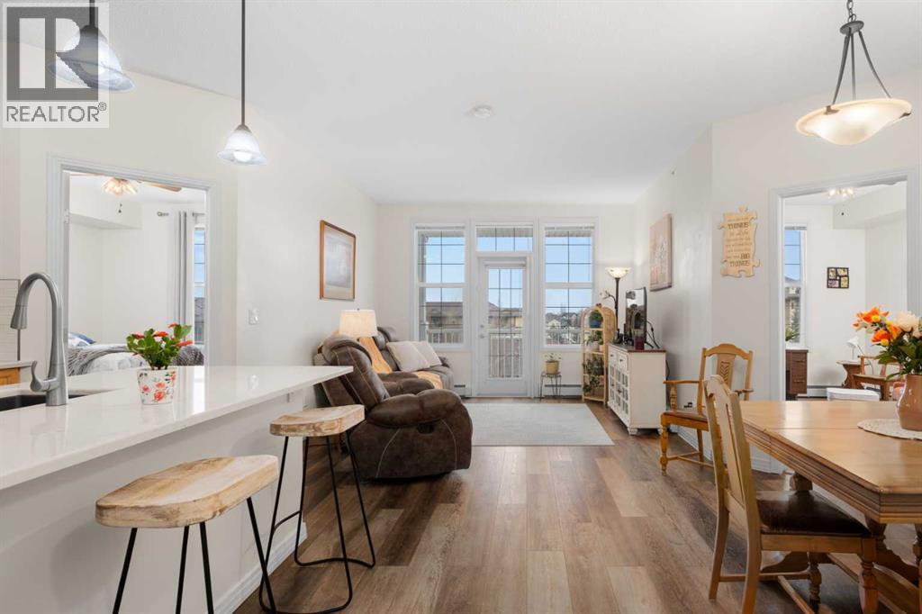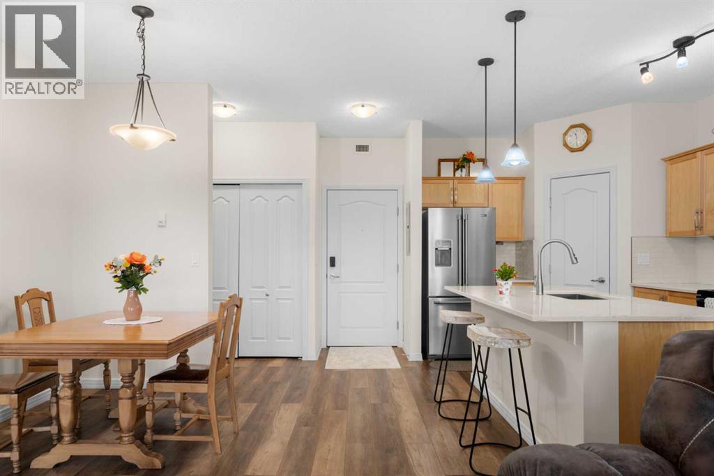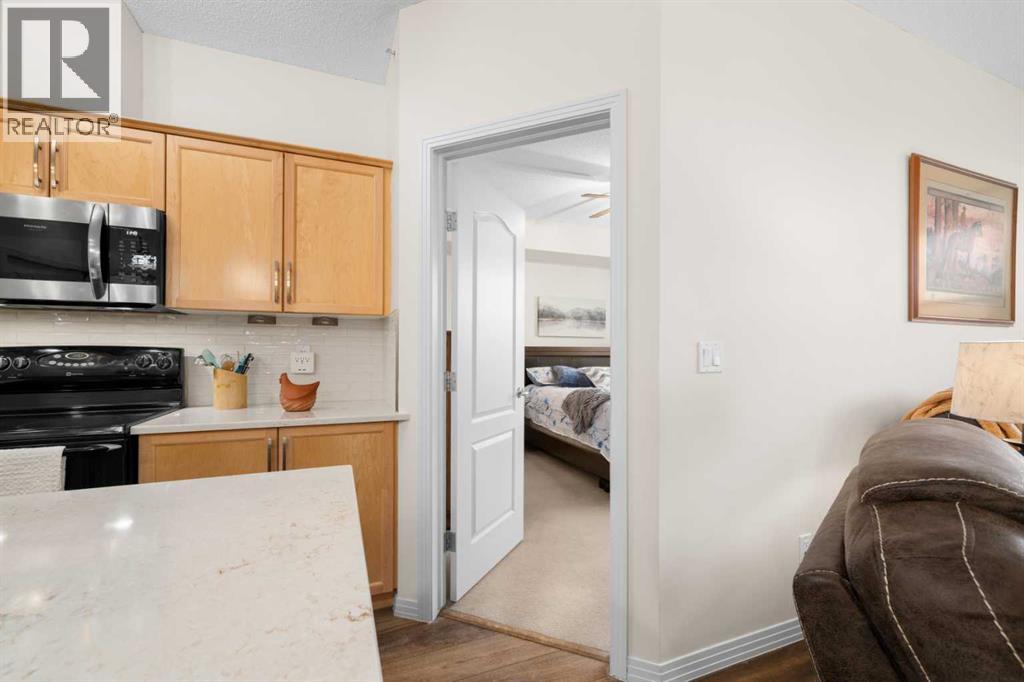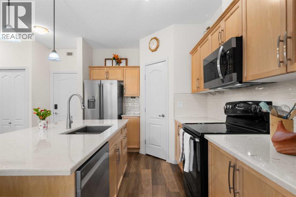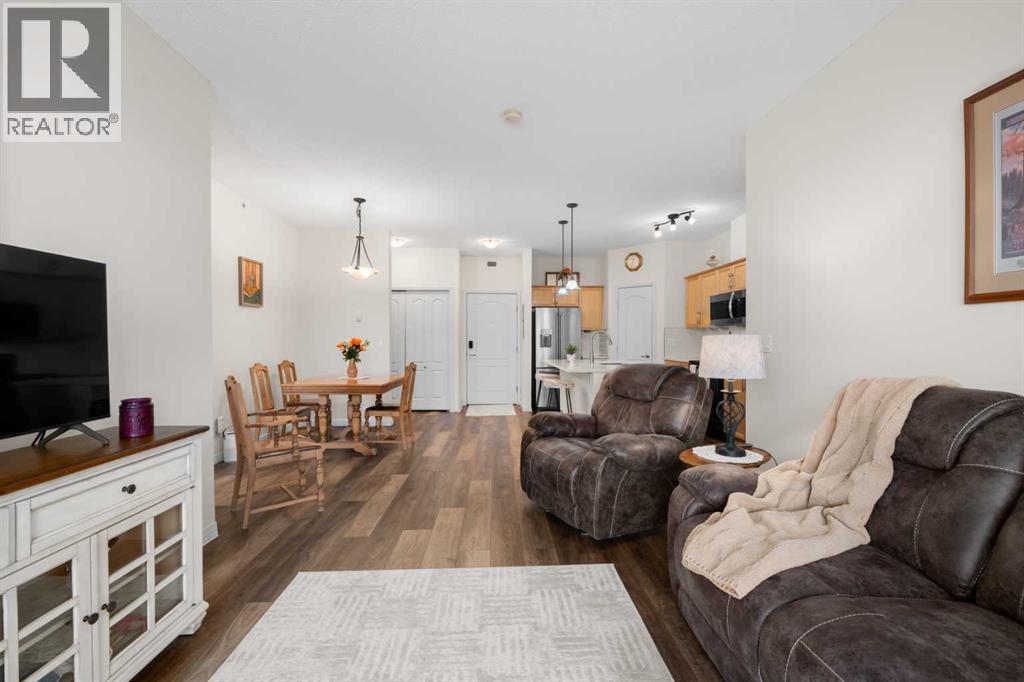Welcome to this beautifully renovated top-floor, west-facing condo, ideally located in a highly sought-after building with lake access and just steps from the golf course. This unit includes TWO HEATED UNDERGROUND PARKING STALLS, one with a storage cage—an exceptional bonus for condo living.Upon entry, you’ll appreciate the modern luxury vinyl plank flooring and impressive 9-foot ceilings that enhance the bright, open feel of the space. The thoughtfully updated kitchen features a large island with quartz countertops, maple cabinetry, and a corner pantry—perfect for both everyday living and entertaining. Stainless steel appliances, including the refrigerator, microwave, and dishwasher, were updated in 2022, along with the stacked washer and dryer, conveniently located in the second bathroom.The spacious dining area flows seamlessly into the inviting living room, which opens onto a west-facing deck where you can enjoy beautiful mountain views and evening sunsets. A new screen door (2024) adds to the comfort and functionality of this outdoor space.This well-designed unit offers two generous bedrooms. The second bedroom features a walkthrough closet and convenient access to a 4-piece bathroom with quartz counters, a large vanity, updated flooring, and the in-suite stacked laundry for added convenience. The primary suite is a true retreat, complete with a large walkthrough closet and a private ensuite featuring luxury vinyl plank flooring, a spacious shower, and a quartz-topped vanity.Residents of this exceptional building enjoy a variety of amenities, including a fitness centre, indoor putting green, games room with pool table and dart board, and a library. Beautifully maintained and move-in ready, this condo offers a fantastic opportunity to enjoy maintenance-free living in a vibrant, amenity-rich community.Experience the best of condo living—just in time to enjoy summer at the lake! View 3D tour/Multimedia/Virtual Tour. (id:63190)
