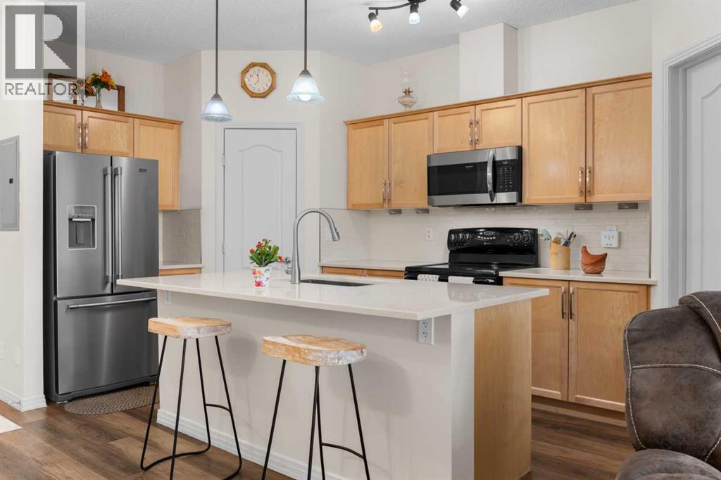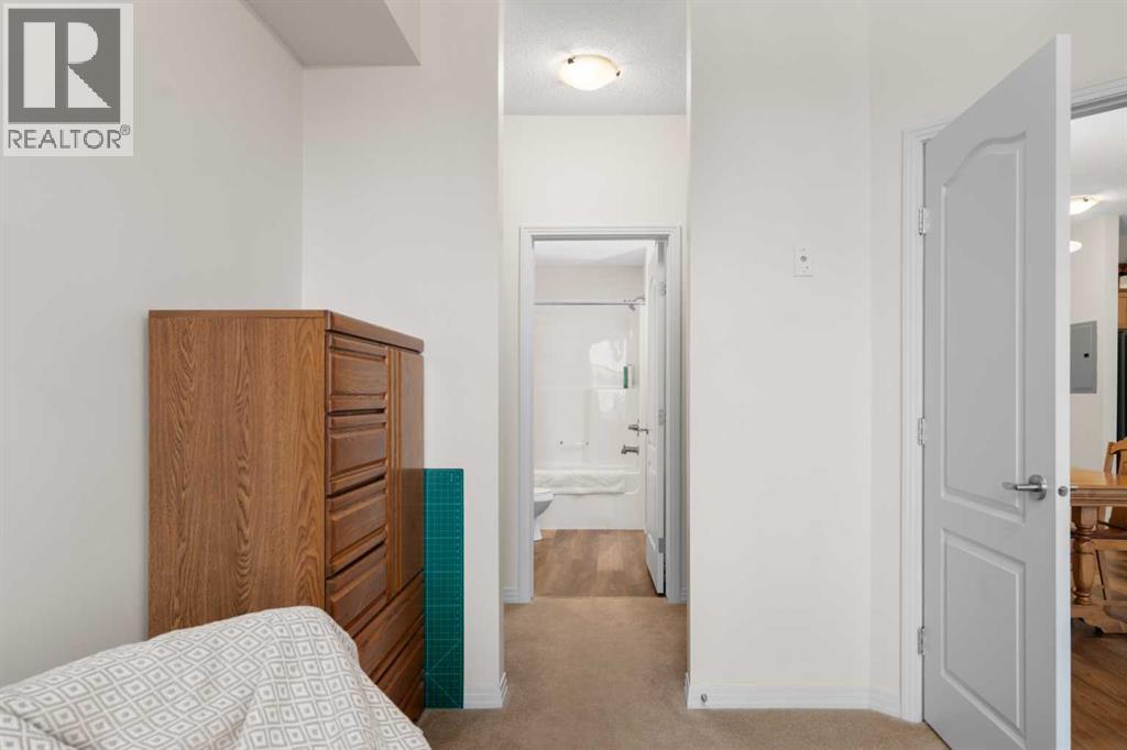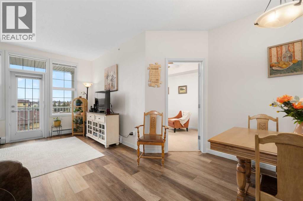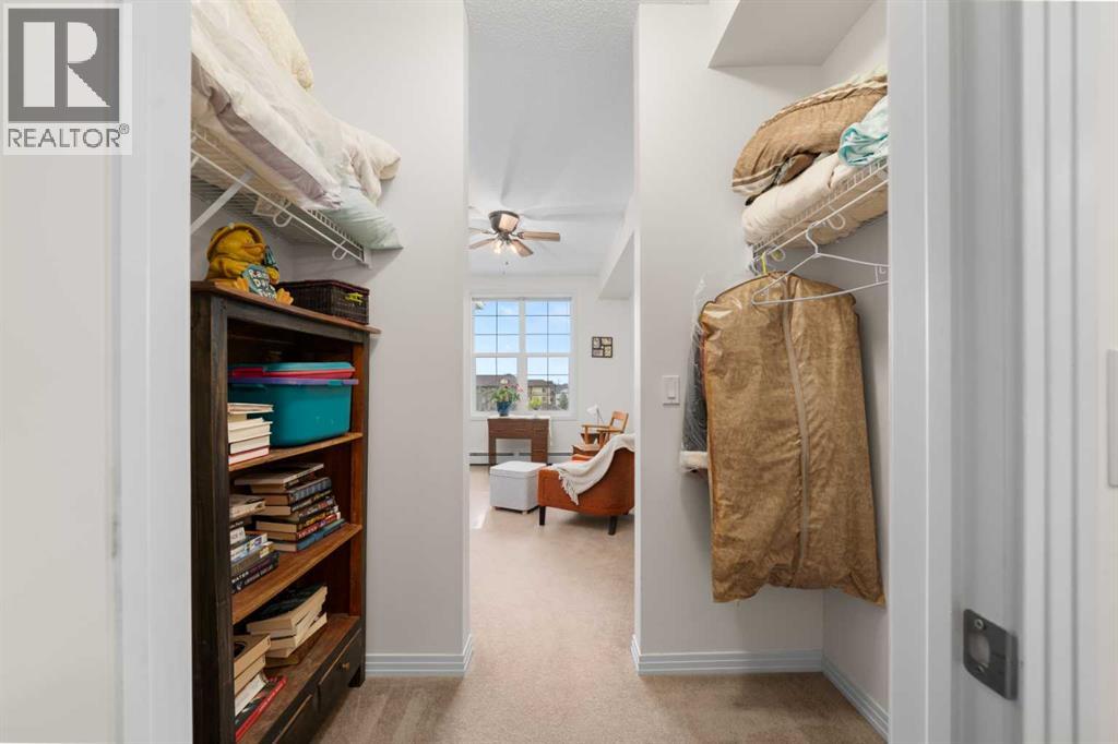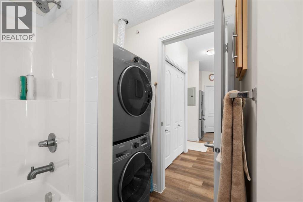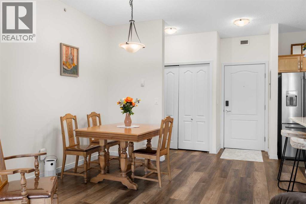 Welcome to this beautifully renovated top-floor, west-facing condo, ideally located in a highly sought-after building with lake access and just steps from the golf course. This unit includes TWO HEATED UNDERGROUND PARKING STALLS, one with a storage cage—an exceptional bonus for condo living.Upon entry, you’ll appreciate the modern luxury vinyl plank flooring and impressive 9-foot ceilings that enhance the bright, open feel of the space. The thoughtfully updated kitchen features a large island with quartz countertops, maple cabinetry, and a corner pantry—perfect for both everyday living and entertaining. Stainless steel appliances, including the refrigerator, microwave, and dishwasher, were updated in 2022, along with the stacked washer and dryer, conveniently located in the second bathroom.The spacious dining area flows seamlessly into the inviting living room, which opens onto a west-facing deck where you can enjoy beautiful mountain views and evening sunsets. A new screen door (2024) adds to the comfort and functionality of this outdoor space.This well-designed unit offers two generous bedrooms. The second bedroom features a walkthrough closet and convenient access to a 4-piece bathroom with quartz counters, a large vanity, updated flooring, and the in-suite stacked laundry for added convenience. The primary suite is a true retreat, complete with a large walkthrough closet and a private ensuite featuring luxury vinyl plank flooring, a spacious shower, and a quartz-topped vanity.Residents of this exceptional building enjoy a variety of amenities, including a fitness centre, indoor putting green, games room with pool table and dart board, and a library. Beautifully maintained and move-in ready, this condo offers a fantastic opportunity to enjoy maintenance-free living in a vibrant, amenity-rich community.Experience the best of condo living—just in time to enjoy summer at the lake! View 3D tour/Multimedia/Virtual Tour. (id:63190)