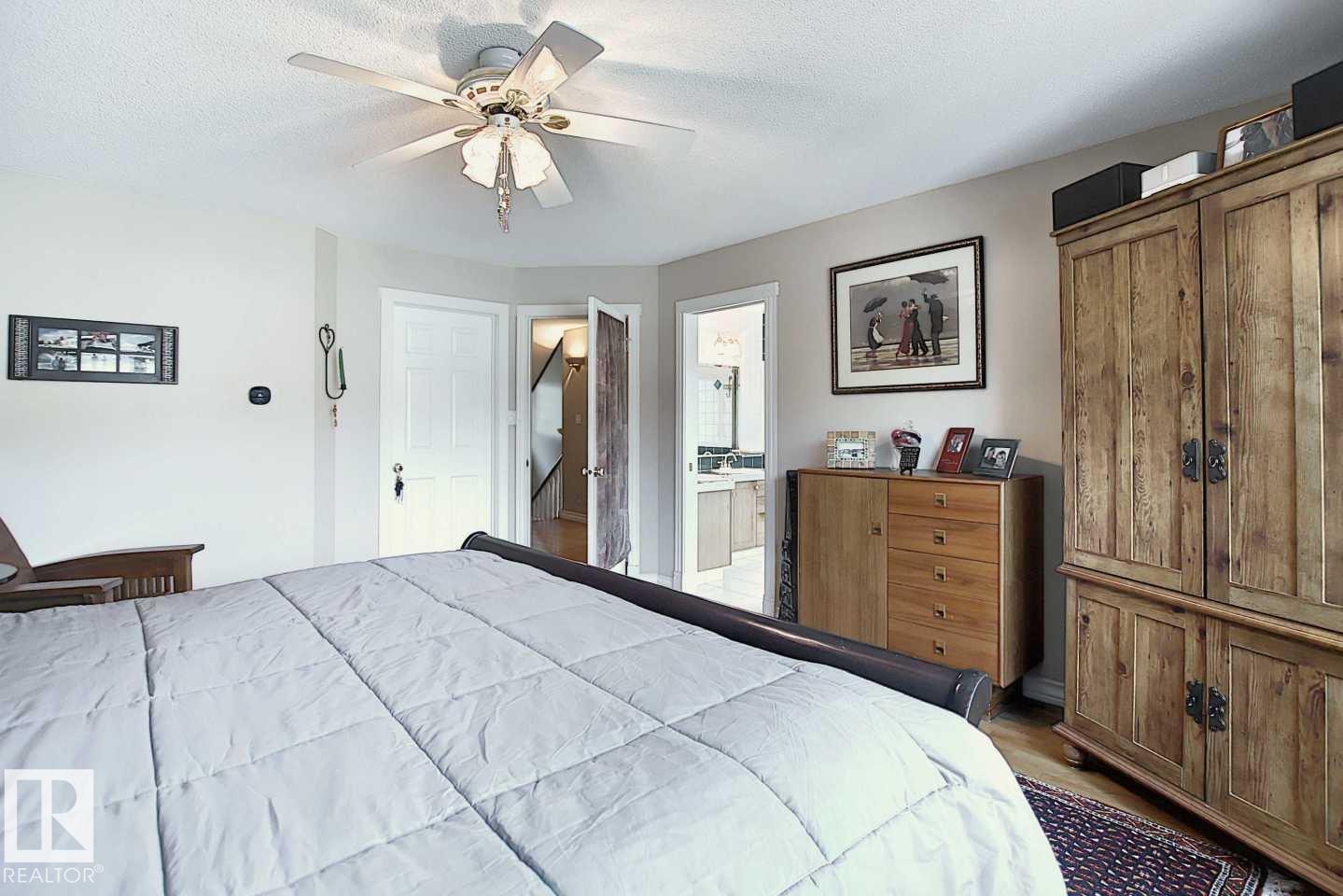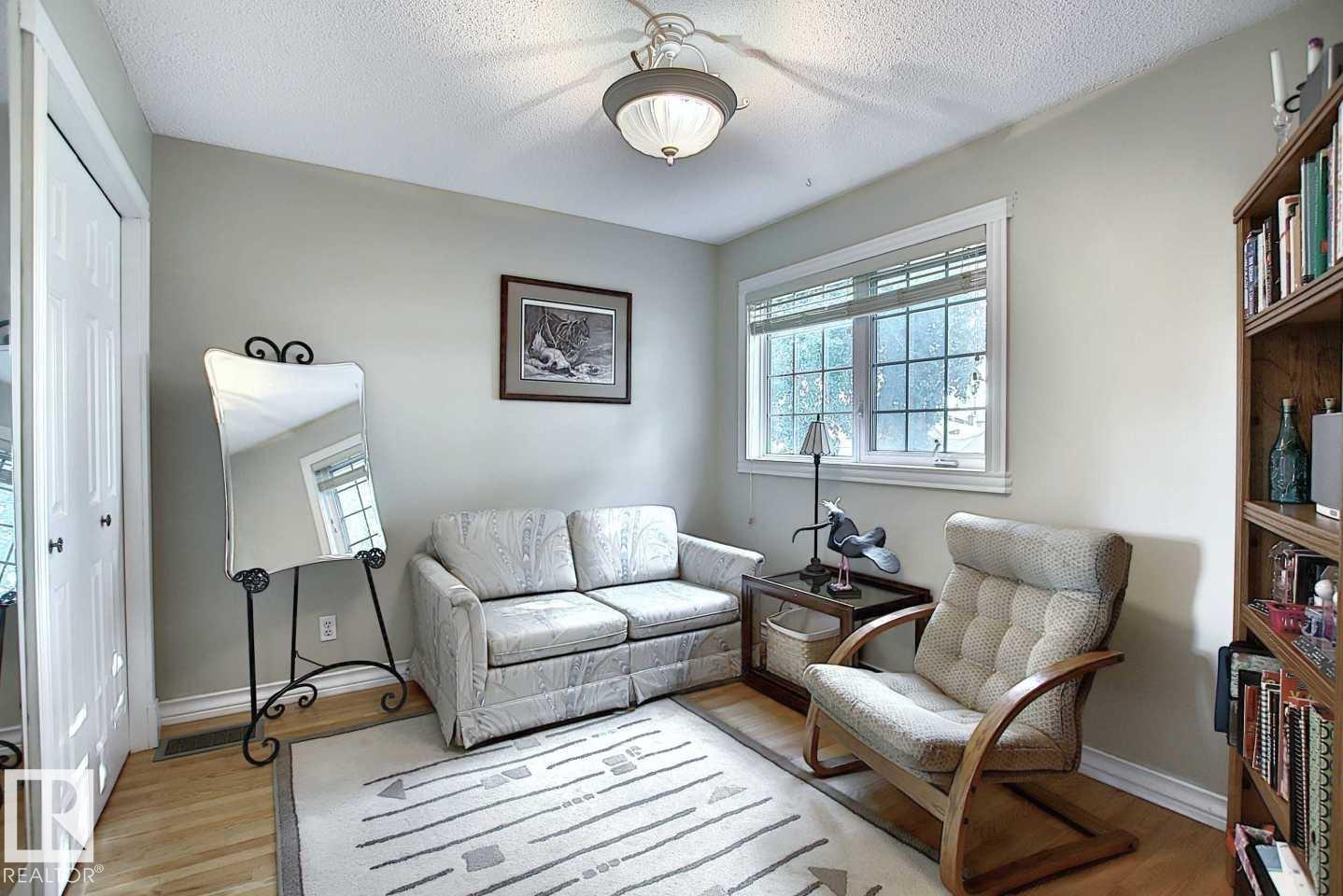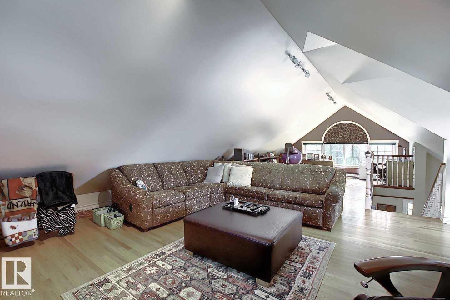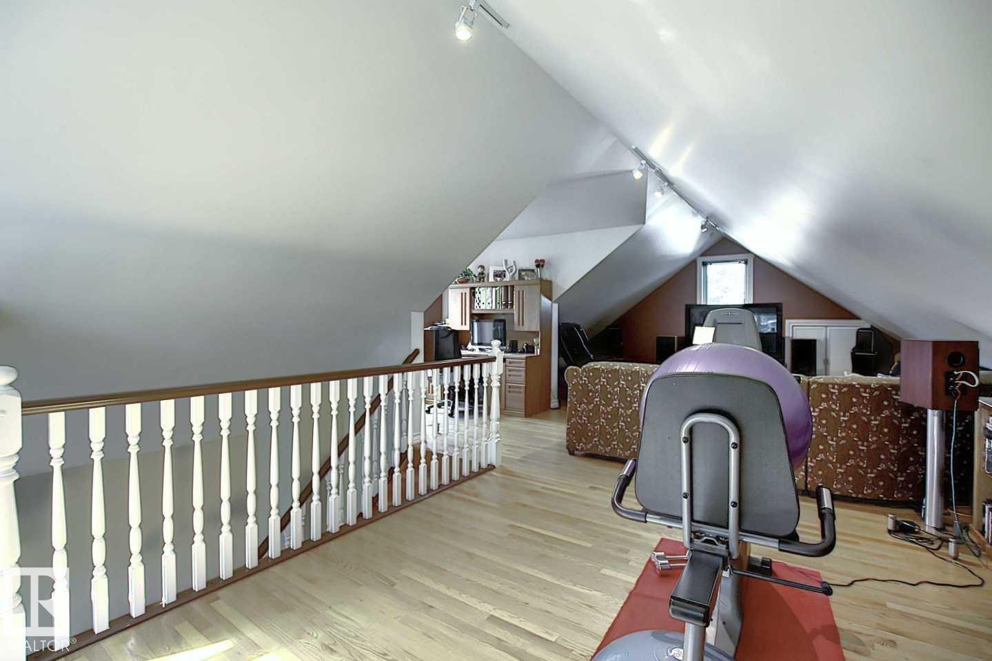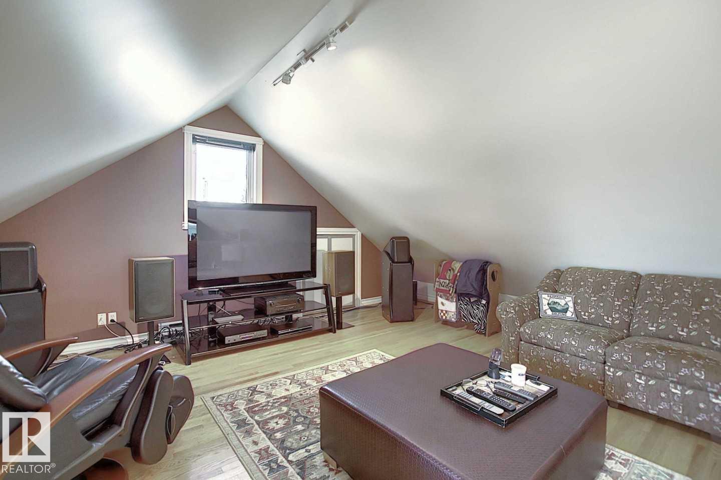 Wonderful 2350 sq ft 2.5 story custom built 2 plus 2 bedroom home on a quiet tree lined street just 1/2 block to Ada Boulevard and the scenic river valley. Great main floor plan featuring a large living room w/gas fireplace, dining room, bright kitchen with stainless appliances, gas range, granite countertops & raised eating bar for that morning coffee, 2 pc powder room with laundry. Upstairs there's a beautiful primary bedroom suite with massive walk in closet & 6 piece bath featuring a jacuzzi tub. Additional bedroom & 4 pc main bath. The third floor loft is an amazing space, currently a media room and office/work out area but could easily be an additional bedroom. Finished basement with large rec room, 2 bedrooms, 3 pc bath with steam shower as well as a storage/mechanical room. Extensive use of hardwood flooring & high quality finishes throughout. Exterior featuring decks, raised flower beds & low maintenance fenced yard. Heated double garage with rare finished storage loft. A beauty! (id:63190)
