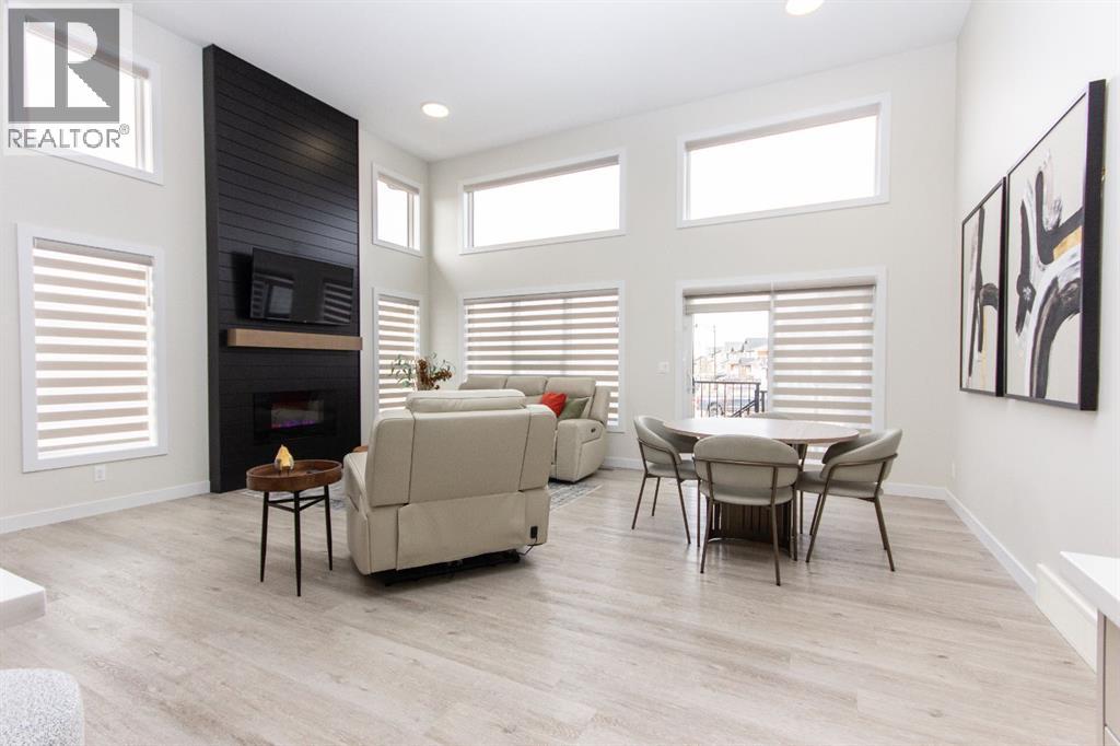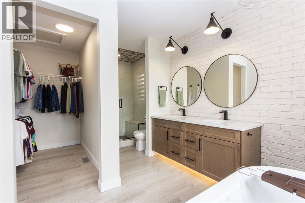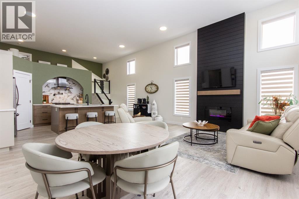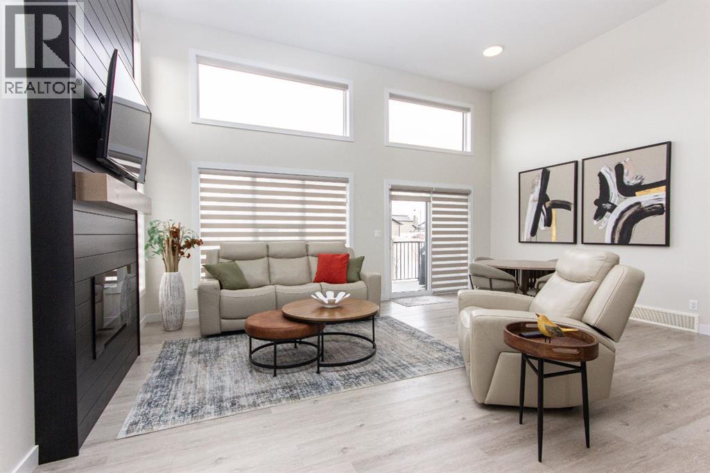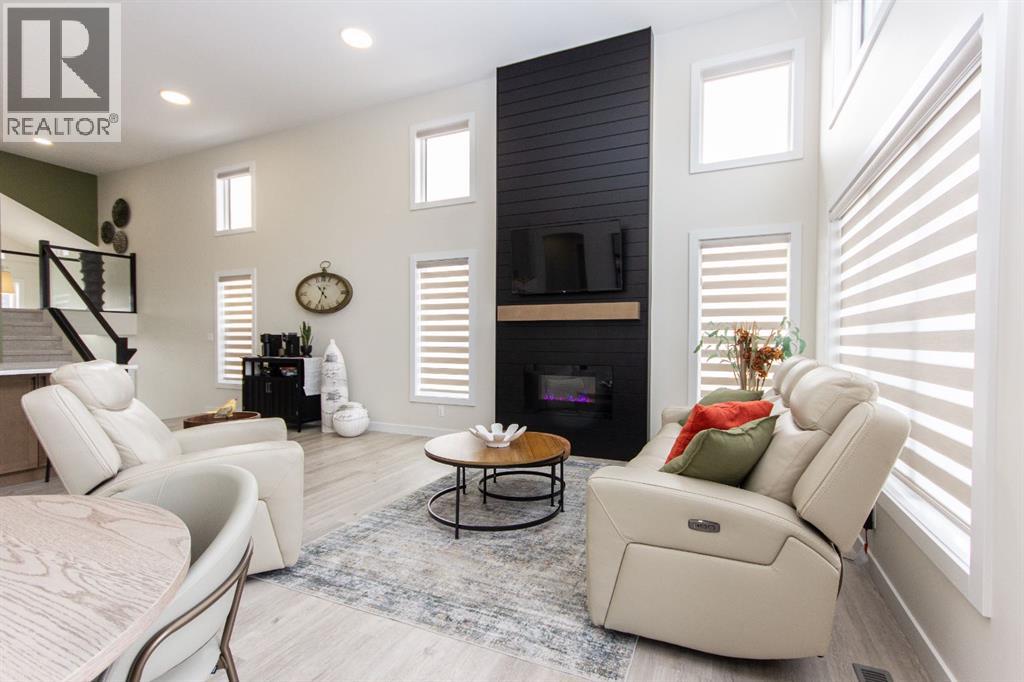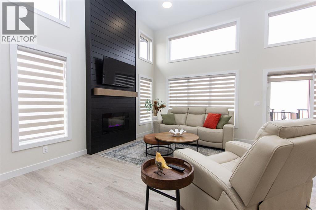 Welcome to this stunning modified bi-level located across from the pond in Evergreen! The bright, open concept main floor features 13’ ceilings, large windows with powered zebra blinds, beautiful vinyl plank flooring and a electric fireplace with a striking floor to ceiling feature wall. The kitchen is a true highlight with quartz countertops, plenty of cabinet space, black stainless-steel appliances, a corner pantry and a large centre island with eating bar and under mount sink. There is an impressive arched feature wall over the stove that is complete with hood fan, pot filler, and full tile backsplash. Two generous bedrooms and a full 4-piece bathroom complete this level. A few steps up lead you to your private primary suite featuring a loft sitting area overlooking the open main floor. The spacious primary bedroom easily accommodates king-sized furniture and offers a large walk-in closet and a luxurious 5-piece ensuite featuring a freestanding tub, separate fully tiled shower with bench, dual sinks with under-cabinet motion lighting, and an exposed brick feature wall.Downstairs, the fully finished basement includes in-floor heat, a large family room, a 4th bedroom, and another 4-piece bathroom. The separate laundry room provides plenty of space for a folding table plus additional storage. This home is equipped with hot water on demand, a high efficient furnace as well as a water softener.Step outside through the dining area onto the large west-facing low-maintenance deck complete with Duradek, aluminum railing, and a gas line for your BBQ. The deck is fully enclosed with hardie board, creating an impressive under-deck storage space. Enjoy your fully fenced and landscaped backyard complete with artificial turf, vinyl fencing, a large concrete patio, and firepit area, ideal for summer evenings and low-maintenance living.The front double attached garage is fully finished, heated, and upgraded with epoxy flooring.This home truly checks every box: style, space, upgrades, and an unbeatable location. Turn-key ready and packed with features! (id:63190)
