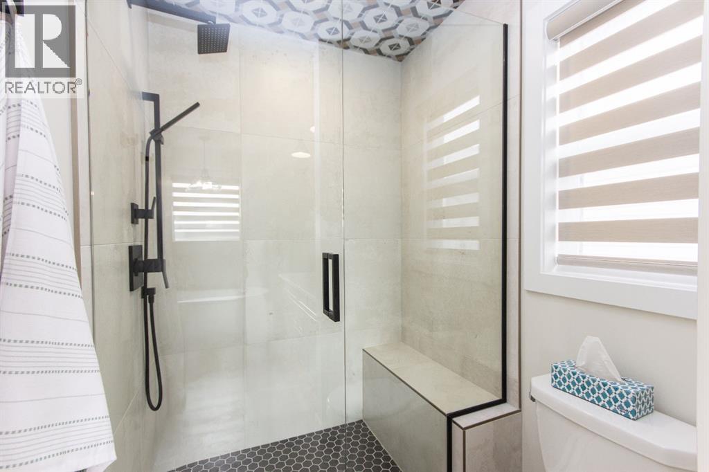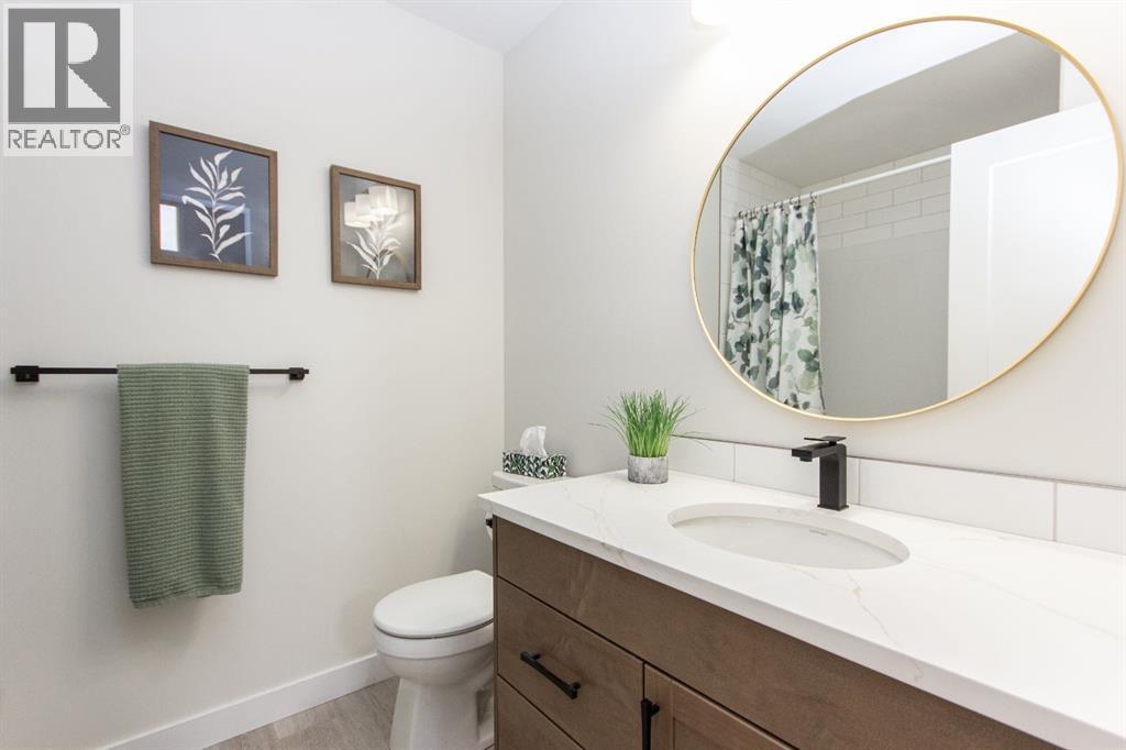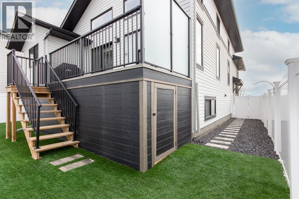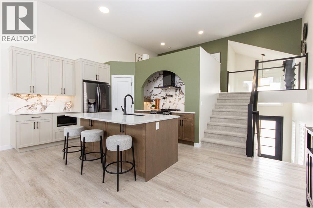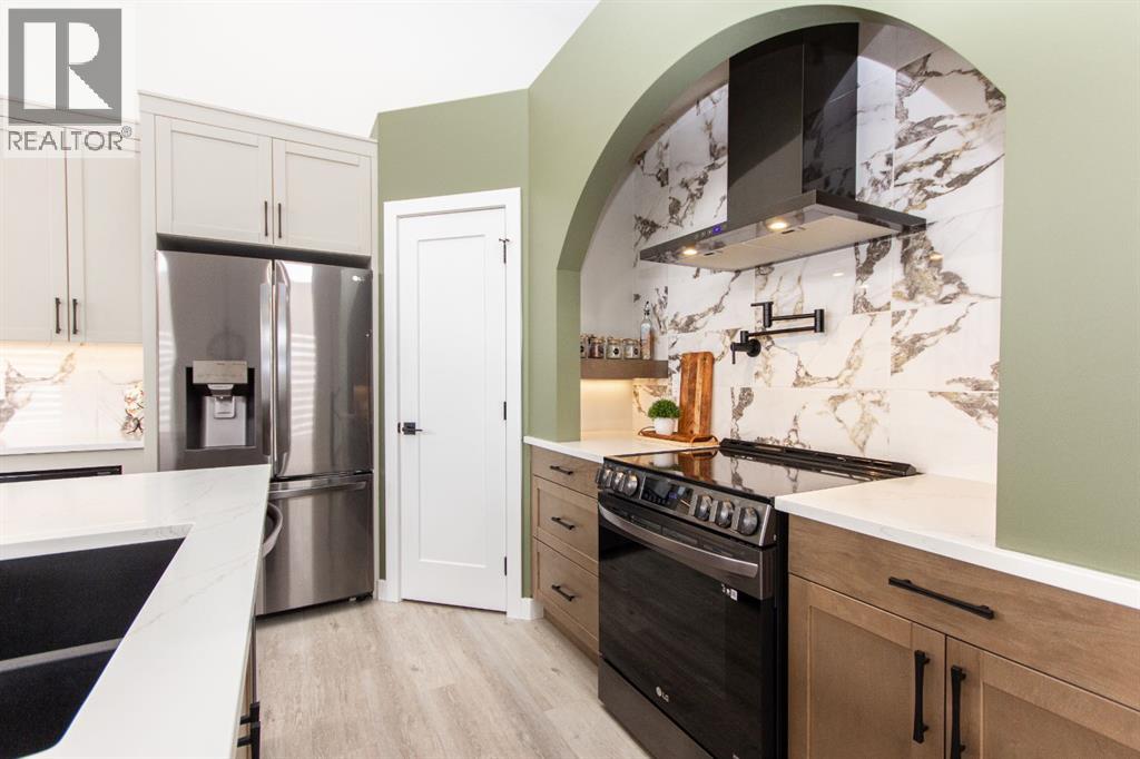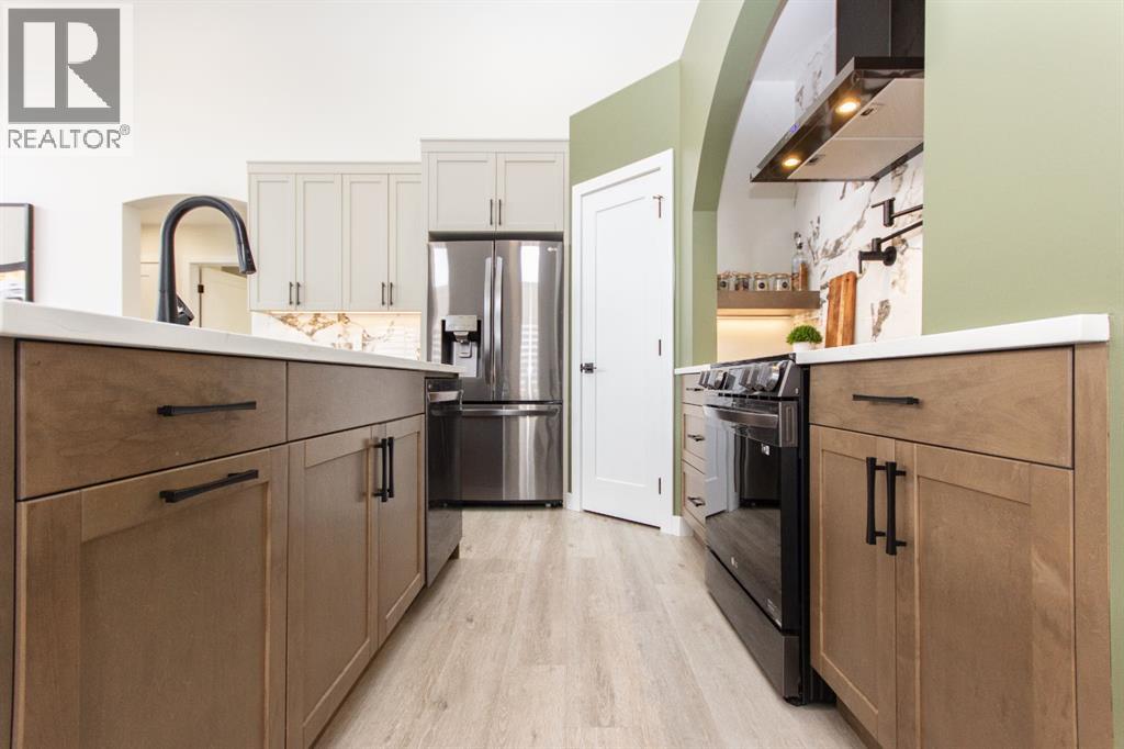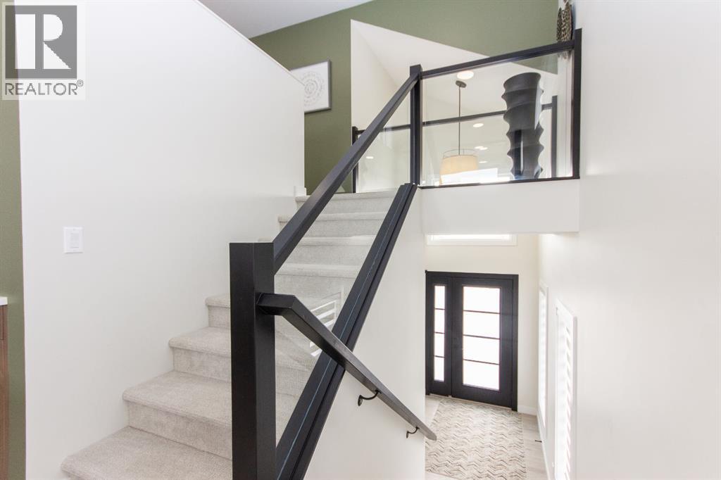 Welcome to this stunning modified bi-level located across from the pond in Evergreen! The bright, open concept main floor features 13’ ceilings, large windows with powered zebra blinds, beautiful vinyl plank flooring and a electric fireplace with a striking floor to ceiling feature wall. The kitchen is a true highlight with quartz countertops, plenty of cabinet space, black stainless-steel appliances, a corner pantry and a large centre island with eating bar and under mount sink. There is an impressive arched feature wall over the stove that is complete with hood fan, pot filler, and full tile backsplash. Two generous bedrooms and a full 4-piece bathroom complete this level. A few steps up lead you to your private primary suite featuring a loft sitting area overlooking the open main floor. The spacious primary bedroom easily accommodates king-sized furniture and offers a large walk-in closet and a luxurious 5-piece ensuite featuring a freestanding tub, separate fully tiled shower with bench, dual sinks with under-cabinet motion lighting, and an exposed brick feature wall.Downstairs, the fully finished basement includes in-floor heat, a large family room, a 4th bedroom, and another 4-piece bathroom. The separate laundry room provides plenty of space for a folding table plus additional storage. This home is equipped with hot water on demand, a high efficient furnace as well as a water softener.Step outside through the dining area onto the large west-facing low-maintenance deck complete with Duradek, aluminum railing, and a gas line for your BBQ. The deck is fully enclosed with hardie board, creating an impressive under-deck storage space. Enjoy your fully fenced and landscaped backyard complete with artificial turf, vinyl fencing, a large concrete patio, and firepit area, ideal for summer evenings and low-maintenance living.The front double attached garage is fully finished, heated, and upgraded with epoxy flooring.This home truly checks every box: style, space, upgrades, and an unbeatable location. Turn-key ready and packed with features! (id:63190)