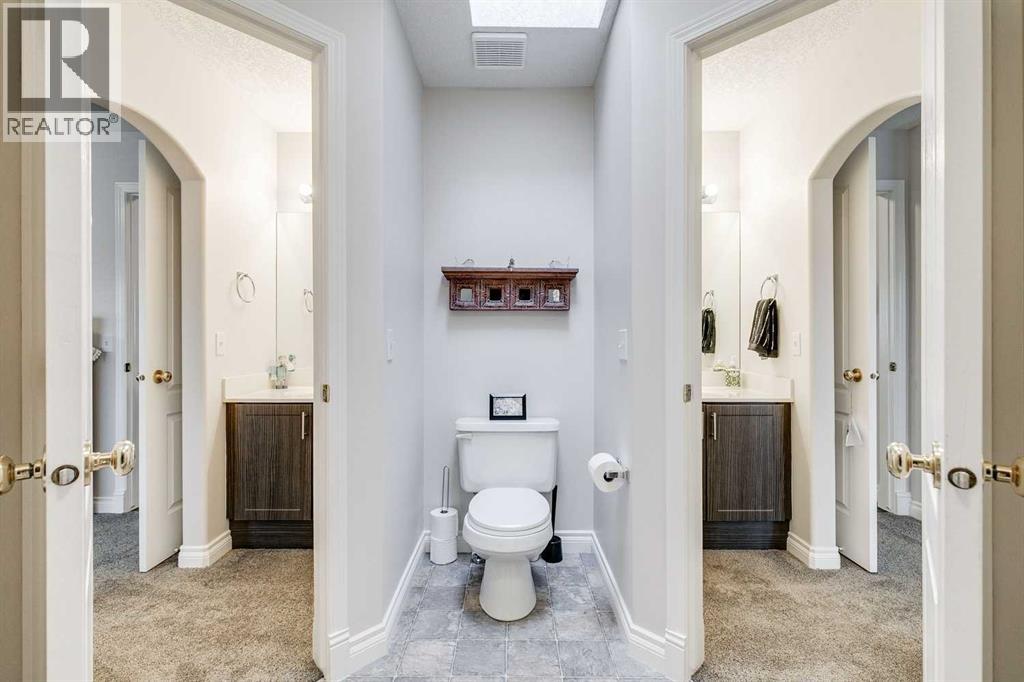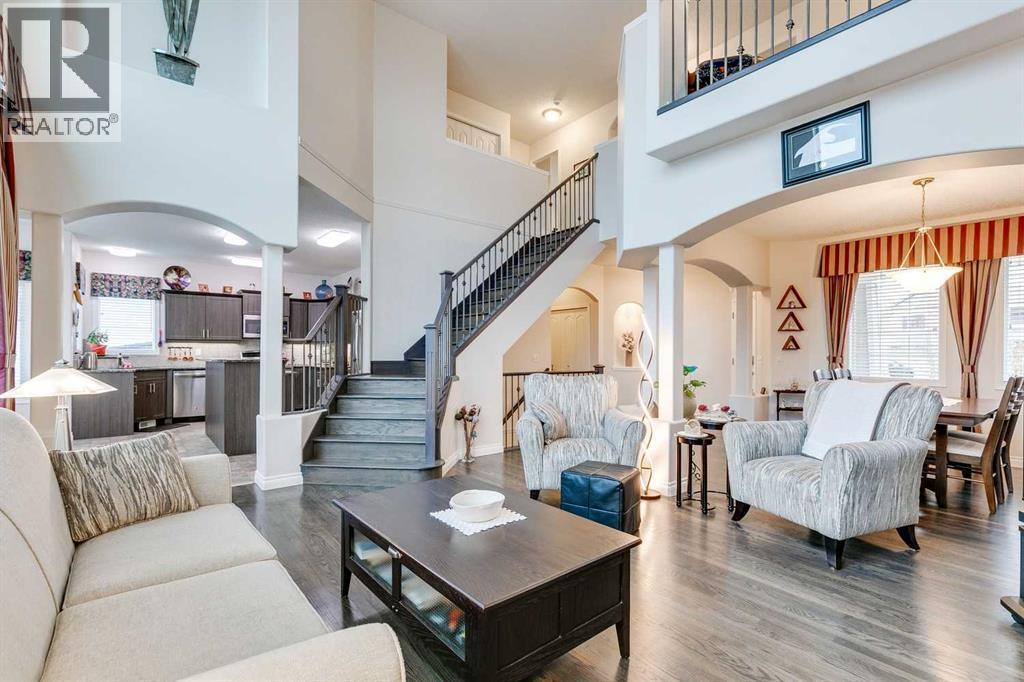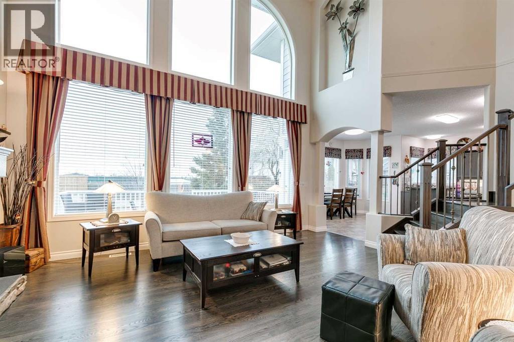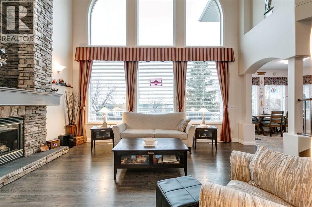Over 3000 square feet of living space. Tucked away in a quiet cul-de-sac, this beautiful home sits on a private 0.30-acre lot surrounded by mature trees, lush landscaping and gardens. Future-proof design with solar panels for the forward thinking buyer interested in a saving money and adding value in our ever growing green energy market! From the moment you step inside, you’ll notice the attention to detail and upgraded features throughout. Elegant pillars frame the formal dining room, while gleaming hardwood floors flow through the main living spaces.The living room impresses with its soaring cathedral ceiling and striking floor-to-ceiling stone fireplace — a stunning focal point for gatherings. A wall of windows offers expansive view of the back yard, and with the sunny South exposure the home has so much natural light year round. The open-concept kitchen features newer cabinetry, granite countertops, stainless steel appliances, a large island, and a walk-in pantry, offering both style and function. The breakfast nook overlooks the back gardens and is surrounded in windows. Step out the new patio door to the 23x14 low maintenance composite deck (done in 2015). The laundry is conveniently located on the main. Upstairs, a loft overlooks the main floor and provides the perfect work-from-home or reading space as there is amazing window views through the wall of windows in the main floor living area. Two spacious bedrooms share a full bathroom. One of the bedrooms has an upper balcony access-amazing. The primary suite offers a true retreat — complete with a walk in closet separate from the 4-piece ensuite featuring a walk-in shower, and a relaxing jetted tub. The fully developed lower level includes a hobby room , a large recreation area, and a family room with another fireplace. The two piece bath is plumbed for easy install of a shower where the storage cabinet is. This is the first time this home has been offered to the market and the care and attention to this home is exceptional. The garage is 23.5x19, there is rubber shingles (installed in 2015 under warranty for 50 years from install), Hardy Board siding (installed in 2015) Low E windows, Furnace and Hot Water Tank (2015), and 9 Solar Panels for energy efficiency (2023). Rear alley access and Rv parking. Don't miss out! (id:63190)
