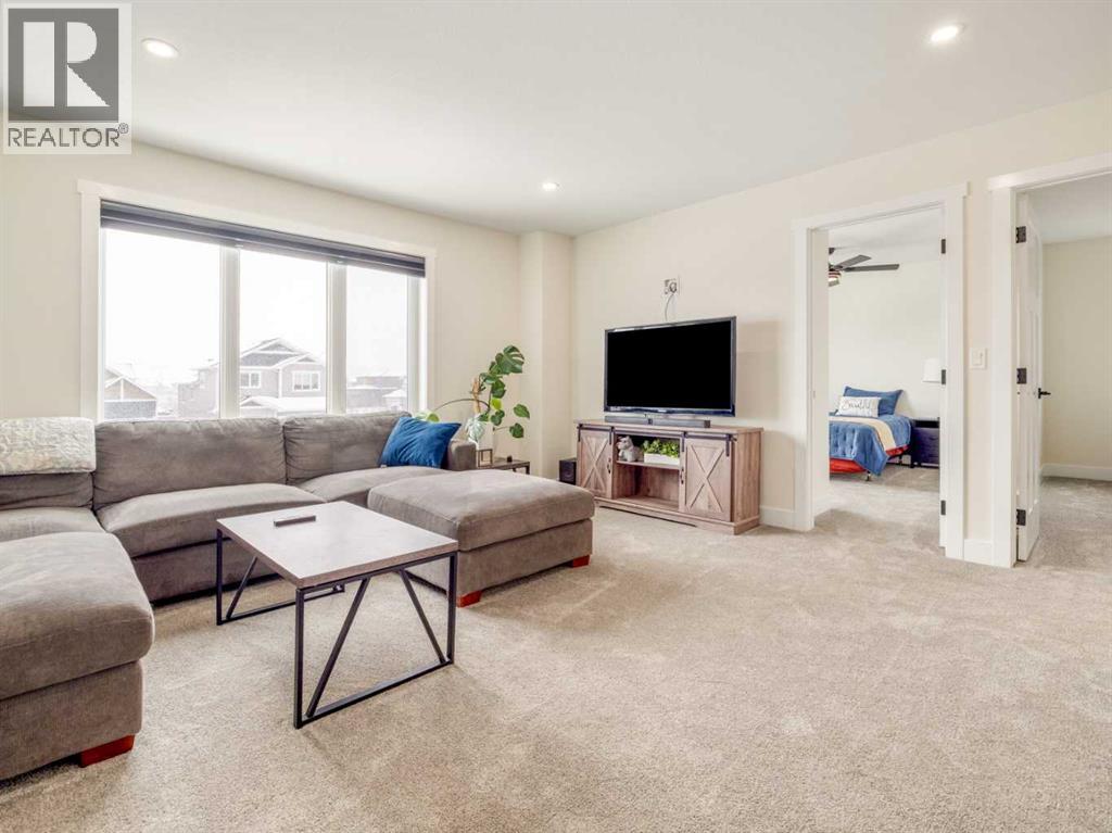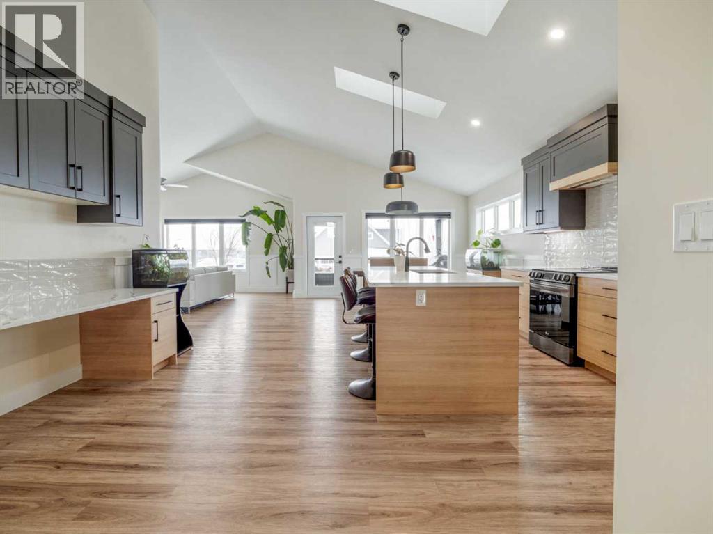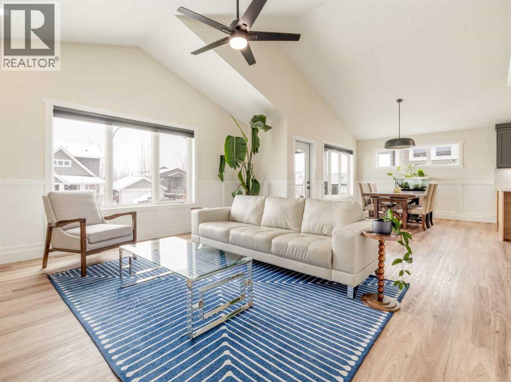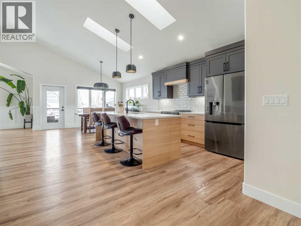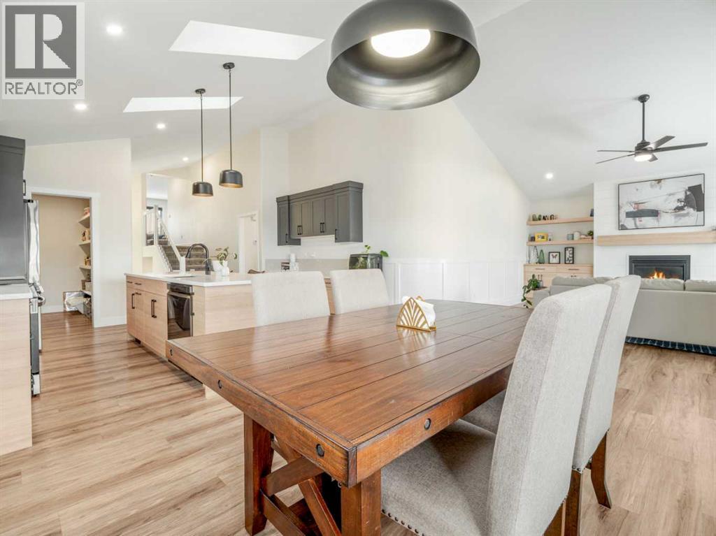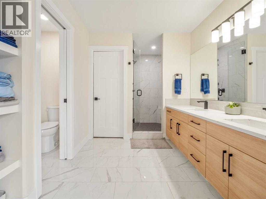 Incredible 2 year old large modified bi-level home in Cottonwood Estates originally built by Grizzly Ridge Developments! This 5 bed, 3.5 bath home has hardiplank exterior siding with stone accents, and a MASSIVE concrete front driveway that fits 6 vehicles! Heated garage is also a 26x29 and easily fits 2 more vehicles. Large welcoming entry. A half staircase to main floor showcases a large vaulted ceiling and vinyl plank flooring. Kitchen has upper grey upper cabinets, and lower lighter wood pattern. Kitchen has quartz counters, stainless steel appliances, and butler pantry with more cabinets and counterspace. Dining room is a good size and has large window and door to covered deck out back with gas line and water tap. Living room has custom built-in shelving and cabinets with gas fireplace and mantle centered on a feature wall with shiplap design. Main floor also has primary bedroom with ensuite that features double sinks, large tiled walk-in shower, separate toilet room, and walk-in closet with laundry machines. There is also another 2 piece bathroom on the main. Upper level above garage features a large bonus room with big hall closet, 2 big bedrooms, and a full bathroom with tub/shower combo. Walk-Out Basement with 9 foot ceilings is fully developed with wet bar featuring space for a full size fridge, family room with feature floor to ceiling stone wall surrounding the gas fireplace, and closet and door to covered patio out back. There are also 2 more large bedrooms each with their own walk-in closet, a full bathroom with tub/shower combo, and a laundry room(currently being used as a small office) with counter and cabinets. Yard is fenced and landscaped with a nice shed. Home has conveniences of central a/c and tankless hot water! This home is turn-key ready to move in and enjoy! (id:63190)