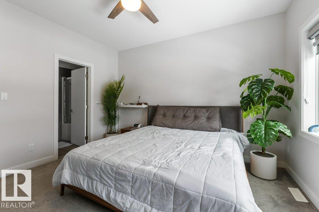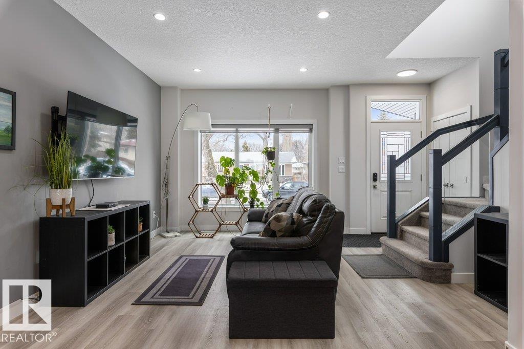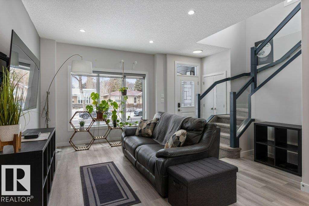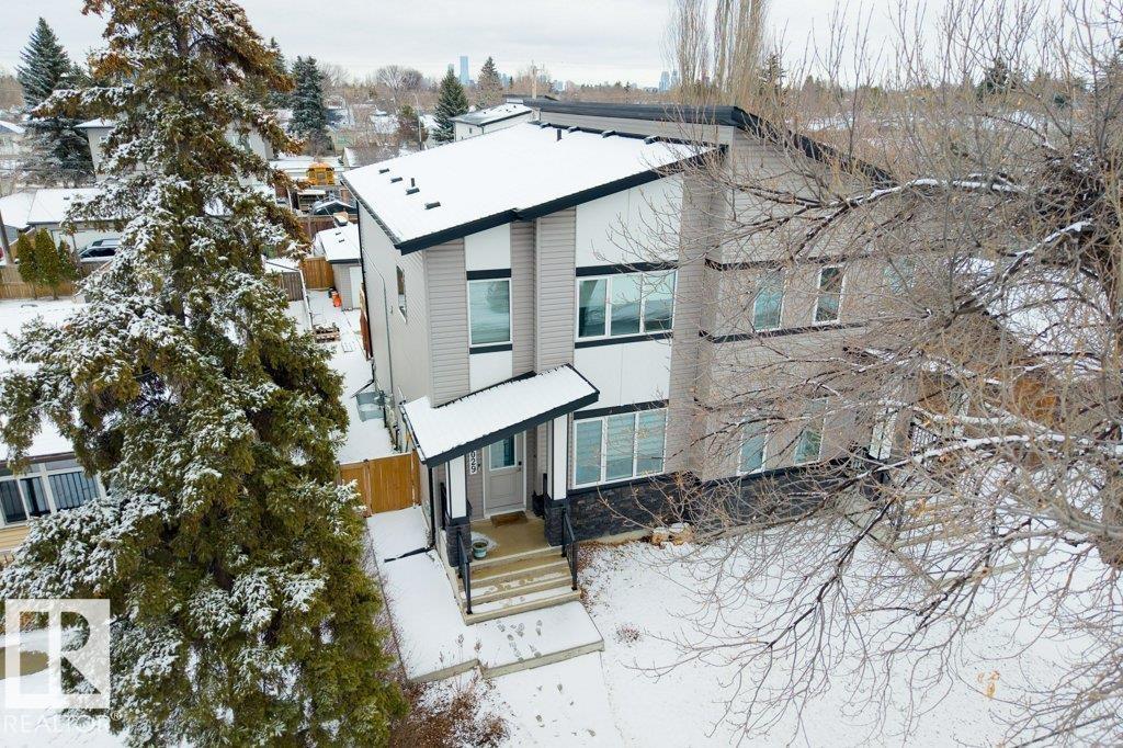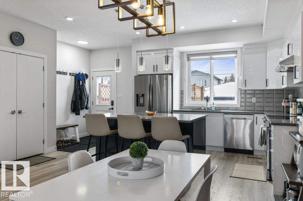 This stylish two-storey half duplex offers modern living in a mature central west Edmonton neighborhood, blending established charm with excellent access to key routes and everyday essentials. Enjoy quick connections to shopping, schools, transit, and major roadways while living on a quiet, tree-lined street. Inside, the home features an open-concept layout with 9’ ceilings on all three levels, large windows, vinyl plank flooring, elegant tile, quartz countertops, custom cabinetry, and a designer backsplash. A separate side entrance adds flexibility for future potential. The main floor includes a rear kitchen, spacious dining area, cozy living room, and a 2-piece bath. Upstairs offers a large primary suite with walk-in closet and ensuite, plus two additional bedrooms and a full bath. The unfinished basement is ready for your vision. A double detached garage and deck complete this well-located home. This property is ideal for families or investors seeking both comfort and convenience in a prime location. (id:63190)