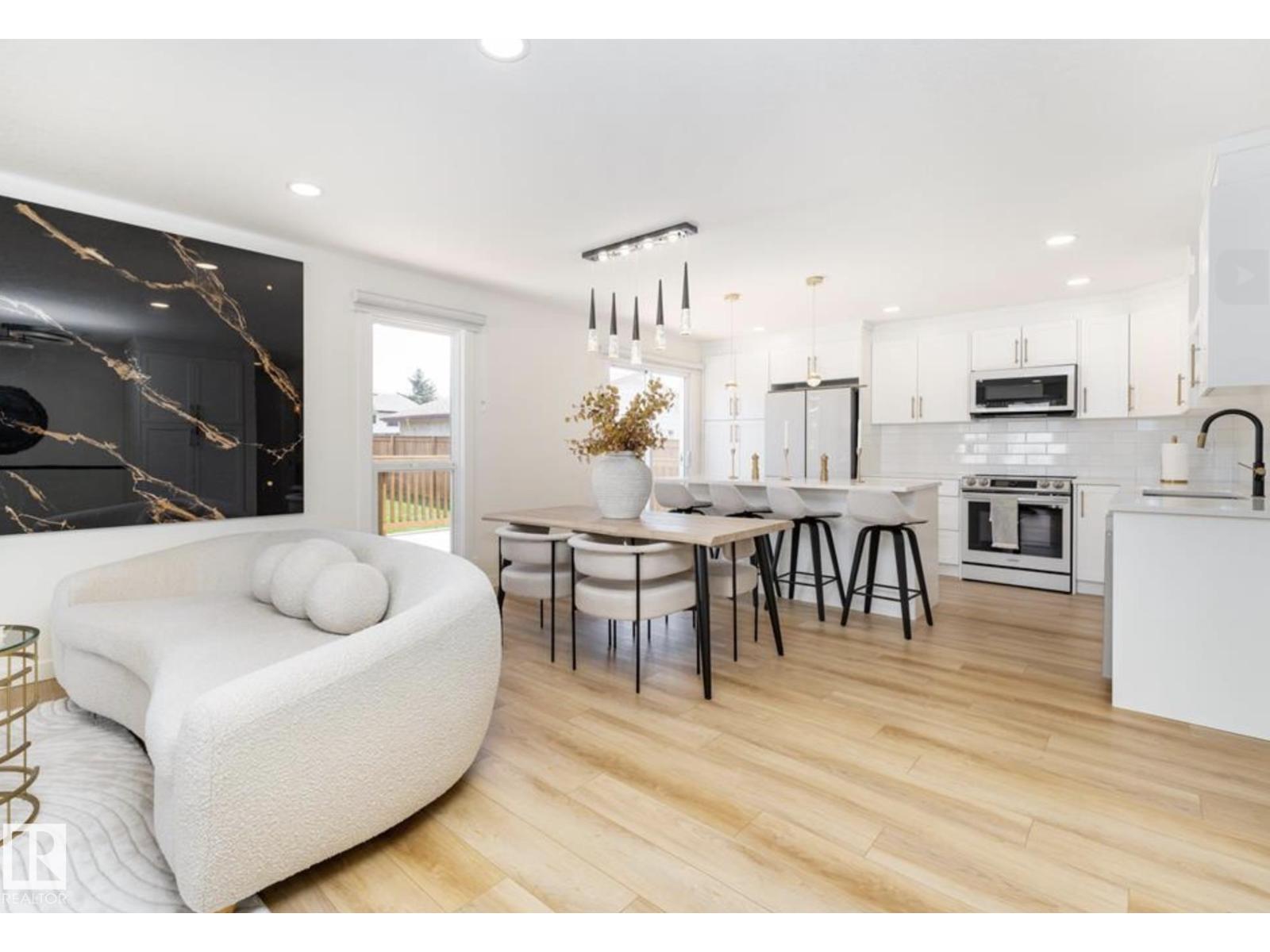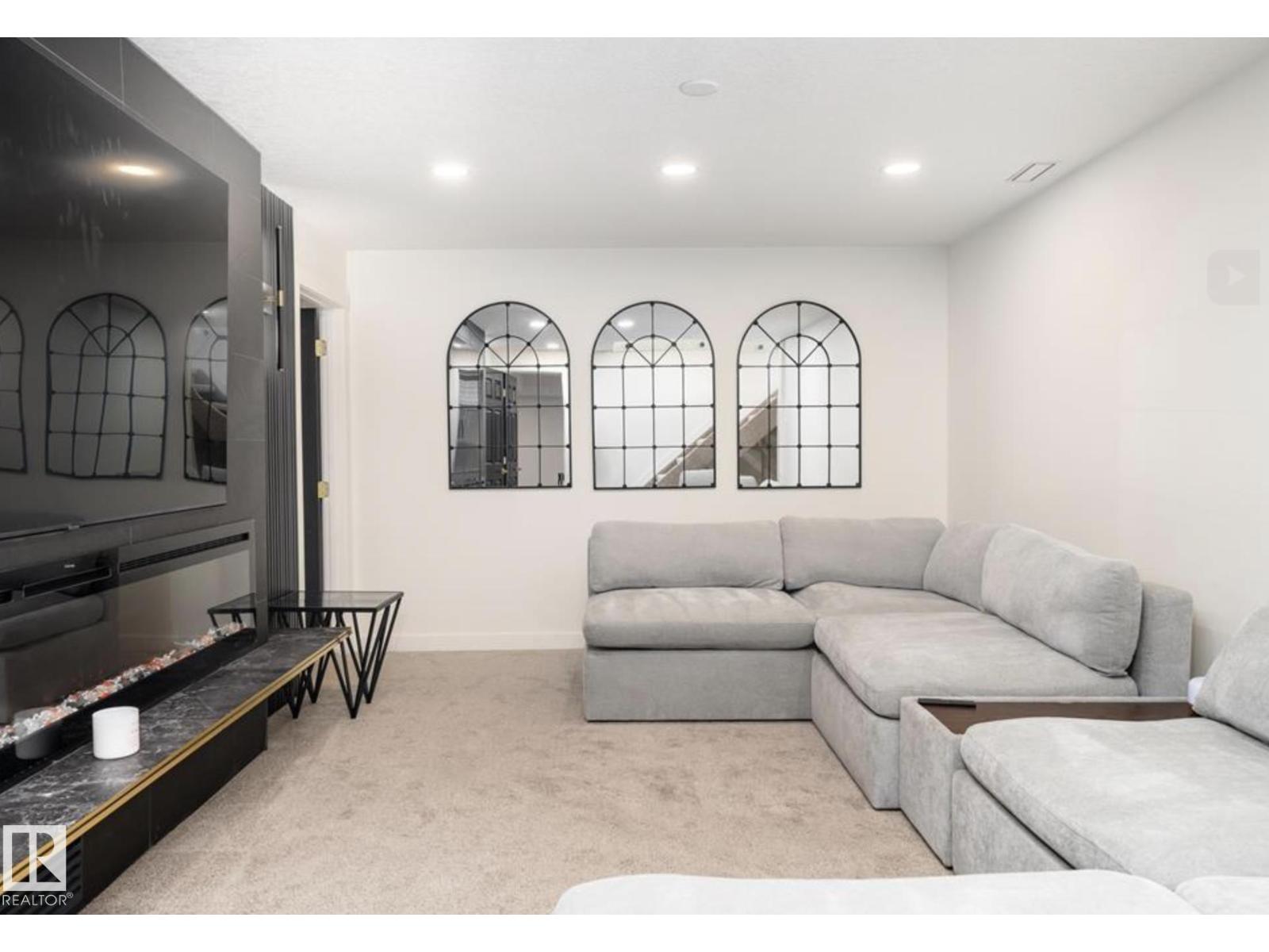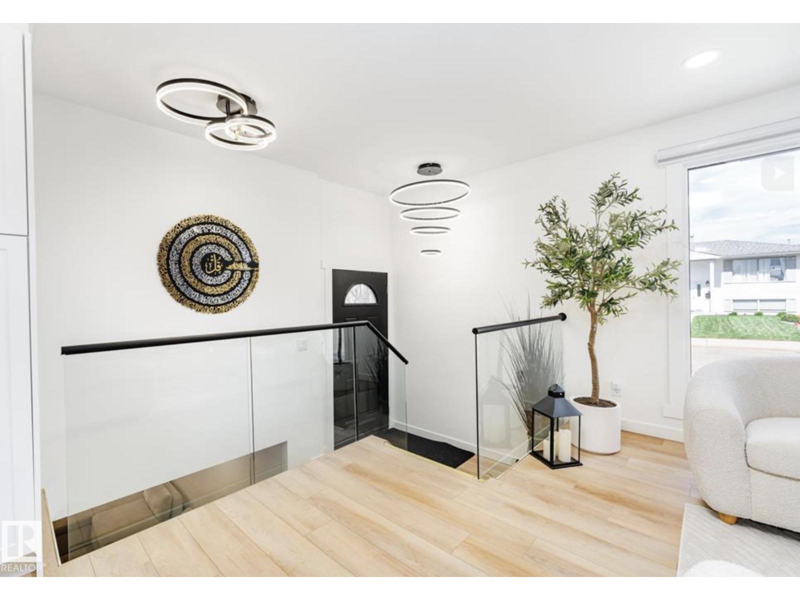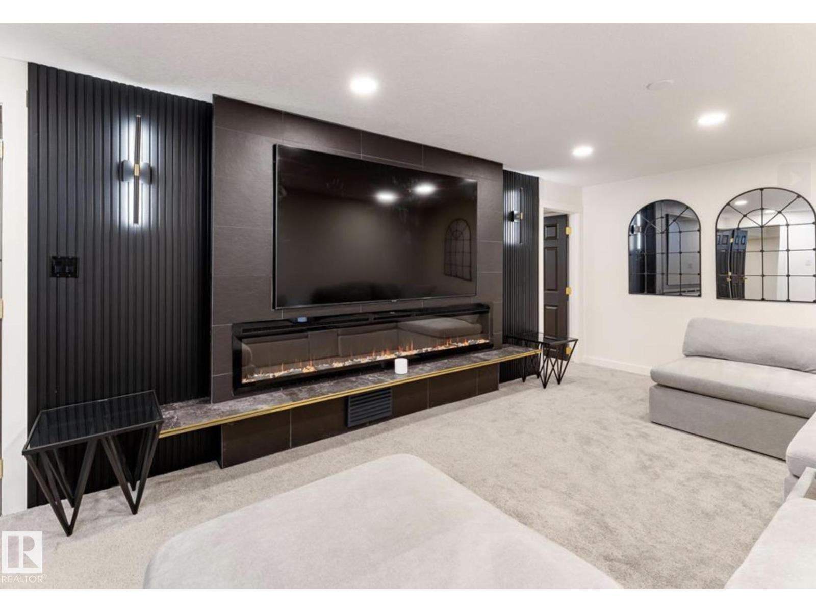 Discover the newest standout in Baturyn... a home that redefines modern living in an established community. This isn't just a renovation; it’s a contemporary masterpiece featuring a striking designer porcelain feature wall and sleek glass railings that immediately set a sophisticated tone. The chef-inspired kitchen is the heart of the main floor, equipped with premium appliances and flowing seamlessly into a sunlit dining space designed for hosting. The main floor offers three spacious bedrooms, including a primary retreat with a chic private ensuite. The wow factor continues in the fully finished basement, which features a custom fireplace media wall and a layout designed for extended family or guests. The lower level includes two additional bedrooms, one of which is a true VIP retreat with its own private lounge and ensuite bath. Situated on a commanding corner lot with an oversized double garage and expansive deck, this home offers the perfect blend of luxury finishes and functional family living. (id:63190)