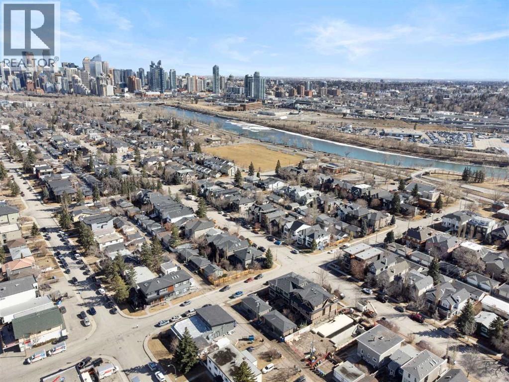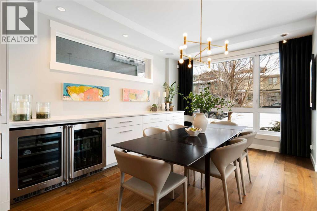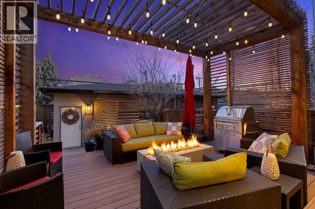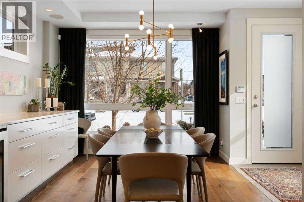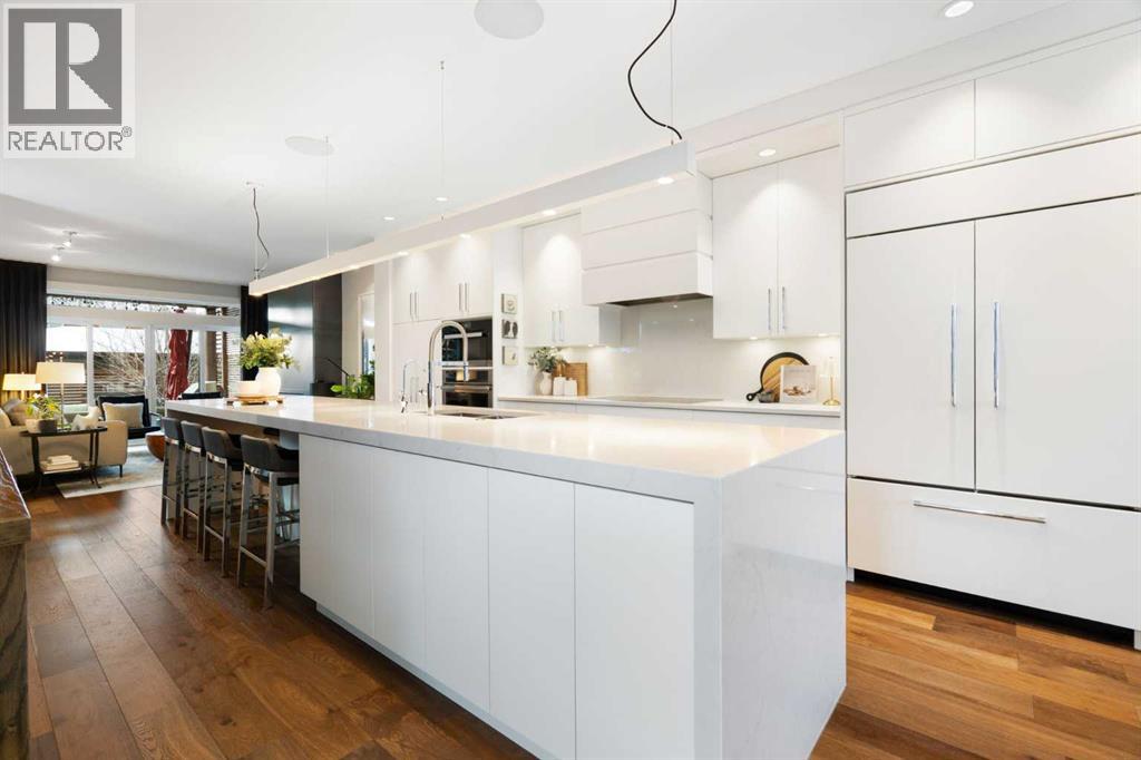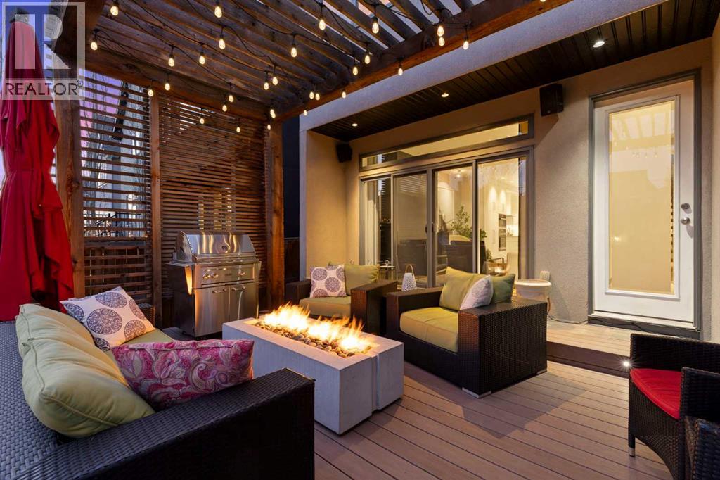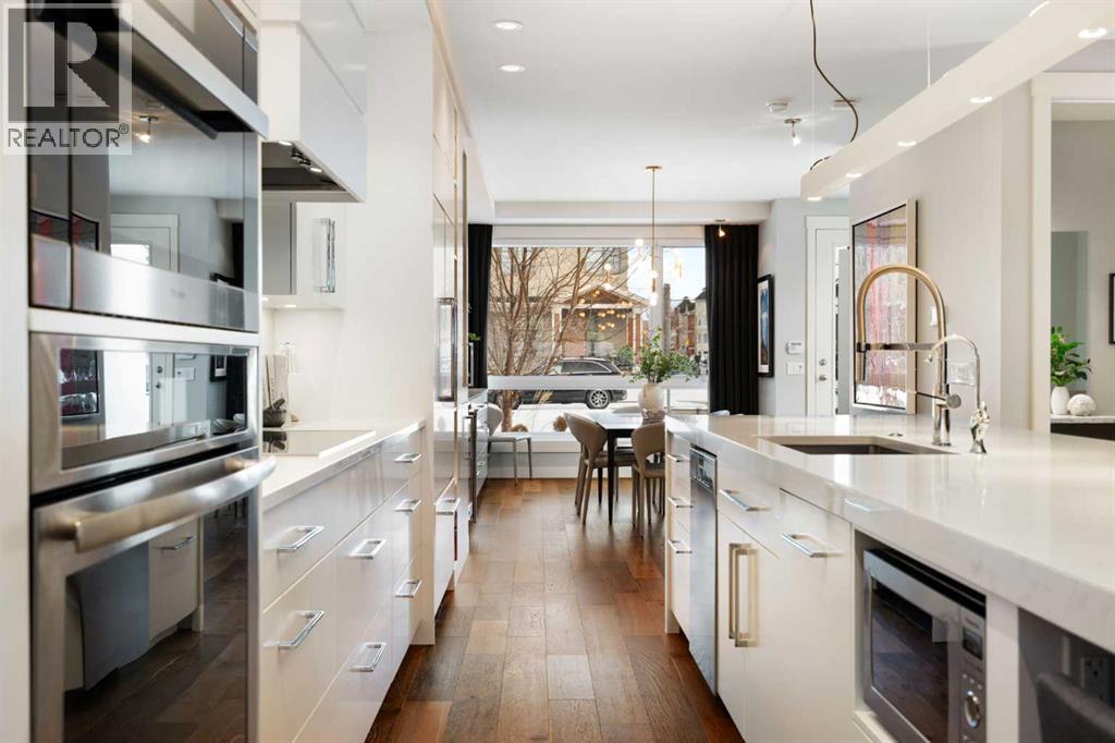 Welcome to 2201 Bowness Road NW, a rare and beautifully curated four-level home in one of West Hillhurst’s most sought-after pockets. Situated on a prime corner lot, this exceptional residence offers stunning downtown views, a sunny south-facing backyard, and over 3,700 sq. ft. of thoughtfully designed living space. Natural light pours through strategically placed oversized windows across every above-grade level, creating a bright and inviting atmosphere throughout. The main floor is a true showpiece, featuring engineered hardwood, striking open-riser wood staircases, and a statement raw metal gas fireplace. At the heart of the home is a nearly 16-foot waterfall island with built-in storage and integrated seating, perfectly paired with a chef-inspired kitchen complete with premium Sub-Zero, Miele, and JennAir appliances, custom cabinetry, and designer lighting. Sliding doors open seamlessly to the pergola-covered patio, extending the living space outdoors. The second level is ideal for family living, offering spacious secondary bedrooms, custom closet built-ins, a rare 6-piece bath with heated floors, a flexible bonus/family room, and access to the first upper deck. One of the bedrooms enjoys beautiful south-facing downtown views. The entire third level is dedicated to an exceptional primary retreat — a true private sanctuary. Enjoy your own covered balcony, wet bar and coffee station, custom open closet, and a luxurious 5-piece ensuite with heated tile floors, freestanding tub, and a stunning two-way fireplace. The fully developed basement offers 9-foot ceilings, a large recreation room with full wet bar, guest bedroom, full bathroom, and rough-in for in-floor heat. Outdoor spaces have been professionally curated with composite decking, pergola, mature landscaping, lighting, and rebuilt upper decks with vinyl decking and metal cladding. Additional features include air conditioning, zoned heating and cooling, Hunter Douglas blinds, built-in speakers, Vacuflo, Kineti co water system, security system, and insulated garage with Gladiator storage. A truly exceptional inner-city offering just minutes to downtown, Kensington, the Bow River pathways, and some of Calgary’s best amenities. (id:63190)