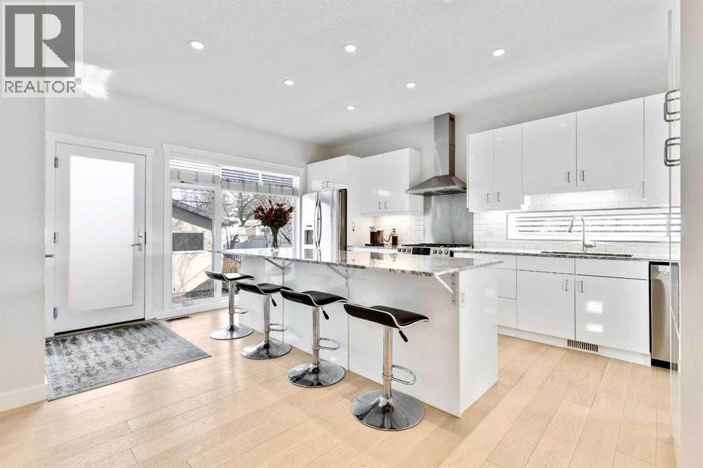 Just steps away from West Confederation Park, this custom-designed two-story home offers a rare blend of modern sophistication and Parkside tranquility. This fully detached residence was meticulously built with an unwavering attention to detail, offering peace, quiet, and abundance of natural light. Upon entry, you are greeted by an expansive open-concept living room featuring 9' ceilings, engineered hardwood floors, and a sleek electric fireplace. The heart of the home is a central dining area that transitions seamlessly into a white-on-white chef’s kitchen. Designed for both function and style, the kitchen boasts under-cabinet lighting, granite countertops, a massive island with a breakfast bar, and a premium appliance package with a gas range. The upper level is bathed in sunlight, thanks to a well-placed hallway skylight. The expansive master suite serves as a true sanctuary, featuring a unique private balcony—perfect for a morning coffee or an afternoon read. The suite is completed by a walk-in closet and a spa-like 5-piece ensuite equipped with a jet tub, dual vanities, and its own skylight. Two additional bedrooms, a 4-piece main bath, and a dedicated laundry room provide ample space for family or guests. The finished lower level continues the theme of light and space, offering a large family room with a sizable window, a 3-piece bathroom, and a spacious fourth bedroom. Perfectly situated near the University of Calgary, the C-Train, and premium local shopping, this home places you at the center of everything while maintaining the serenity of a park-adjacent lifestyle. (id:63190)