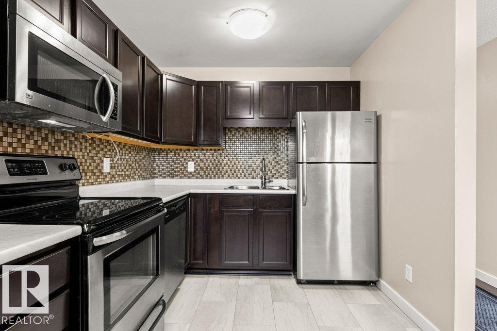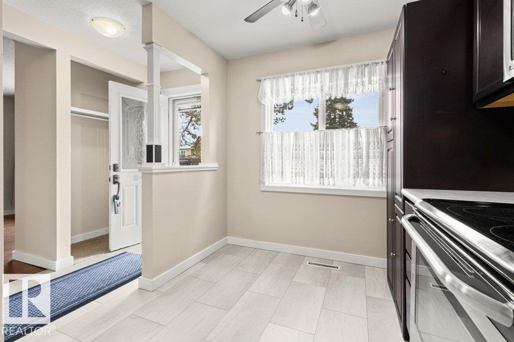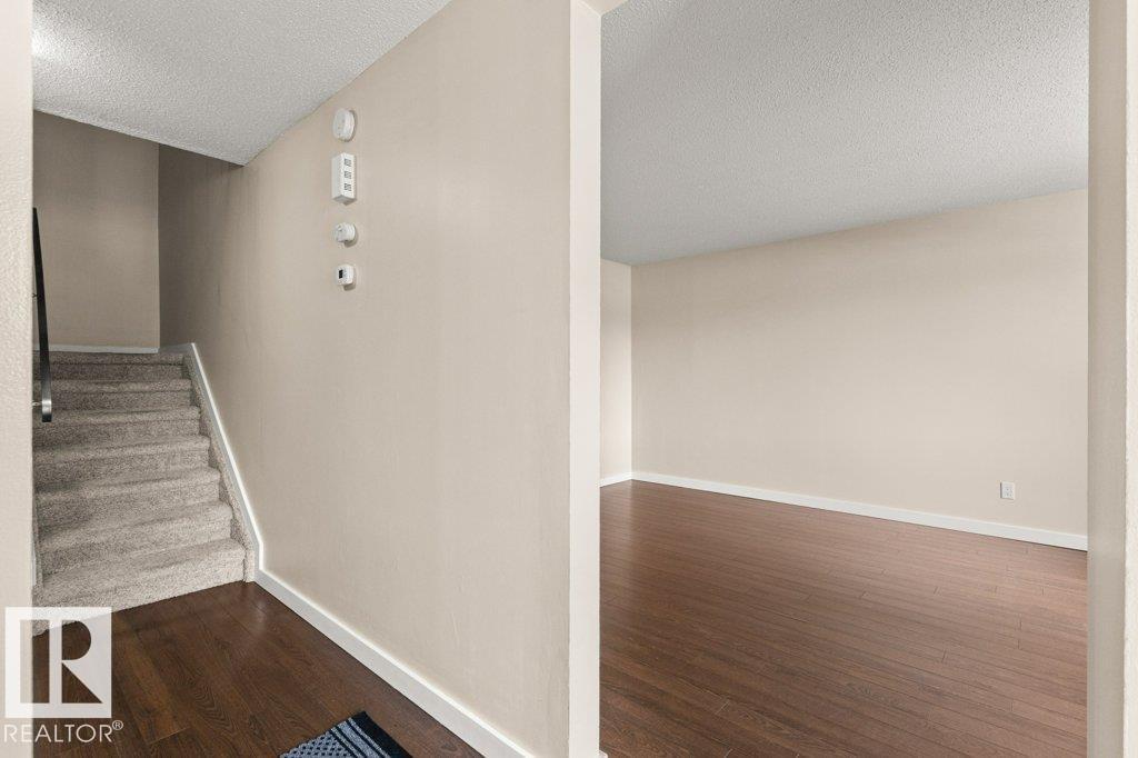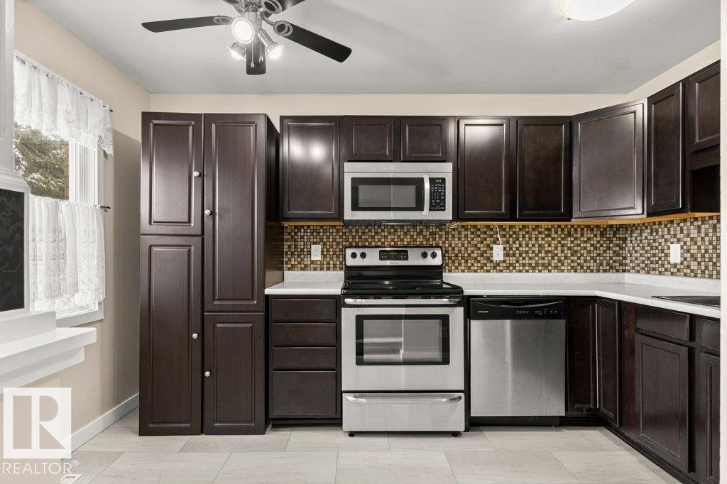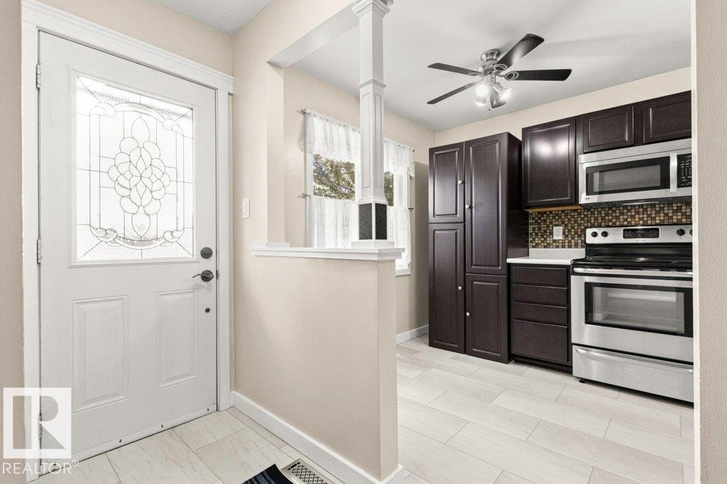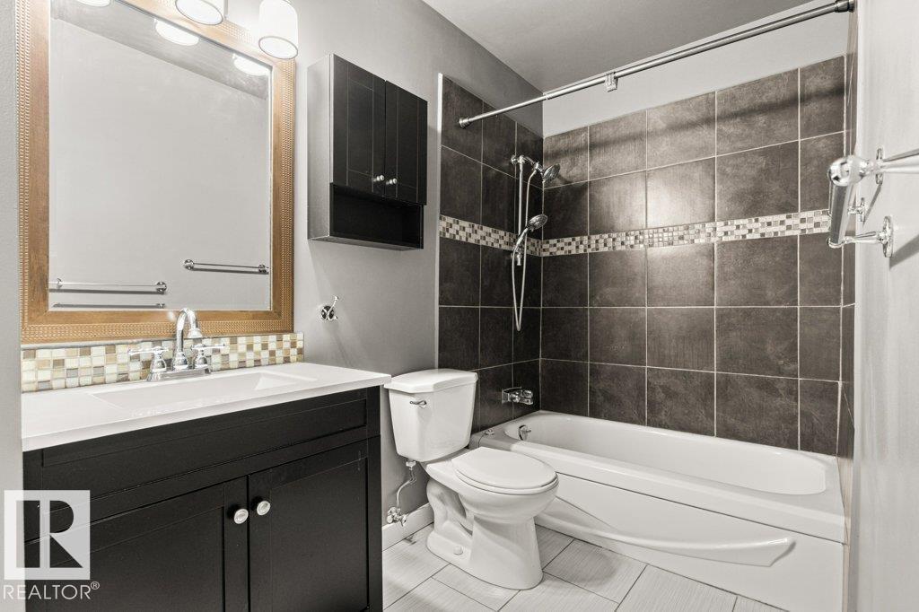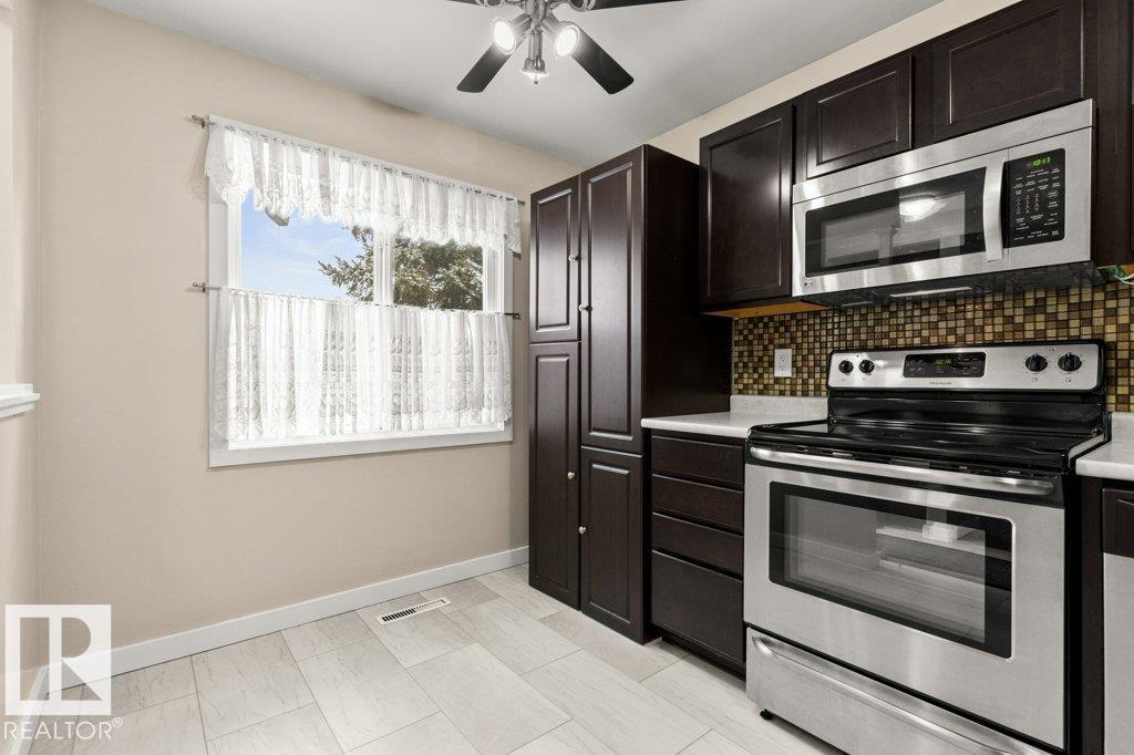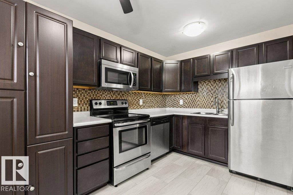IMMACULATE & MOVE-IN READY! CUTE & CLEAN townhouse checks ALL the BOXES! Freshly painted 2 storey END UNIT in Northmount has a fully fenced yard w/ LG. deck. Impressive condo w/ new luxury vinyl flooring in kitchen & entrance. Kitchen w/ dining nook has loads of cupboards & counter space, stainless steel appliances, trendy backsplash & pantry cabinet gives many options. Adjacent living room/dining room offers big picture window & flooring w/ warm rich tones. 2-piece bath is stylish w/ extra cabinet + more storage space complete main level. Plush carpeting on the stairs leads to upper level; featuring massive primary w/ brand new carpet, oversized double closet & ceiling fan. Another oversized bedroom w/ lg- closet & 4-piece bath w/glamour mirror & lighting plus tile tub surround. FULLY FINISHED basement has endless opportunities; home office, gym, media room or playroom. Utility room w/ workbench & built-in cabinets. Close to Henday, Yellowhead, Downtown, Transit, Shopping & Schools. PLUS LOW CONDO FEES! (id:63190)