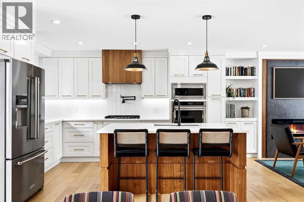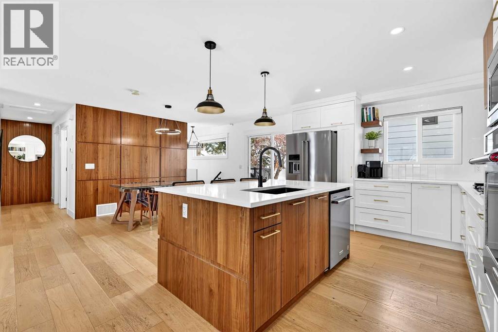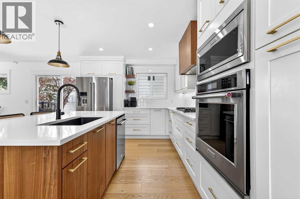 The main floor offers a bright and functional layout, anchored by a beautifully updated kitchen featuring quartz countertops, a gas cooktop, built in oven, and a large island that opens seamlessly into the dining and living areas. Thoughtful design elements such as custom wood accents, barn style doors, and contemporary lighting add character while maintaining a clean, modern feel throughout. The primary bedroom includes a walk in closet and a well appointed ensuite, while an additional bedroom and full bathroom complete the main level.The fully developed basement expands your living space with a large recreation area, wet bar, two additional bedrooms, and another full bathroom, making it ideal for guests, entertaining, or growing families. Two fireplaces, including one in the main living area, create a warm and inviting atmosphere year round.Outside, enjoy a private, landscaped backyard perfect for relaxing or hosting, along with a heated double detached garage and additional parking. Recent updates including a new furnace provide added peace of mind.Lakeview is known for its unbeatable access to outdoor amenities, with the Glenmore Reservoir, walking and biking trails, and Weaselhead Flats just minutes away. With excellent schools, parks, and quick access to downtown, this home offers the perfect balance of lifestyle and convenience in one of Calgary’s most established and desirable neighbourhoods. *New furnace this year* (id:63190)