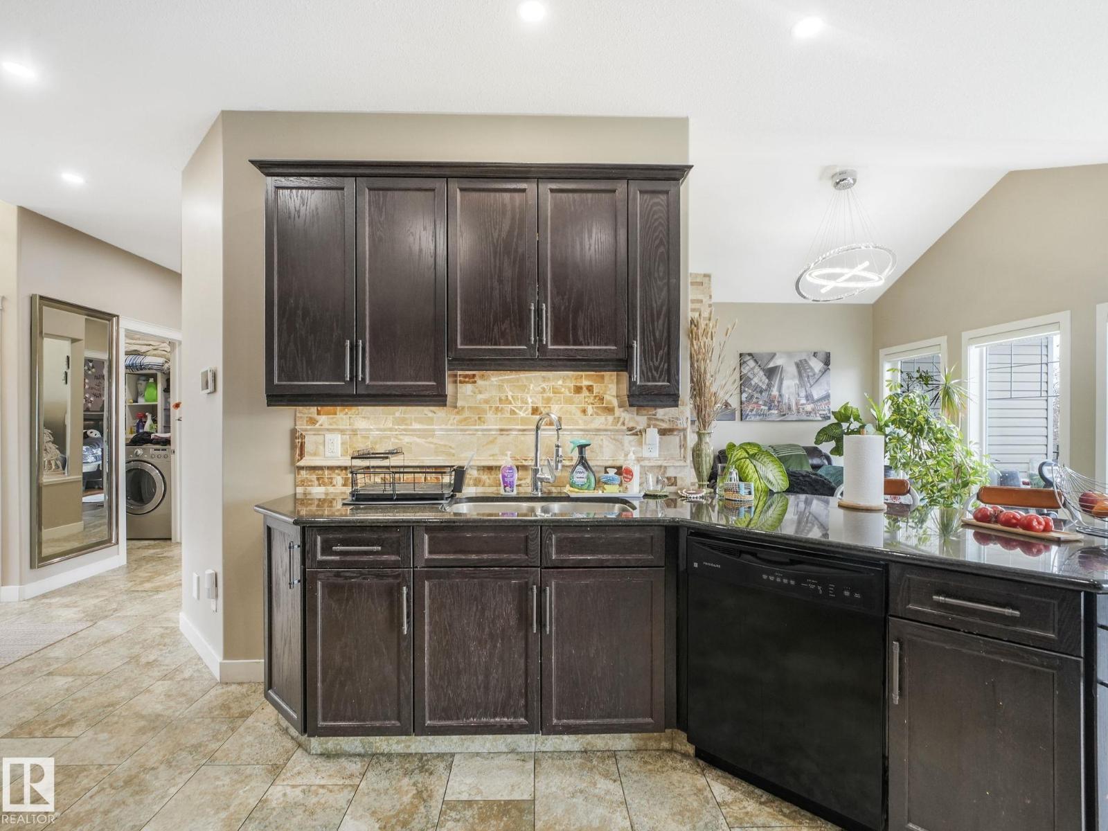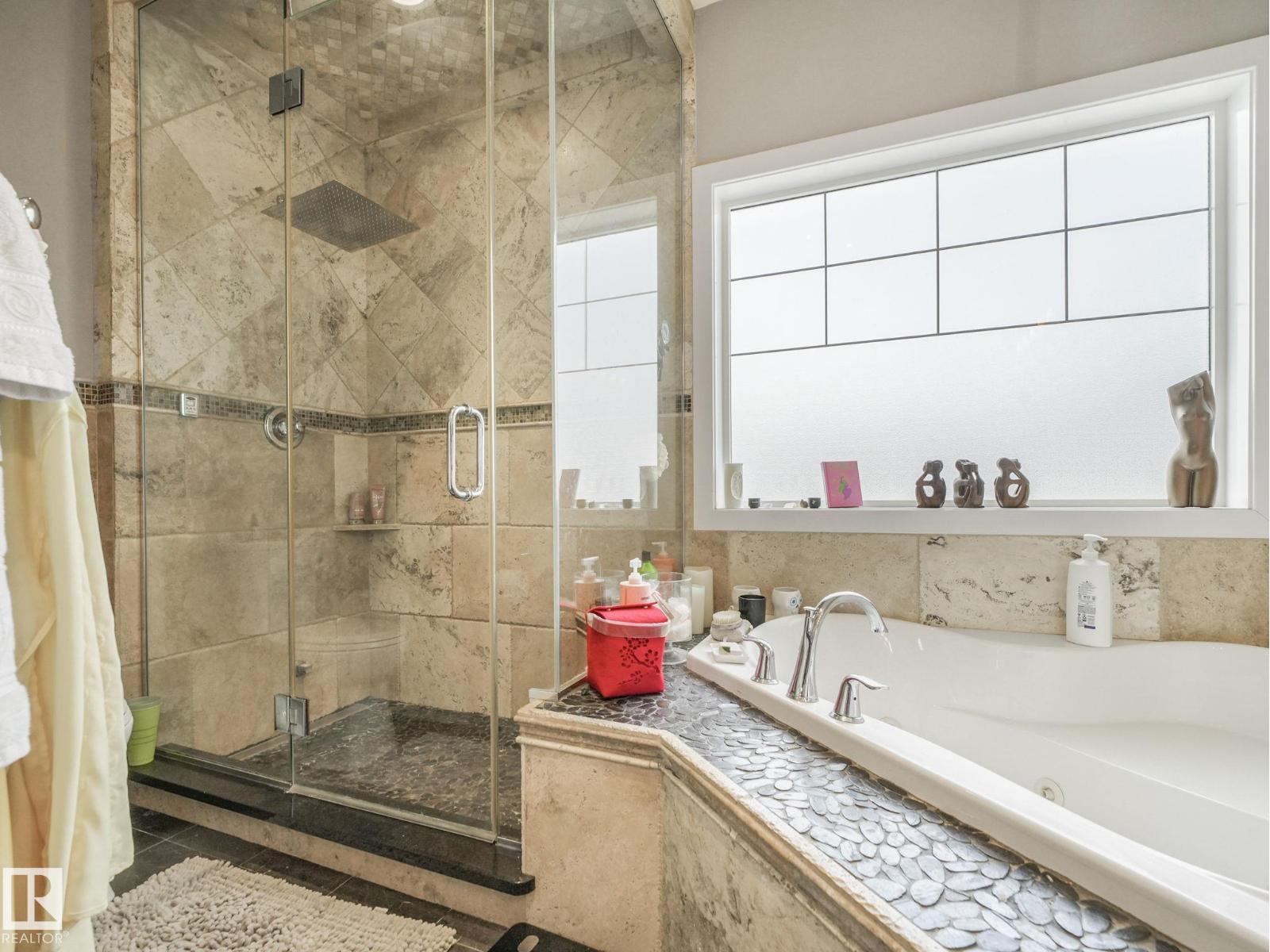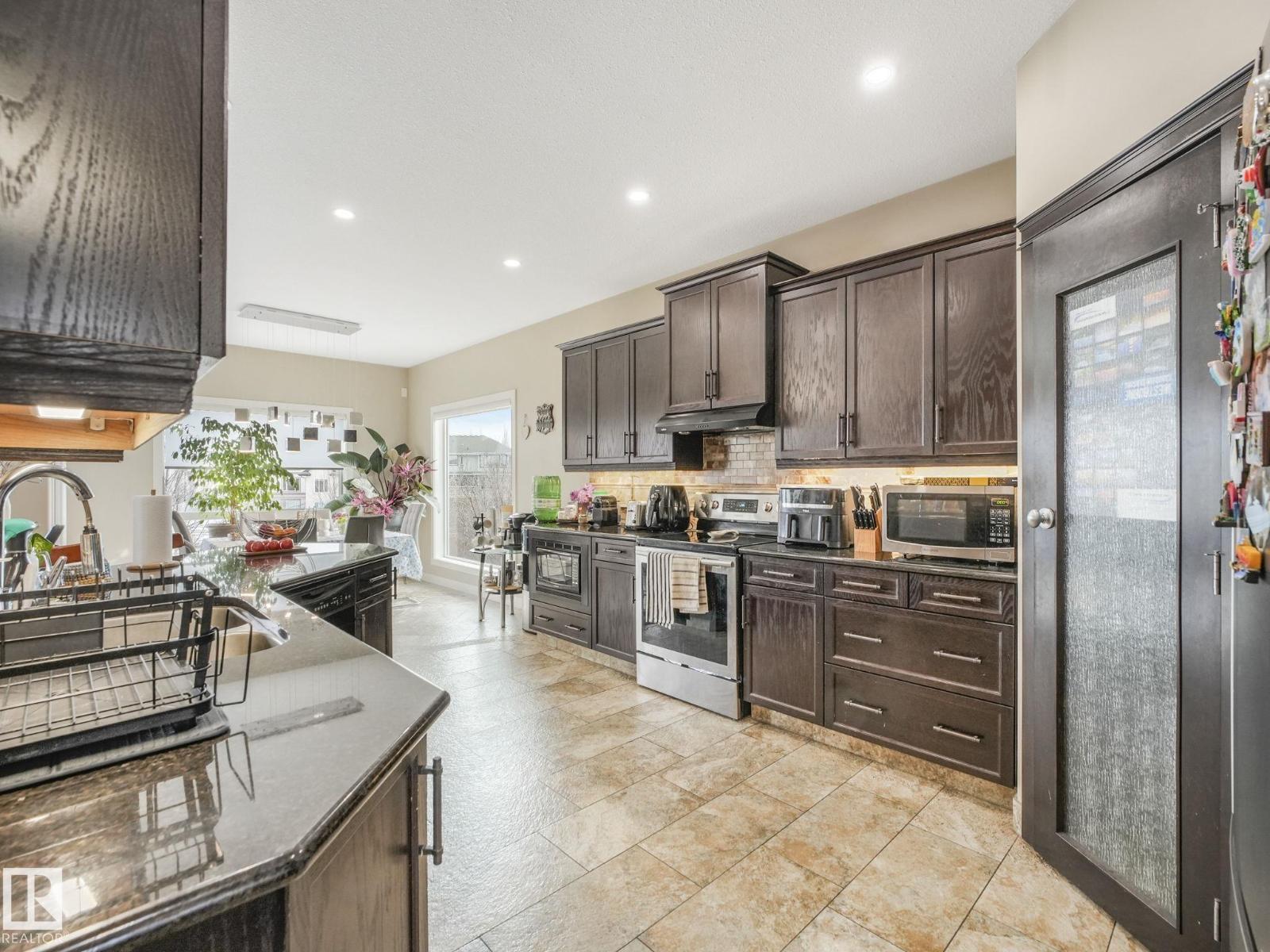 Amazing location with WALKOUT basement LEGAL suite backing onto the lake. This walkout bungalow features a fully finished legal suite, making it the perfect mortgage helper or investment property, offering stunning views and serene surroundings. The main floor boasts a gourmet kitchen with stainless steel appliances, granite countertops, and rich Brazilian walnut hardwood flooring. A two-sided travertine ledge-stone fireplace adds warmth and elegance, shared with the spacious primary bedroom, which also includes a luxurious ensuite with a large shower and heated marble floors. The legal suite is finished to a high standard with in-floor heating, its own laundry, a modern kitchen with quartz countertops and double wall ovens, and a 4-piece bathroom featuring a walk-in shower and large tub. Complete with a massive aggregate concrete deck, this home is perfect for relaxing or entertaining while taking in the beautiful park and pond views. (id:63190)