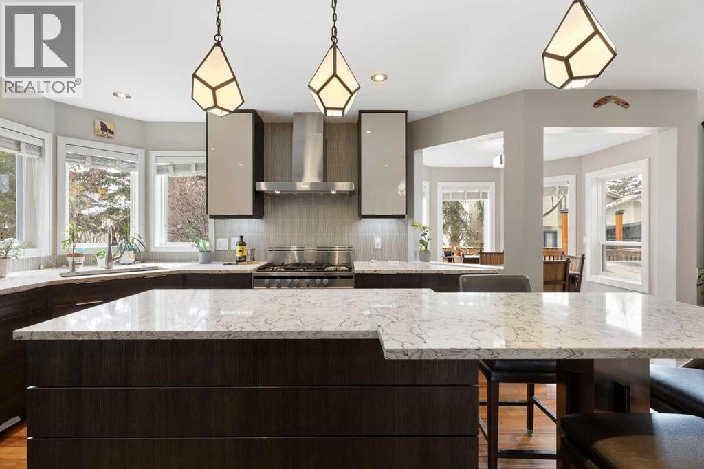 Nestled on a quiet cul-de-sac and offering nearly 4,000 sq ft of beautifully developed living space, this exceptional home is just a short stroll to the breathtaking Fish Creek Provincial Park. From the moment you step inside, the marble-tiled entry sets a tone of timeless elegance, flowing into formal living and dining rooms that are perfect for entertaining. The heart of the home is a chef-inspired kitchen featuring quartz countertops, a multi-level island, ample cupboard space, a walk-in pantry, and a cozy nook, all overlooking a stunning family room with soaring ceilings, custom built-ins, and curated spaces for artwork. The main floor is thoughtfully designed with a private office, convenient laundry, and rich hardwood flooring that continues up the stairs and throughout the upper level. Upstairs, the spacious primary retreat offers a quiet reading area, a luxurious five-piece ensuite with dual sinks and a soaker tub, plus two additional generously sized bedrooms. A bright, sun-filled landing overlooks the family room below, creating an open and airy feel throughout. The fully developed basement expands your living space with a fourth bedroom complete with its own 3-piece ensuite, a recreation room, a dedicated home gym area, and wine storage. Recent upgrades include newer windows (majority 2023), updated dual furnaces (2007), hot water tank (Oct 2025), central air conditioning (2022), water softener, and a filtration system—providing comfort and peace of mind. Step outside to your own private oasis: a sunny south-facing backyard with a two-tiered deck, perfect for summer BBQs, surrounded by mature trees for added privacy. All this, just minutes from Fish Creek Park, shopping, and the LRT for an easy downtown commute. (id:63190)