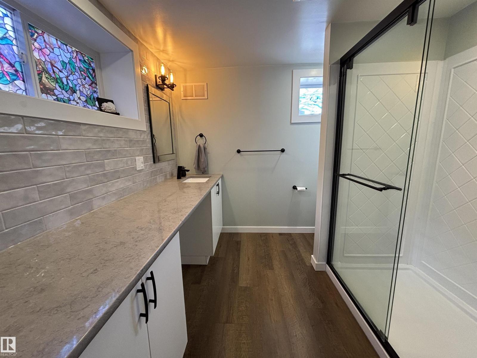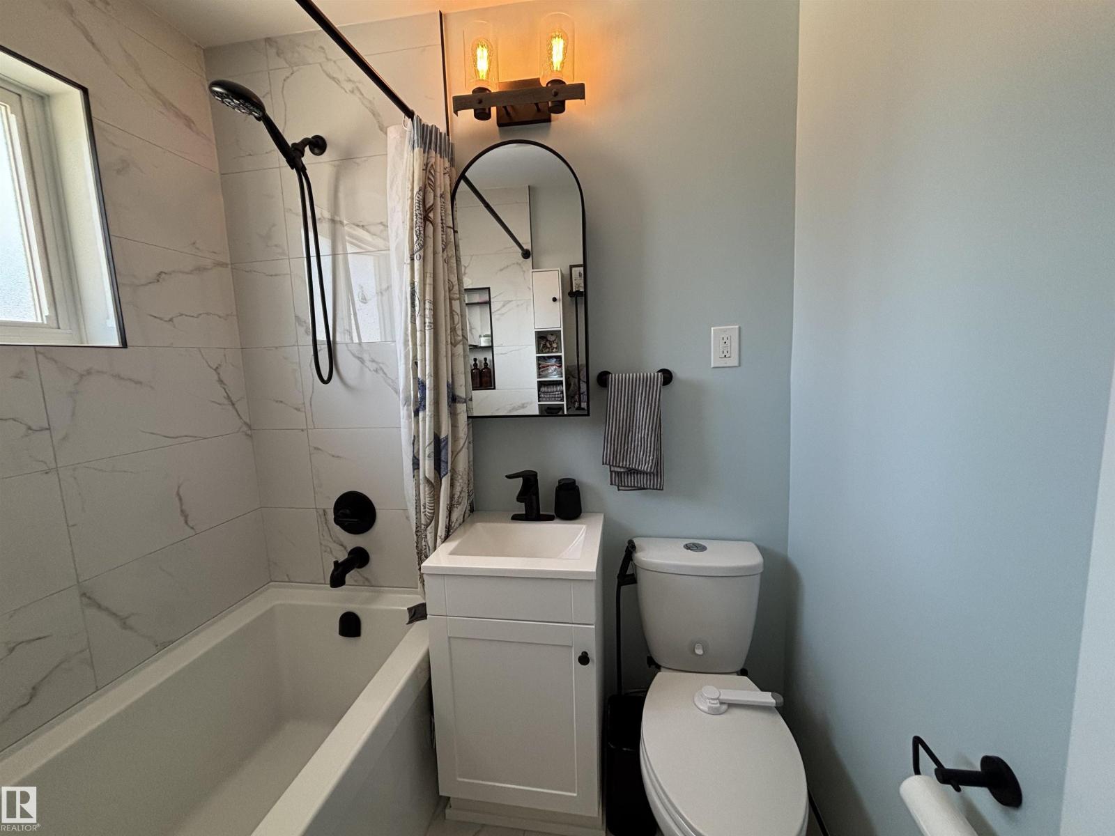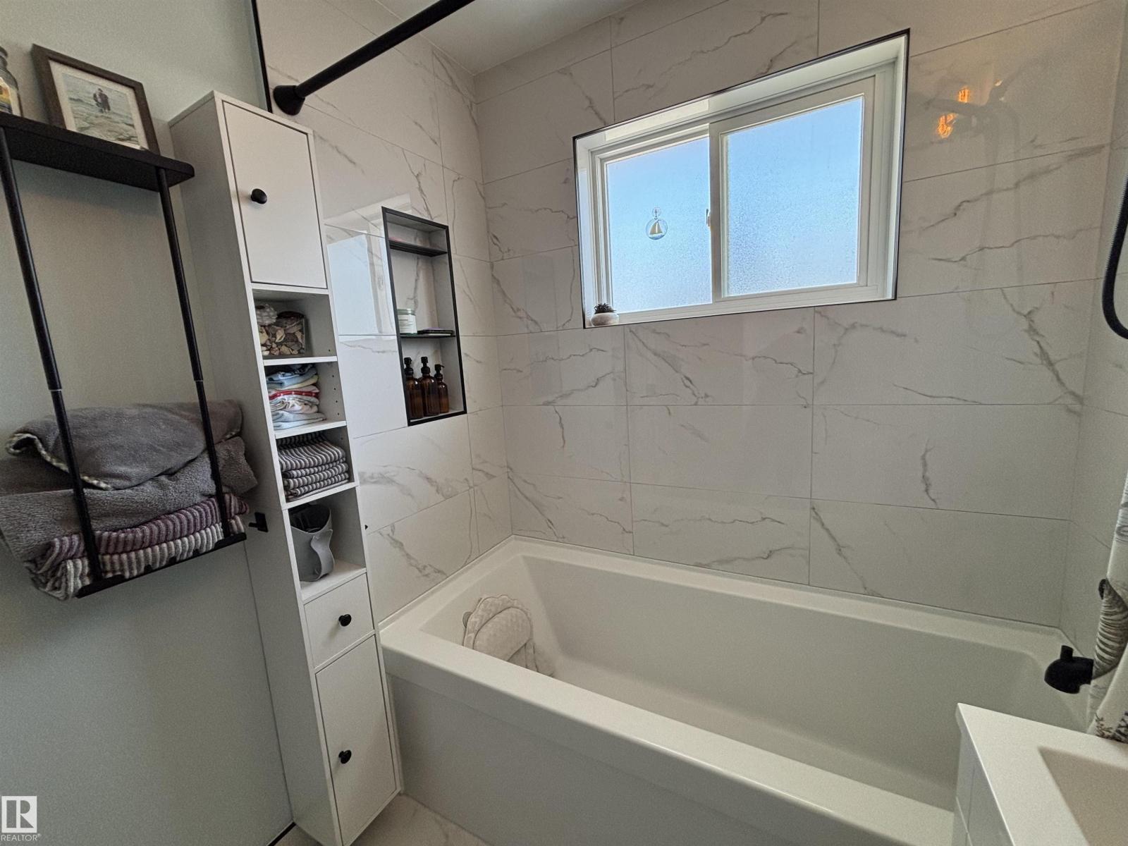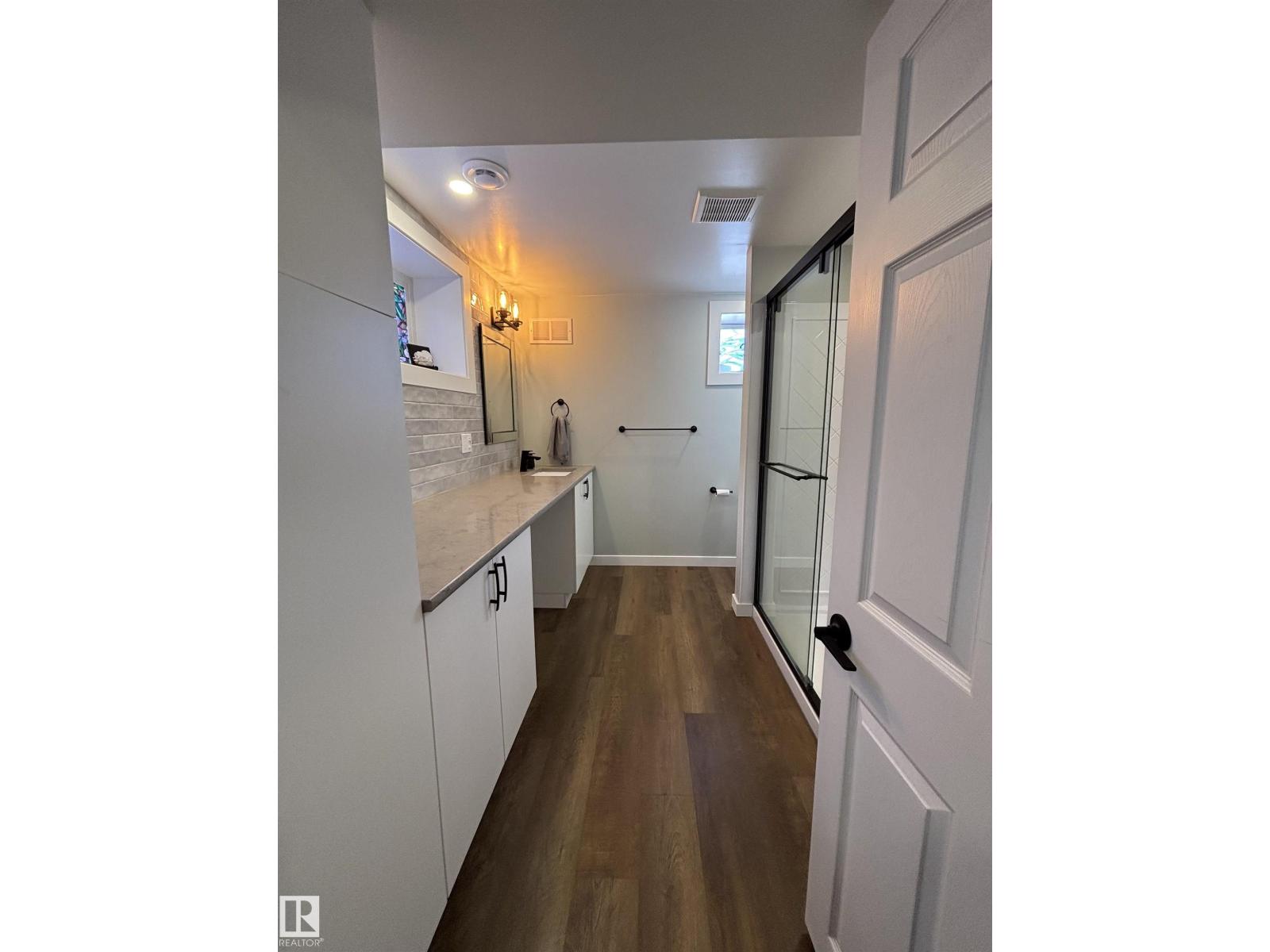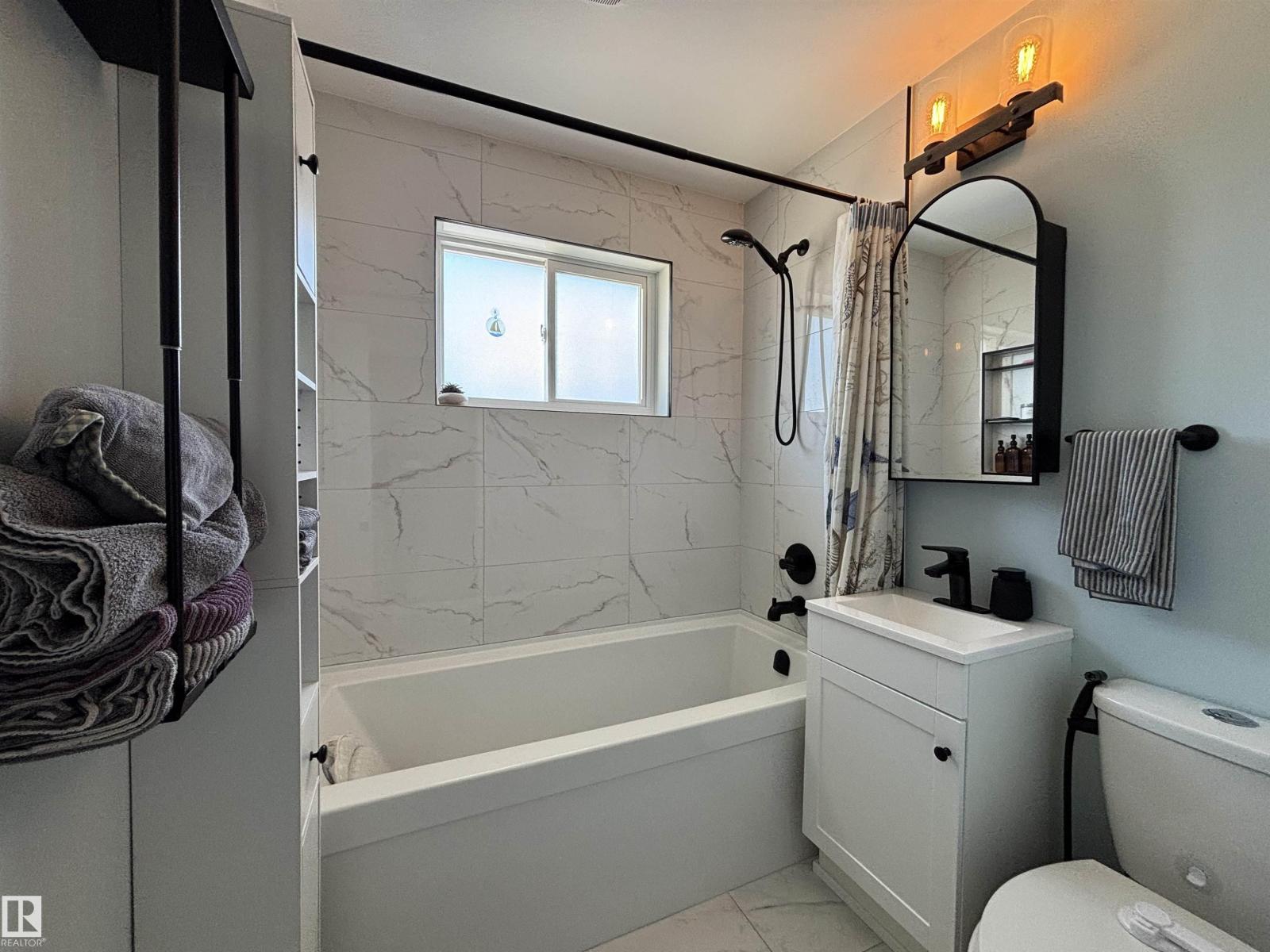 Welcome Home to this beautifully renovated bungalow located in Old Fort Saskatchewan! This home has been renovated top to bottom! The home has a gorgeous layout with 2 bedrooms on the main floor and another bedroom in the basement. The kitchen has gorgeous white cabinetry with beautiful quartz countertops and looks out to the spacious main floor living room! The main floor 4 piece bathroom is sure to impress with the gorgeous tile work, large tub and new vanity and toilet! The primary bedroom is a generous size and has a ton of windows for ample natural light! The basement is completely finished with a laundry area, rec room, 3 piece stunning bathroom, a bedroom and plenty of storage! The single detached garage is heated and the back fence is designed with a gate to allow for more parking options. The home is on a huge lot and fully fenced! There is even a natural gas line for the BBQ! The house and garage also have the soffit lighting which is excellent to light up the exterior. Great location!! (id:63190)