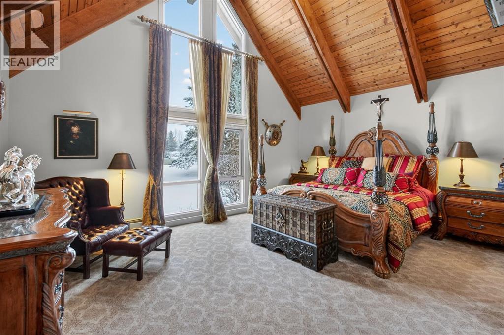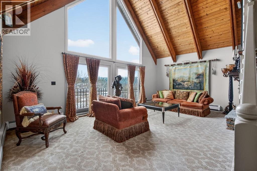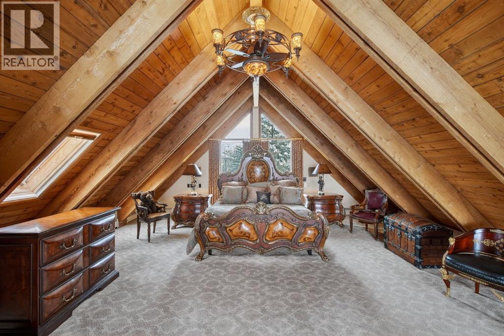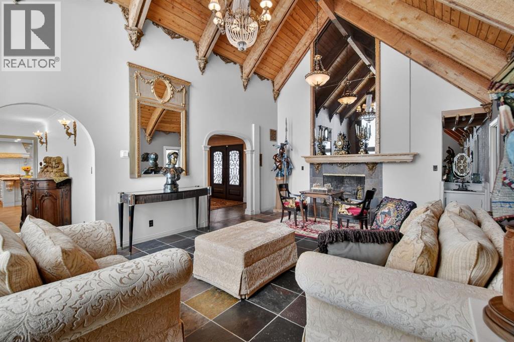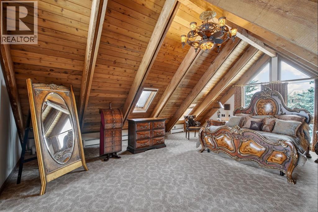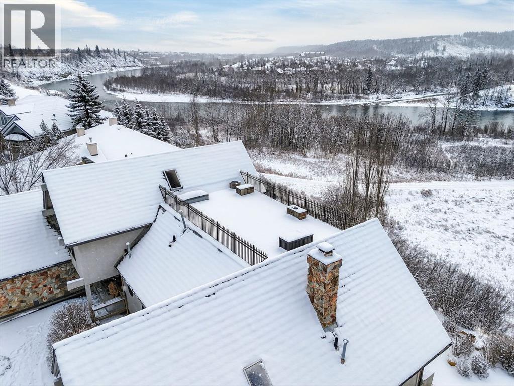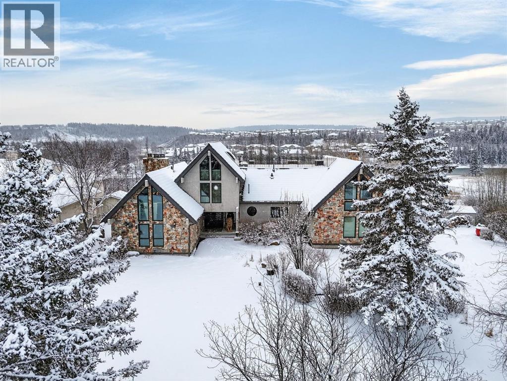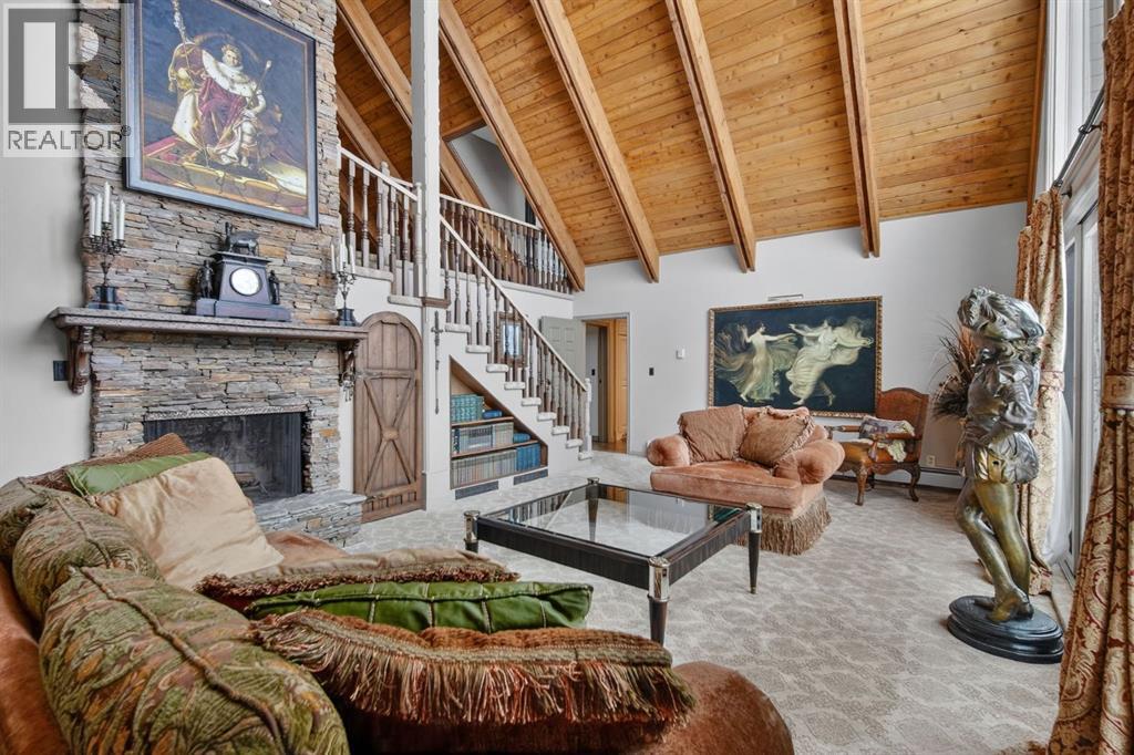This home makes an immediate grand impression, inviting and full of curb appeal. Set against a natural reserve and backing onto the Bow River, it offers exceptional views from nearly every room, with mountain vistas best enjoyed from the expansive deck.Inside, the home is warm and welcoming, with thoughtful upgrades throughout, including an updated kitchen, renovated bathrooms, newer windows, and roof shakes. The kitchen is designed for both everyday living and entertaining, seamlessly connecting to the main living areas. The formal dining room captures the views and opens into a vaulted living room featuring a wood burning fireplace.A versatile main floor bedroom with its own 4-piece bathroom, vaulted ceilings, and views of the mature front landscaping is ideal for guests or multi generational living.The primary suite offers a private retreat, complete with a cozy sitting area, fireplace, and elevated design that leads into the upper level bedroom space with a 5-piece ensuite. Two additional spacious bedrooms upstairs share a well appointed 4-piece bathroom.The walkout basement is built for entertaining, featuring a large family room with fireplace, a 2-piece bathroom, and an expansive flex area. There is also access to a library with its own 3-piece bathroom and a secret room tucked just off the library. (id:63190)