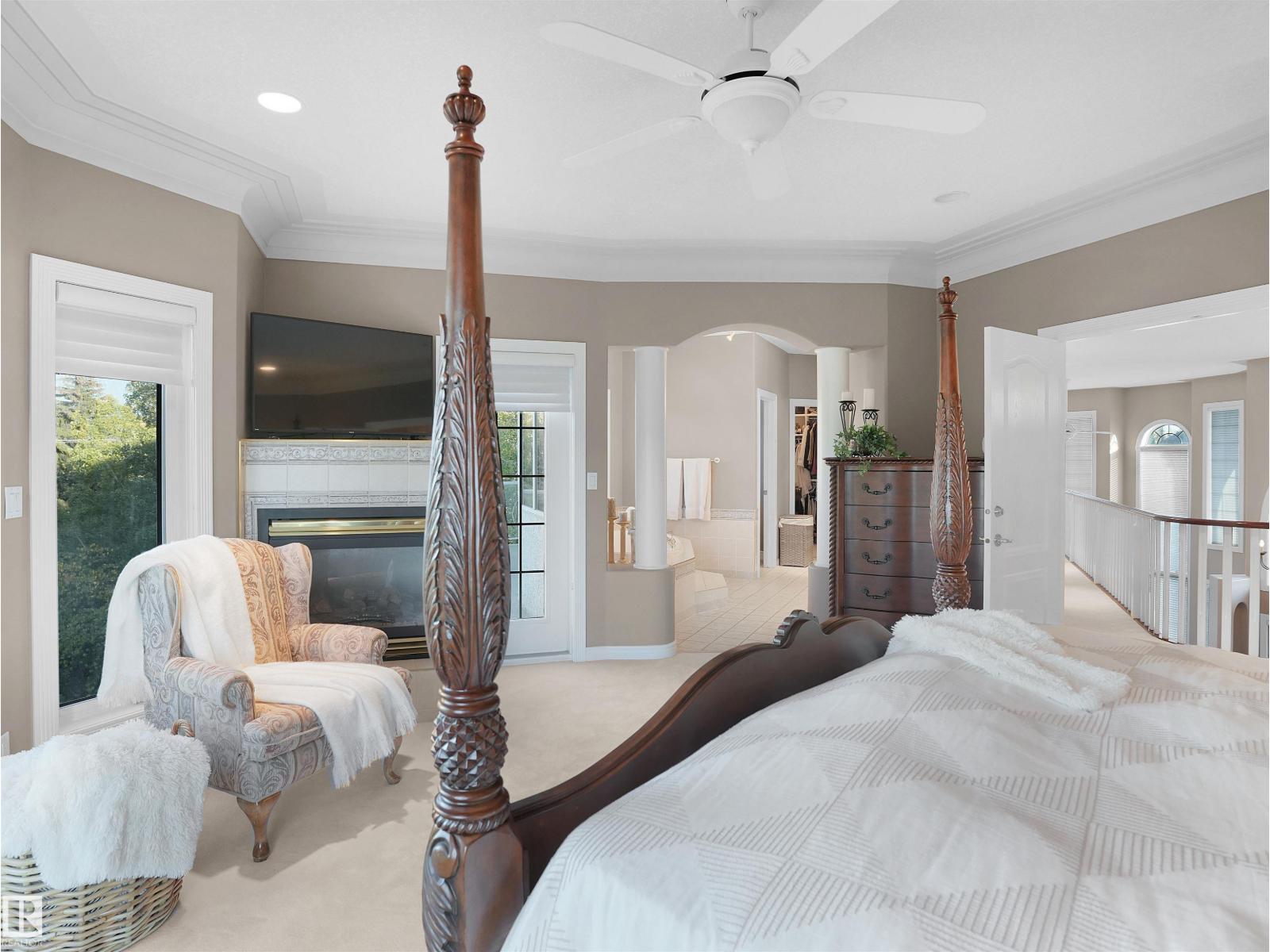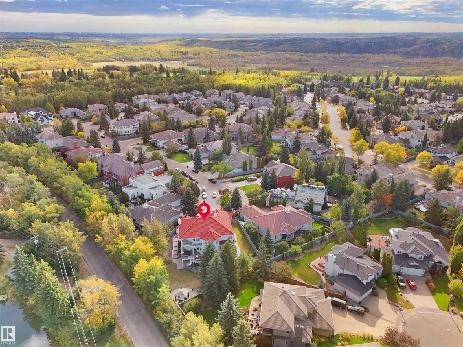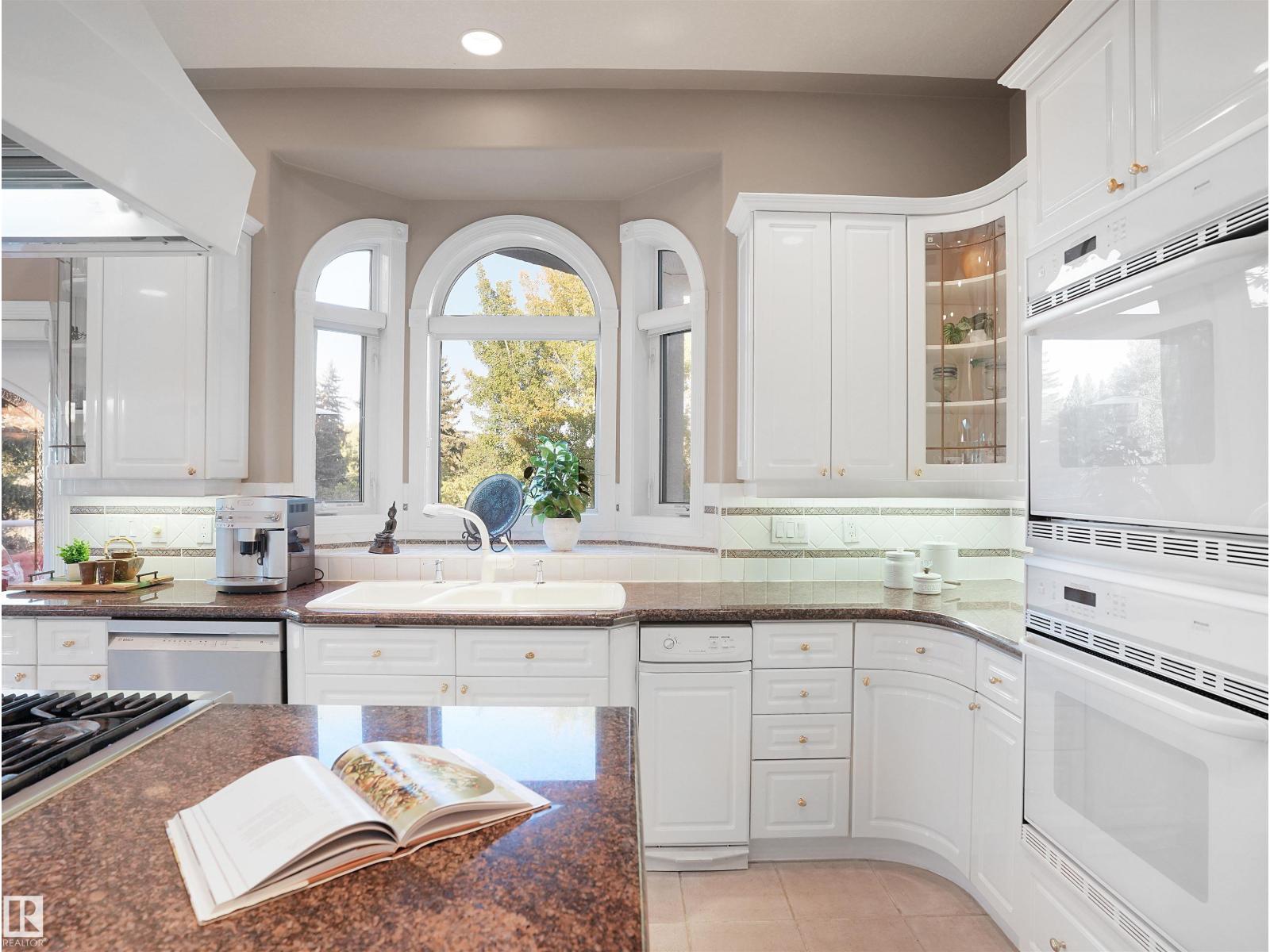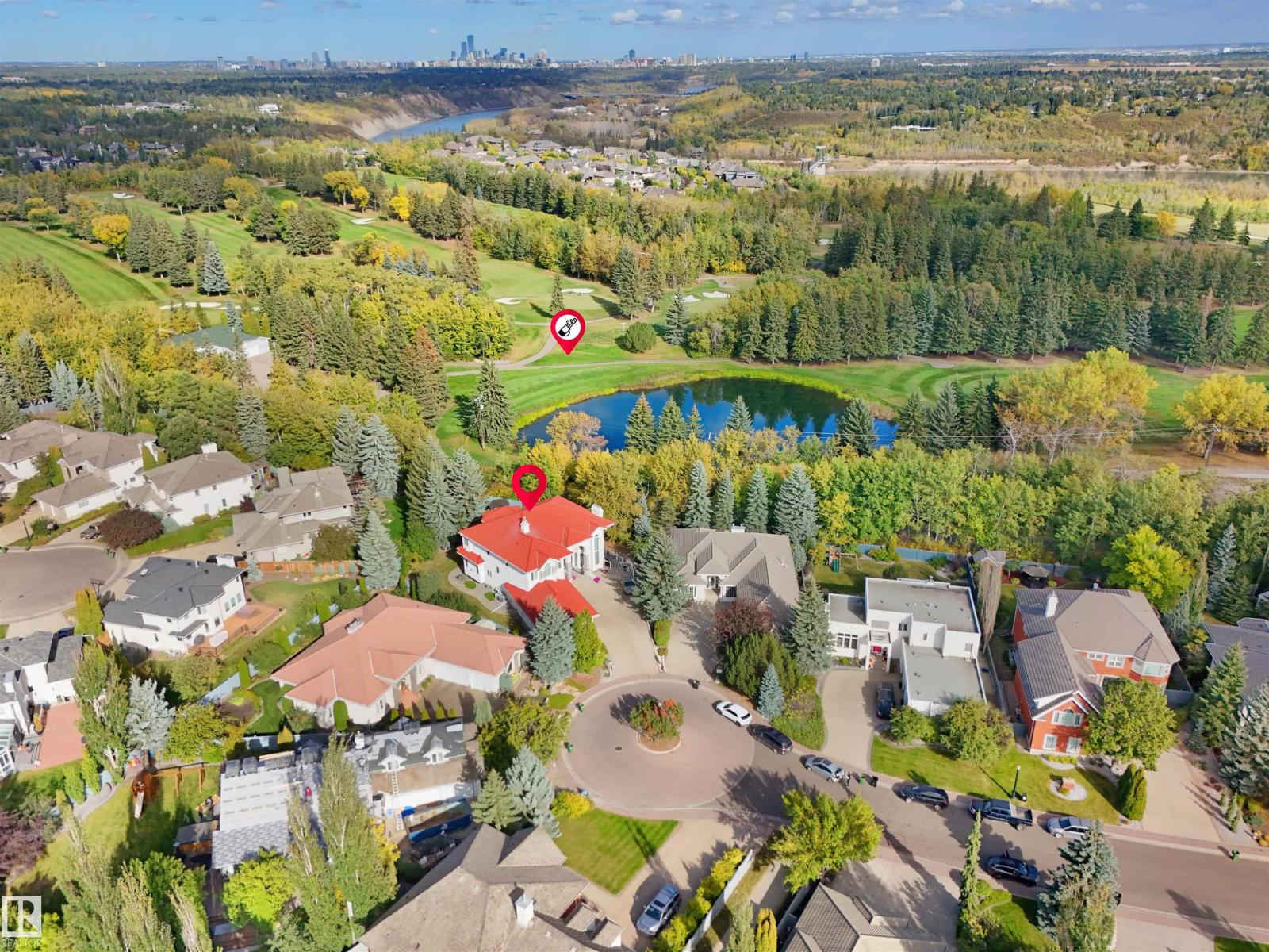 This elegant estate home is set within a prestigious country club, backing onto the golf course with breathtaking river valley views. Situated on a 1/3-acre lot, this custom walk-out offers approximately 6,500 sq. ft. of refined living space. A grand double staircase welcomes you into a home featuring 10’ ceilings, triple-pane windows, and a second private staircase. Enjoy formal living and family rooms with gas fireplaces, a private dining room, den, and loft. The gourmet kitchen showcases double wall ovens, gas cooktop, panelled refrigerator, dishwasher, granite countertops, and a spacious walk-in pantry. The luxurious primary suite features a fireplace, 6-piece ensuite, dual closets, and a private balcony overlooking the course. All five bedrooms include walk-in closets and ensuites. The fully finished walk-out basement offers a kitchenette, bedroom with ensuite, and in-floor heating. Complete with a triple garage, mature landscaping, two furnaces, two A/C units, and two hot water tanks. A must see !! (id:63190)