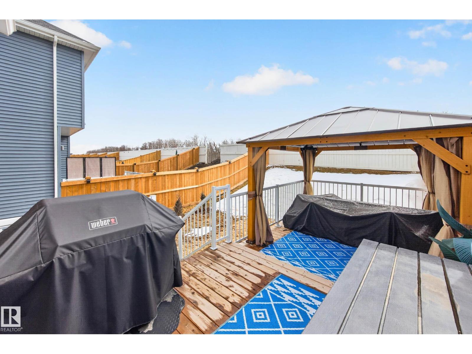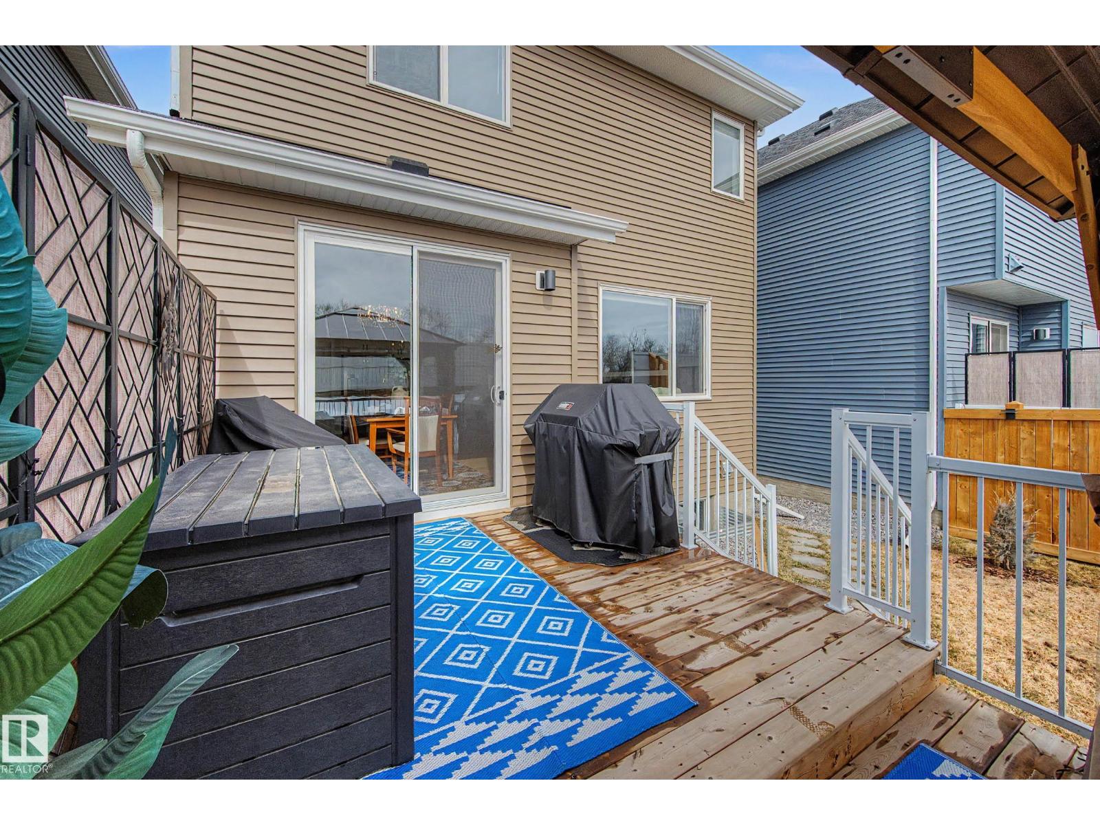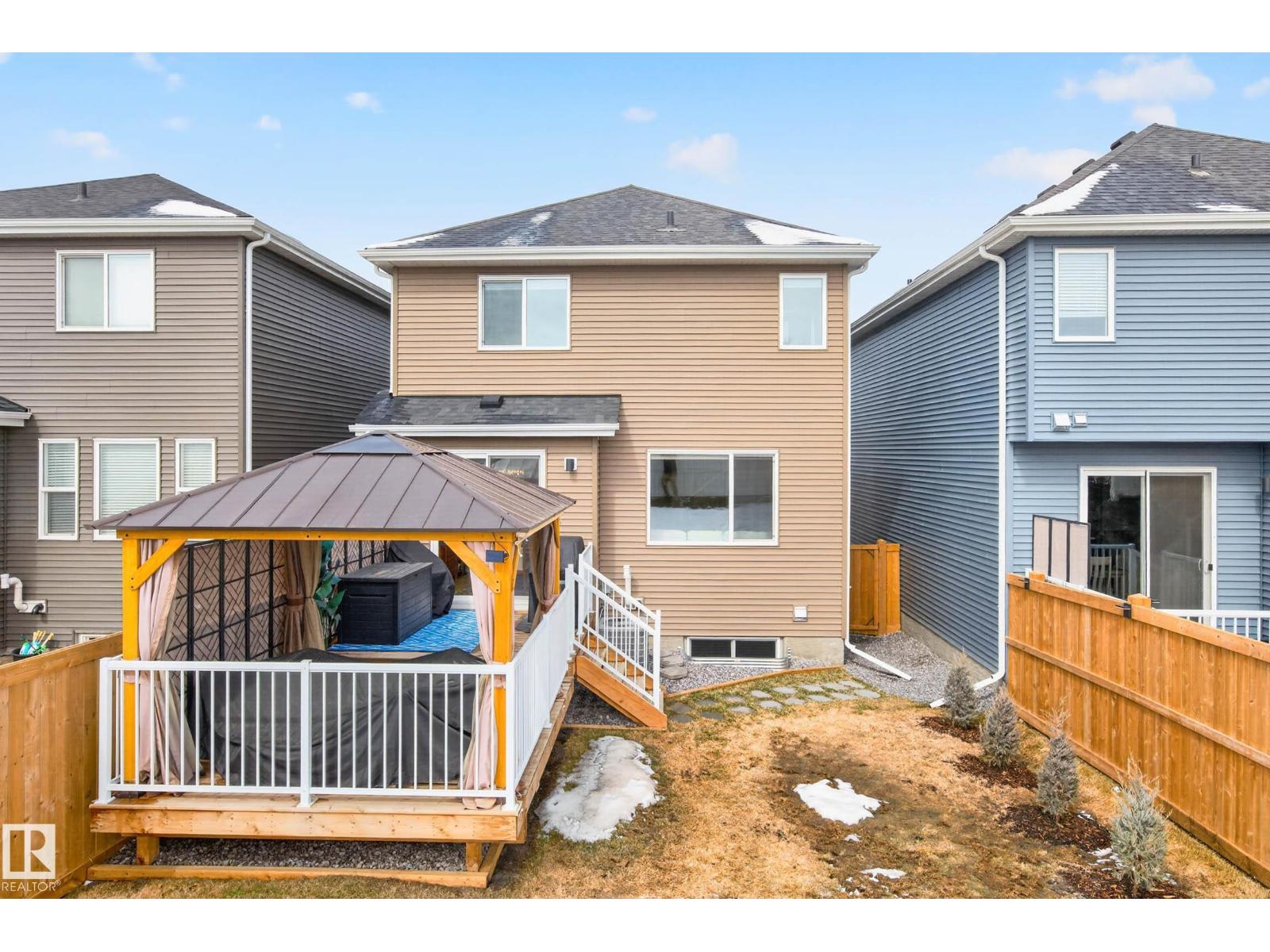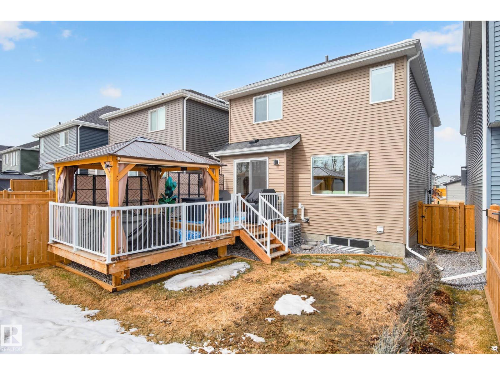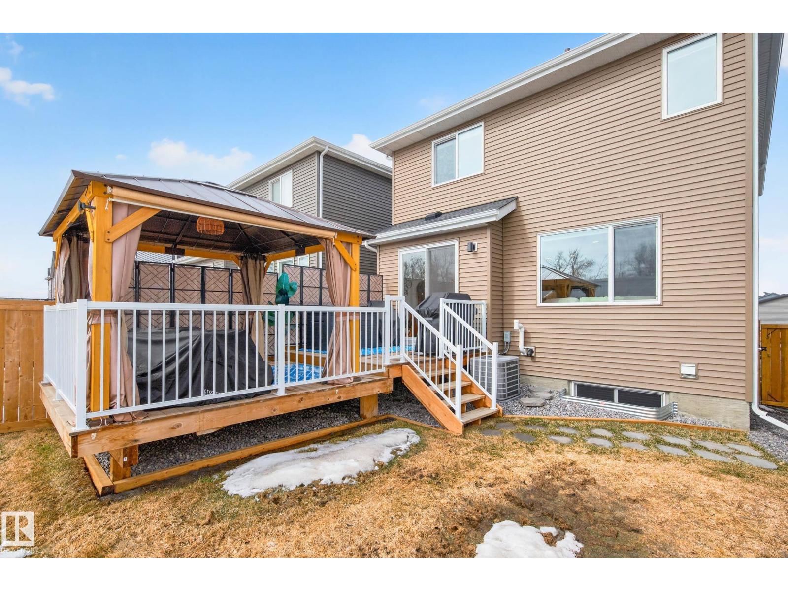 Welcome to this beautifully upgraded home nestled in the vibrant, family-friendly community of Southfork Leduc. Built by Homes By Avi w/extensive upgrades & exceptional pride of ownership. Designed for growing families & future flexibility as home features separate side entrance w/concrete sidewalk & plumbing rough-ins for a potential legal suite in 9’ basement. Step inside a bright, stylish interior where upgrades are immediately evident. Kitchen is functional & elegant, showcasing two-tone cabinetry, upgraded SS Bosh/LG appliances & lighting. Living room is warm & inviting, highlighted by a beautifully tiled fireplace & custom blinds that add a polished, designer finish. Upstairs, you’ll find added touches like iron spindle railings, den, laundry room & WIC's in each bdrm. Extra-large, 2-tier deck (w/weed barrier), gazebo & rock features complete professionally landscaped/fenced yard. Permanent gemstone lighting & Central A/C for added convenience. Nestle your family in this home that is INCREDIBLE! (id:63190)